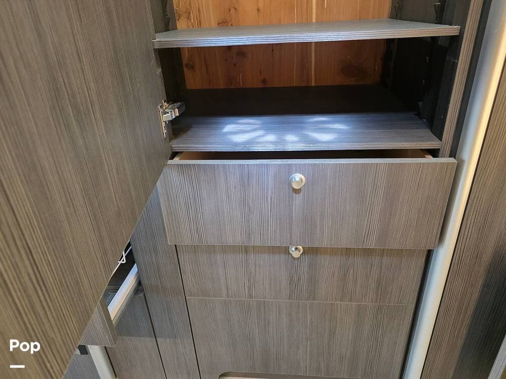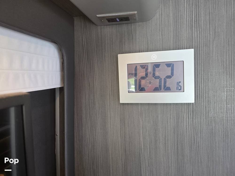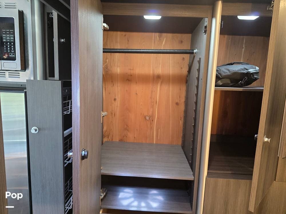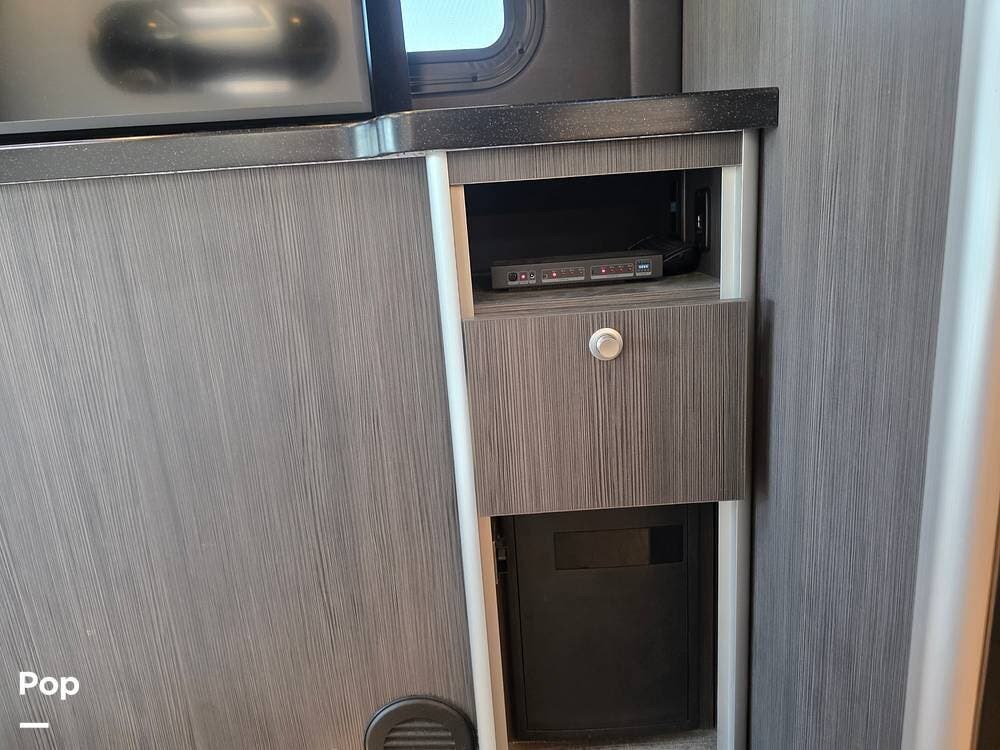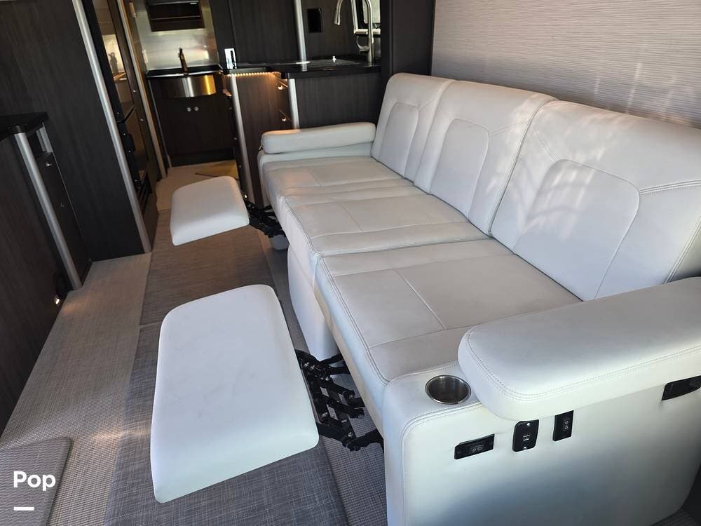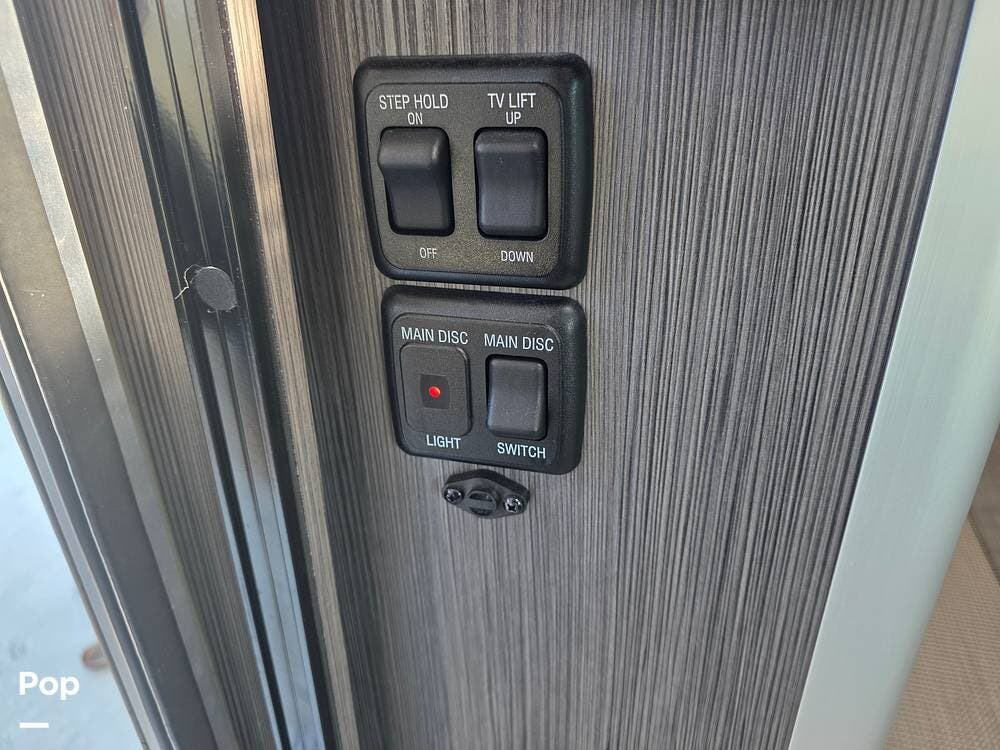 Entertainment is always available thanks to the retractable Samsung Smart TV, Bluetooth audio system, and satellite-ready setup. Outside, you'll find a powered awning with integrated LED lighting, power stabilizer jacks for quick setup, and a backup camera for safer parking.