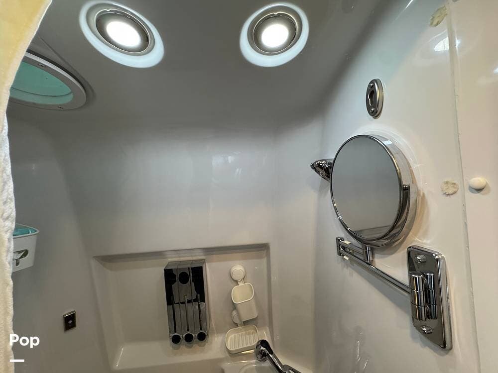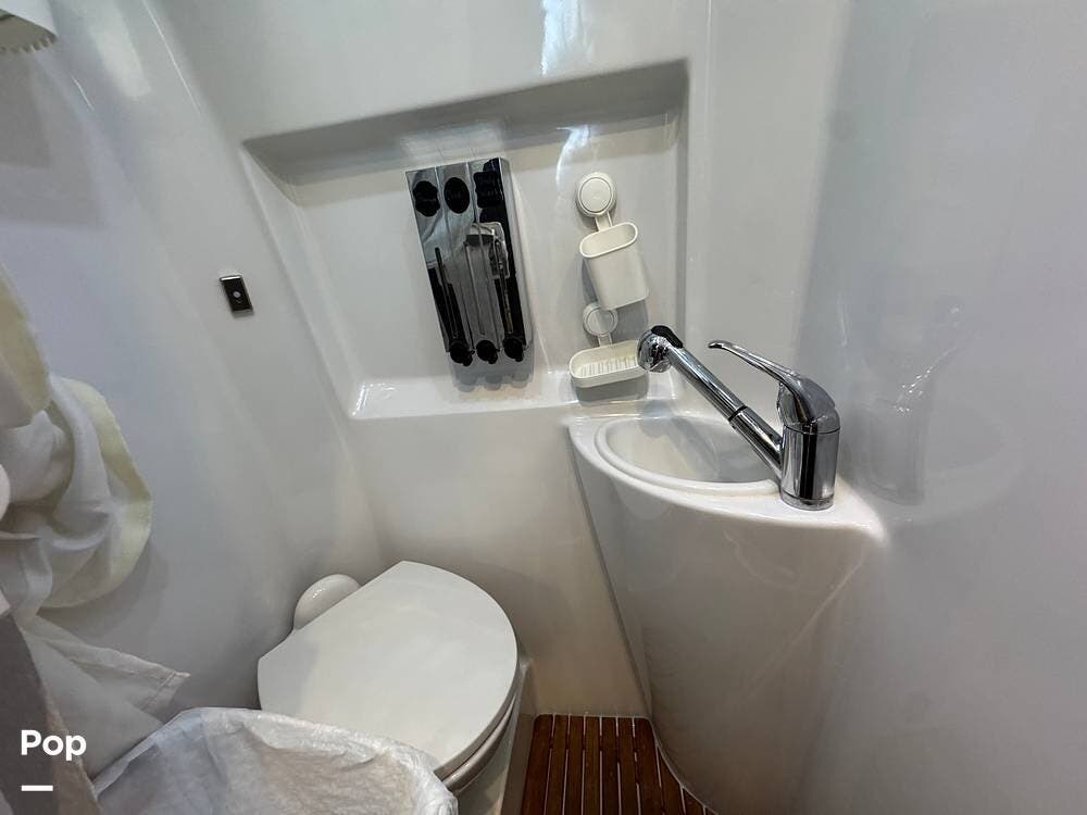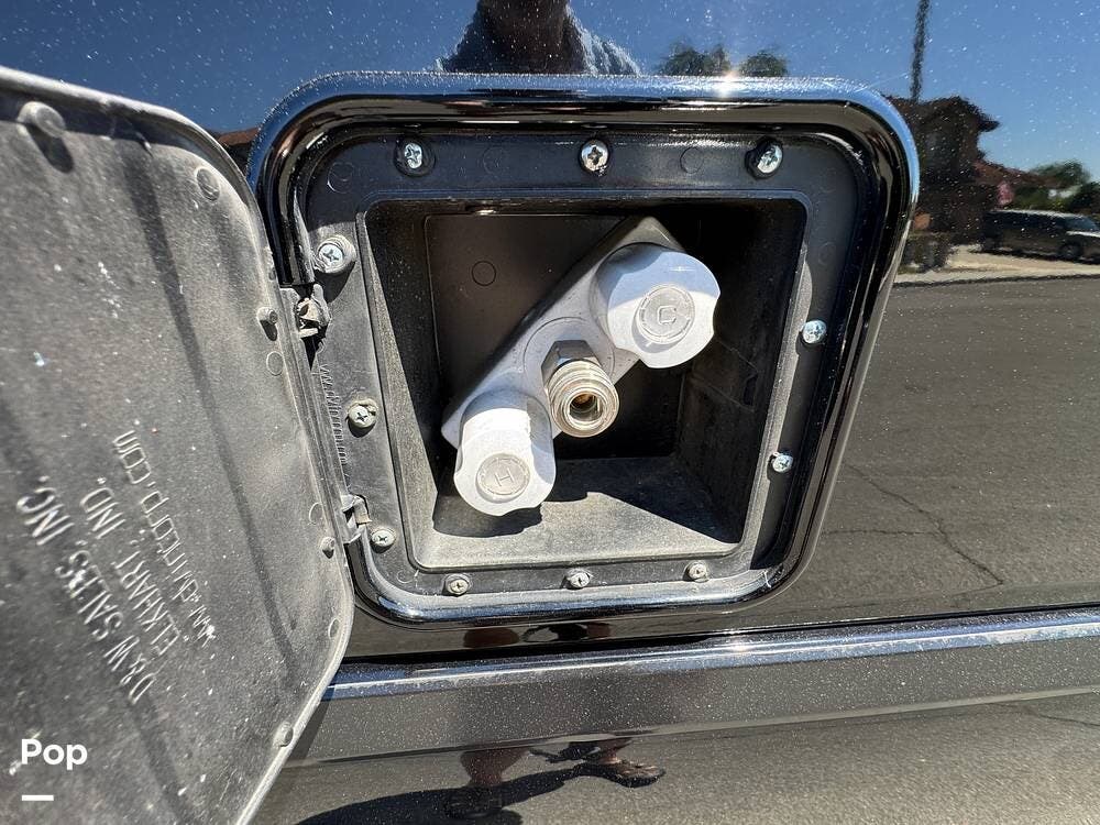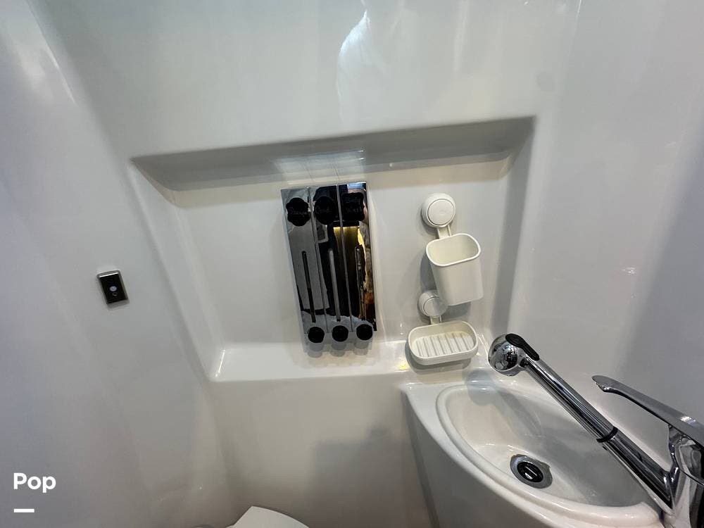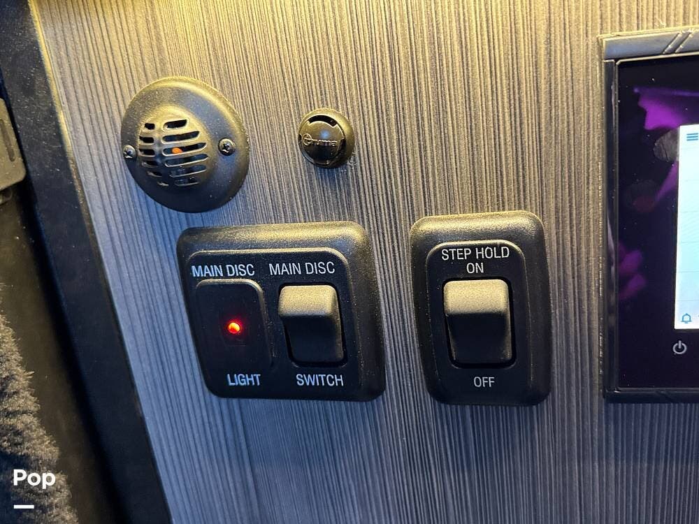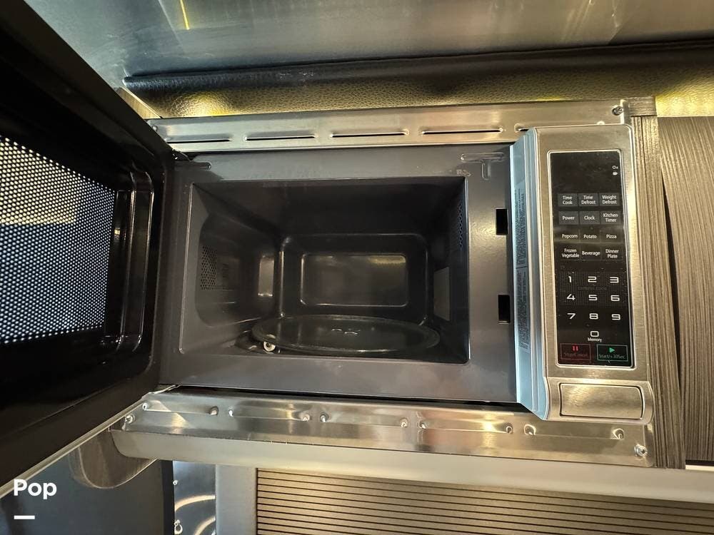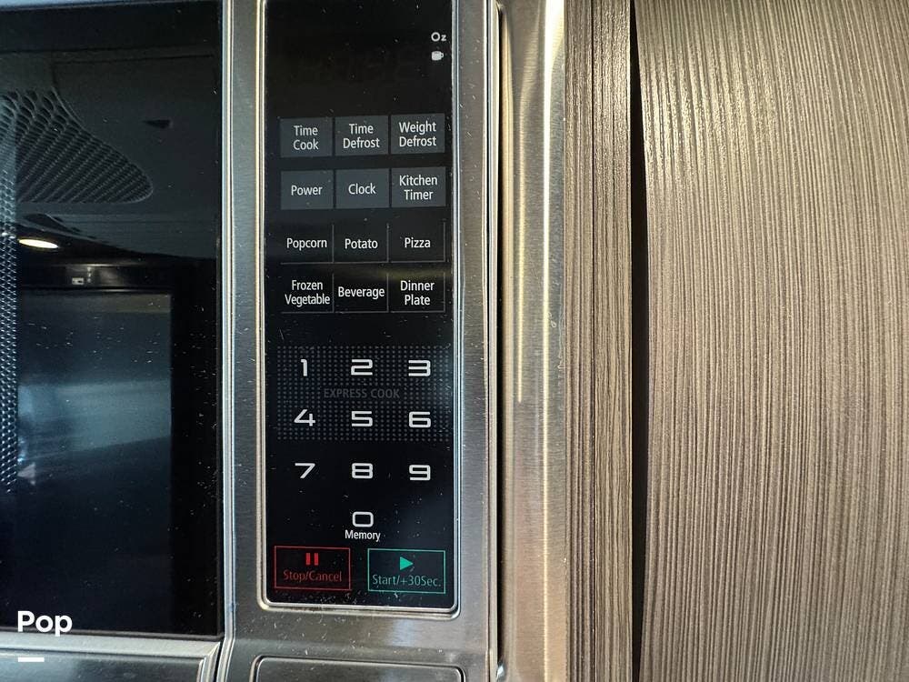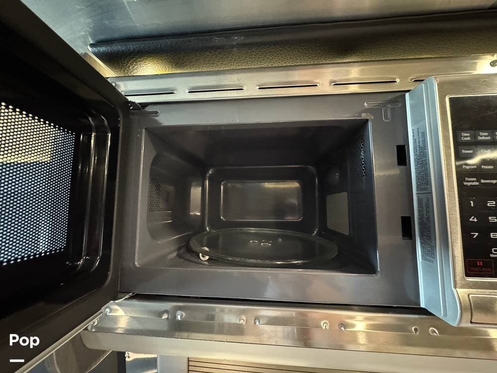 Inside the coach, the upscale galley features a Corian countertop, stainless steel sink, and a covered cooktop, while the wet bath includes a macerator toilet for convenience and easy dumping at any RV park.