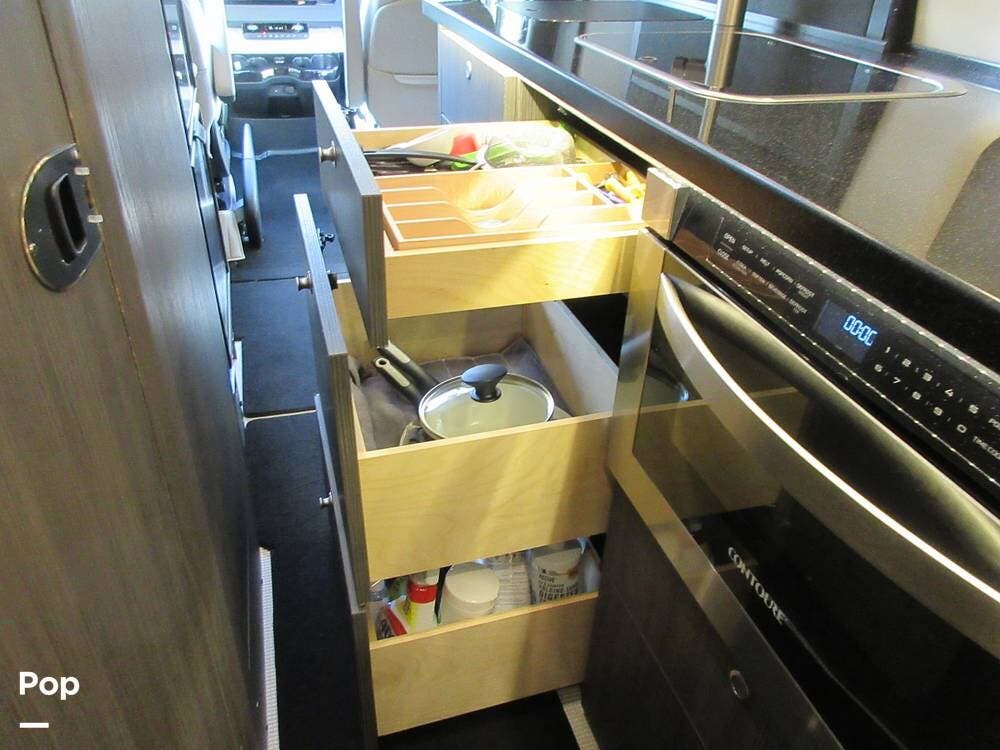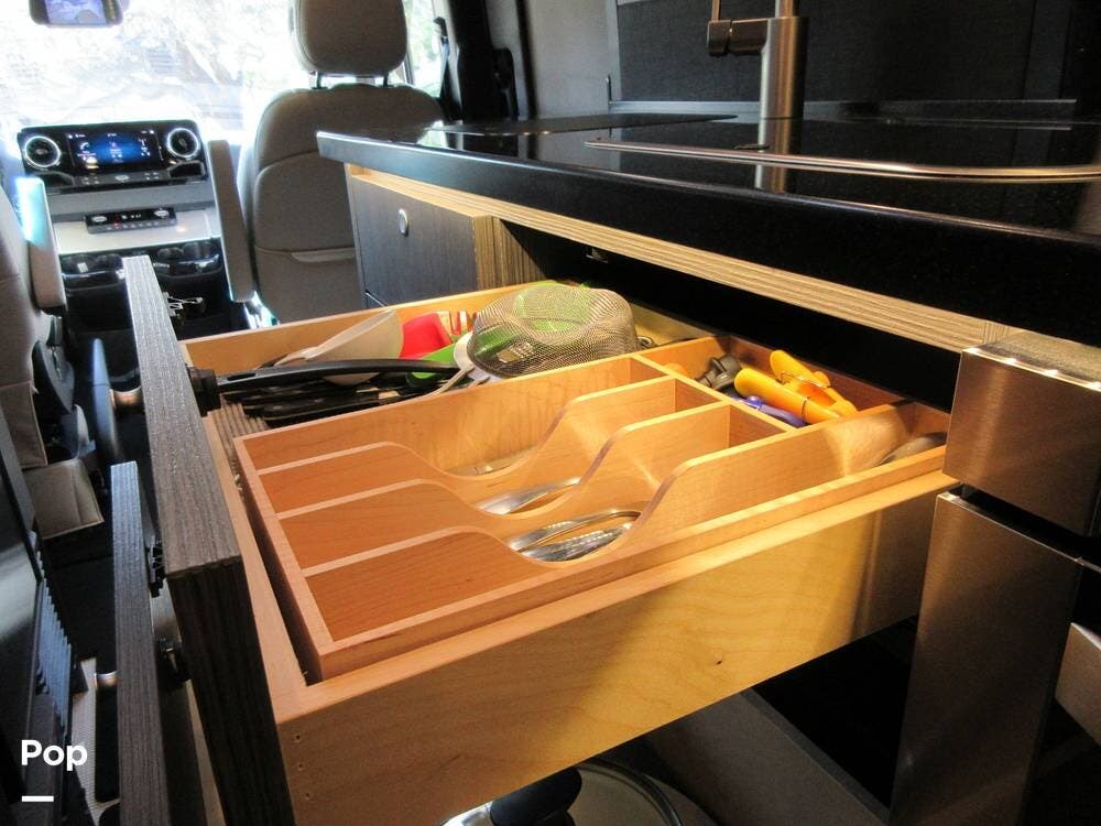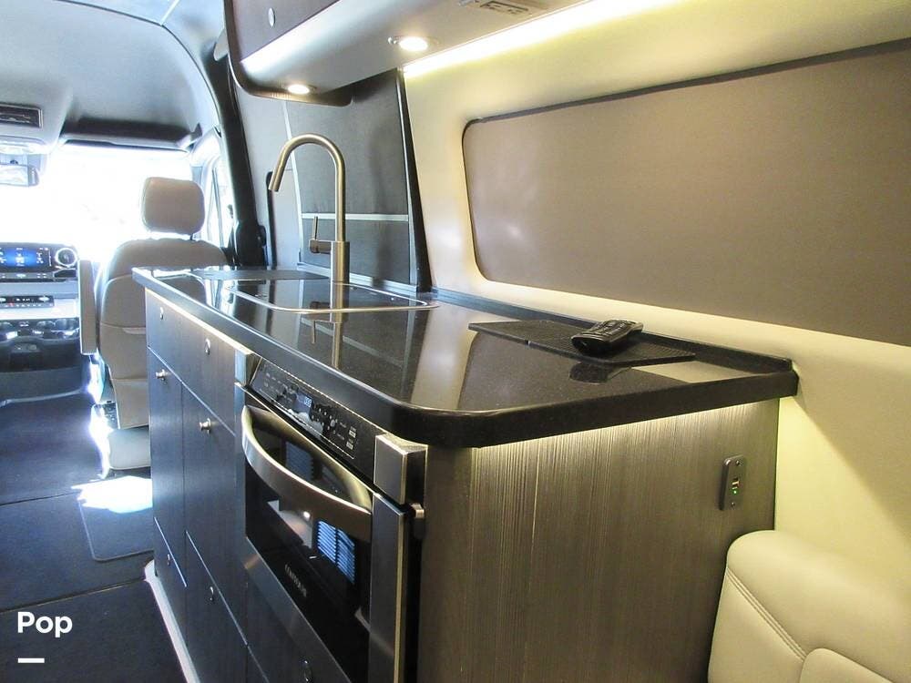 If you get hungry or thirsty, this Interstate has all the tools you need to create your favorite meal. There is a refrigerator/freezer, a two-burner stove, and a microwave oven. If you want entertainment, you've got two Widescreen TVs, a BOSE TV speaker in the rear, the MBUX Infotainment dash system (Mercedes-Benz User Experience) with touchscreen, pinch, zoom, voice recognition, Apple CarPlay, Android capability, and quality speakers throughout the cabin.