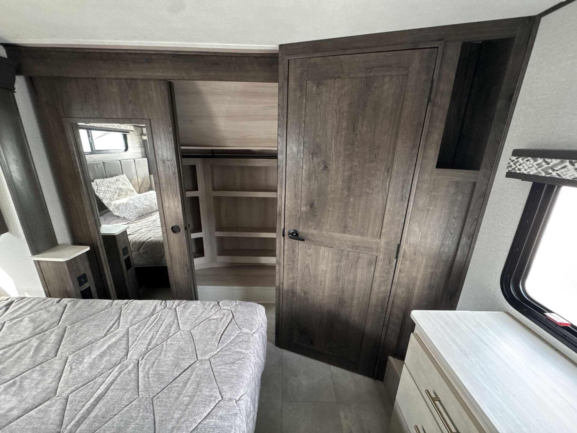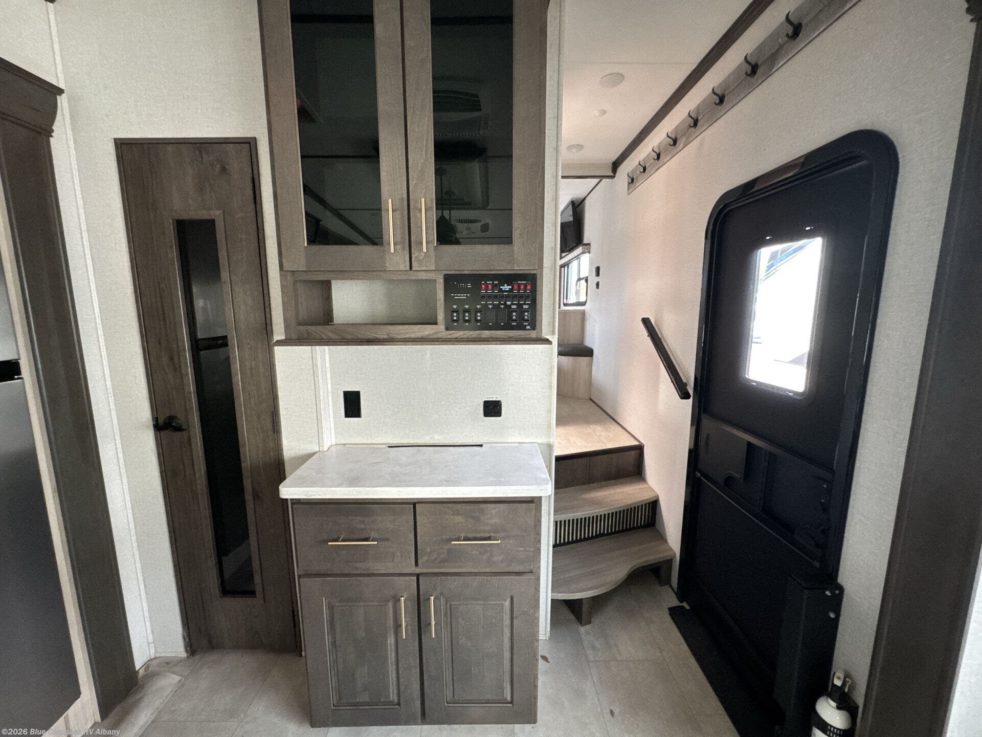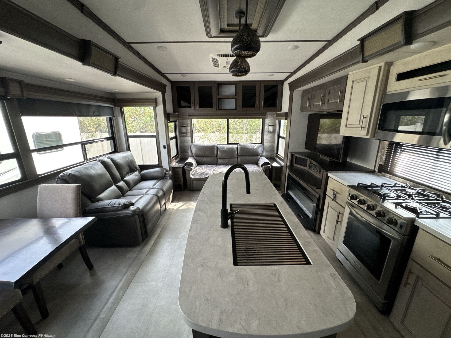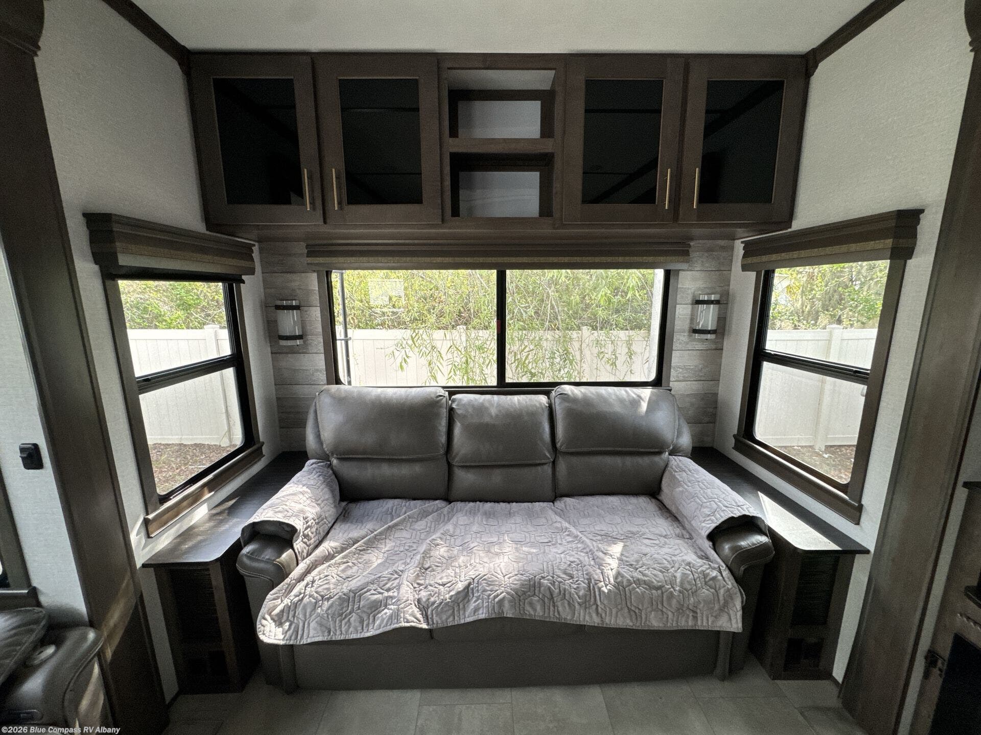 You will be amazed by this Paradigm fifth wheel for all of the amenities that make full-time living such an easy task! The kitchen has been prepped for a dishwasher, and the opposing slides create lots of room for you to work around the island. The sleeper sofa has flip-up end tables on either side, and you will find additional seating on the dual recliner love seat and the floating dinette table with chairs. The master bedroom is phenomenal with its walk-in closet, flip-top dresser, seat with storage, Smart TV, and king bed slide. The dimmable LED lighting is going to let you customize the brightness level all throughout your unit, and the under-step shoe storage is another example of the great storage capabilities.