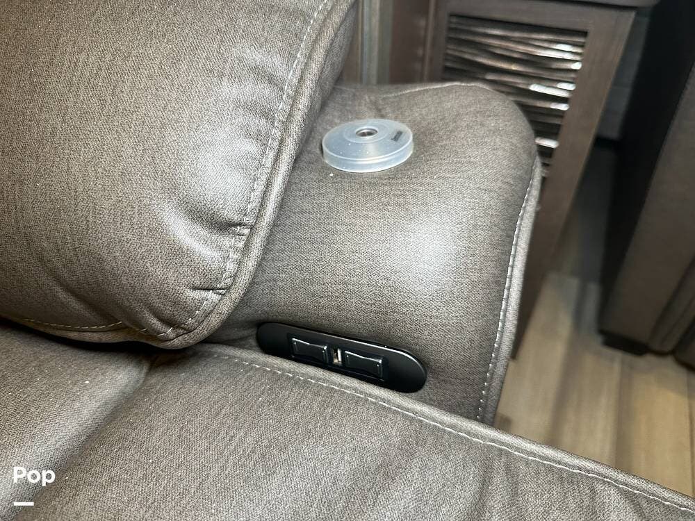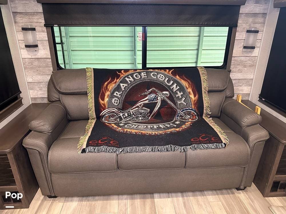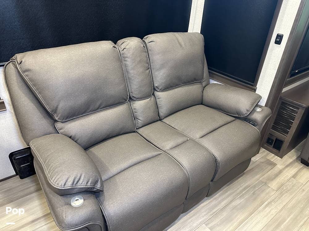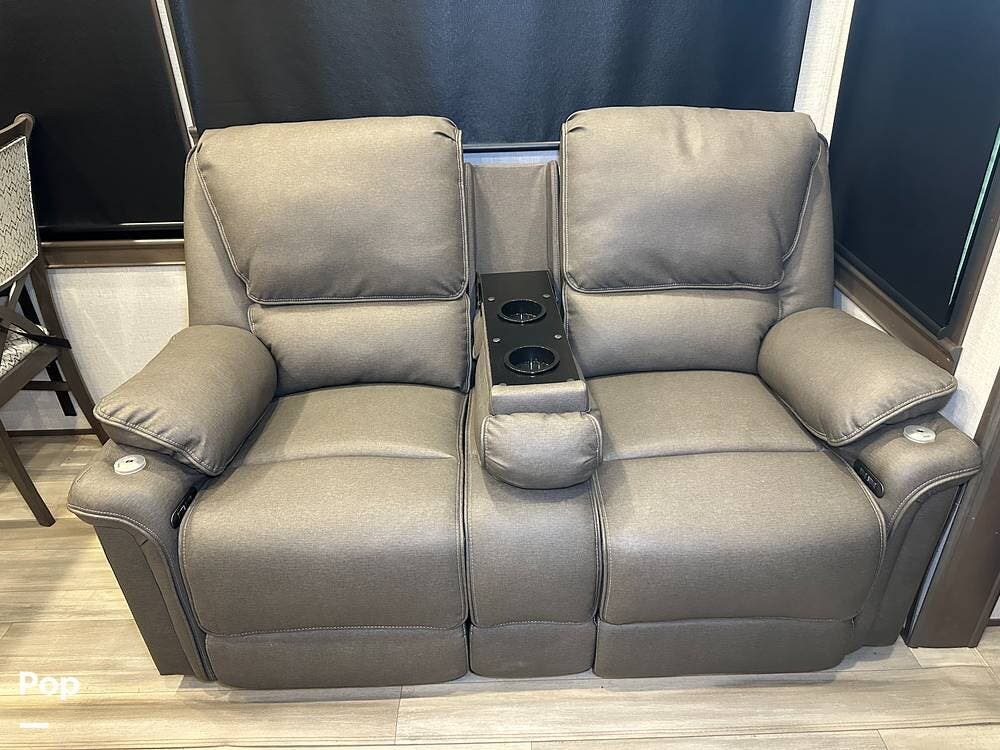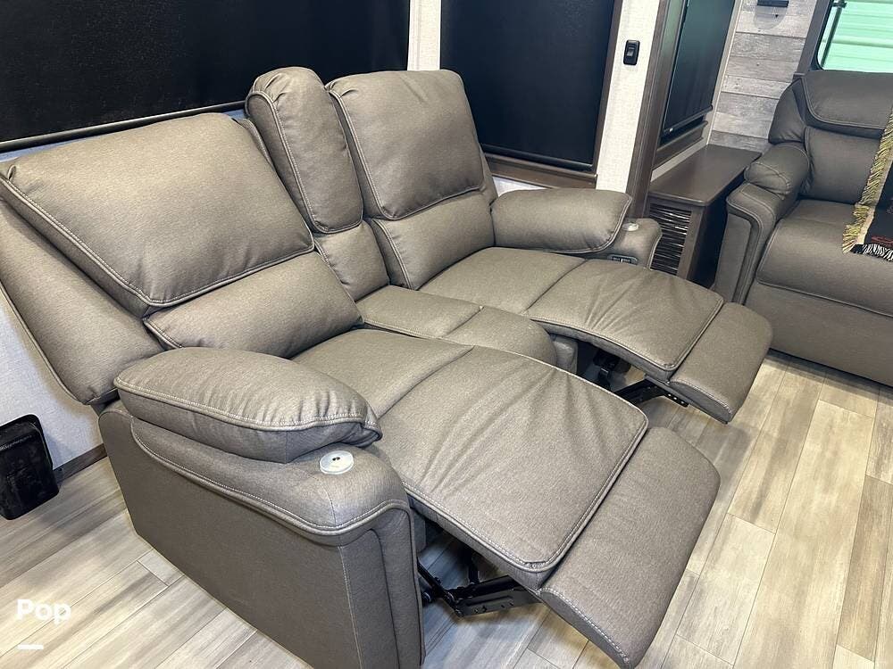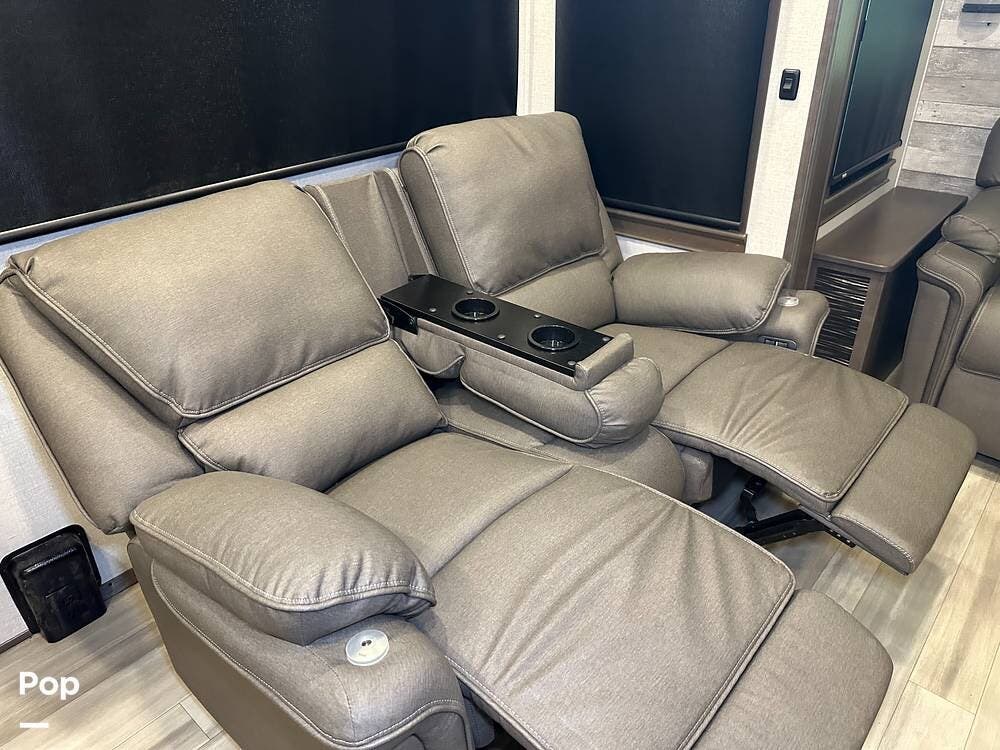 This luxurious RV features a spacious rear living area with dual opposing slides, providing ample space for comfort and entertainment. Relax on the dual recliner loveseat, enjoy the warmth of the fireplace, or watch your favorite shows on the 50" Smart TV. Behind the TV, you'll find hidden pantry storage, maximizing space while keeping your essentials within reach.