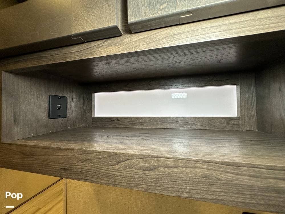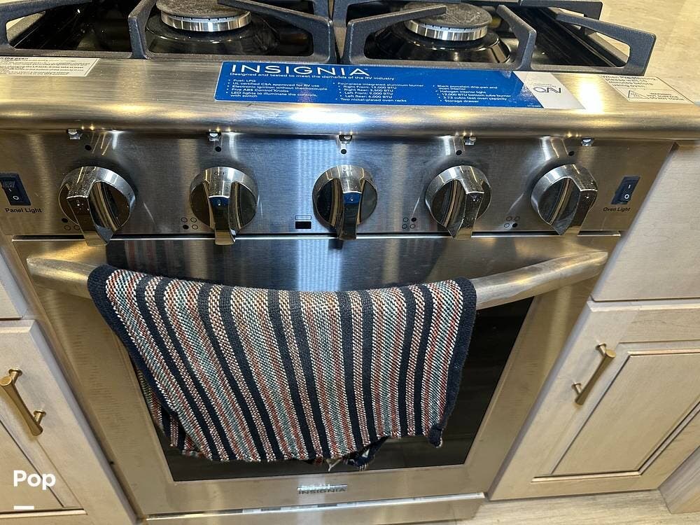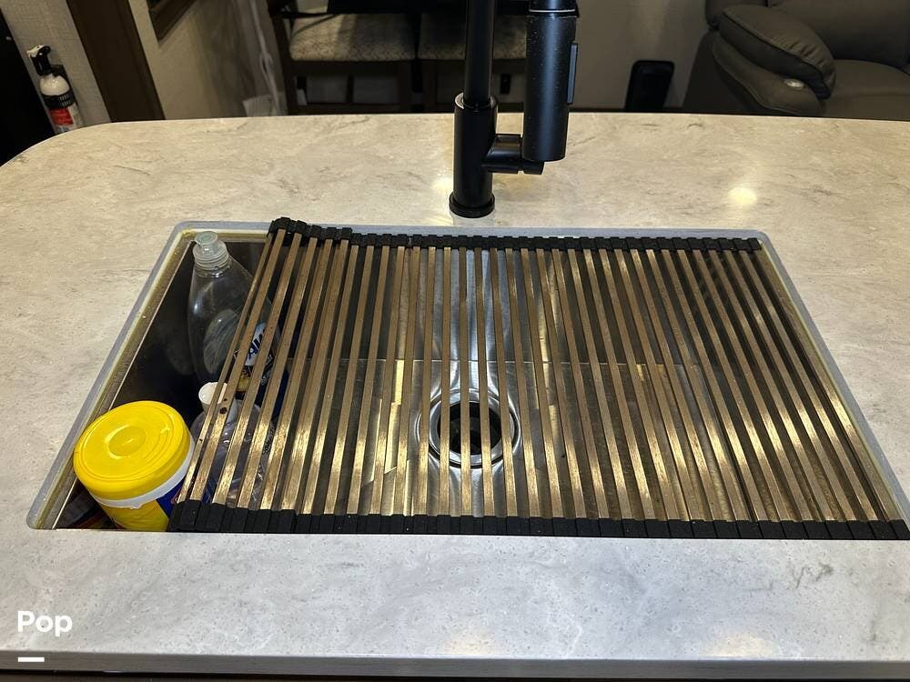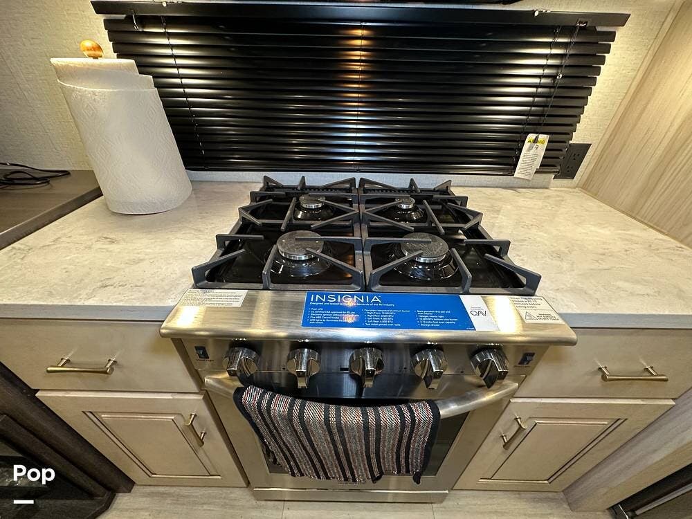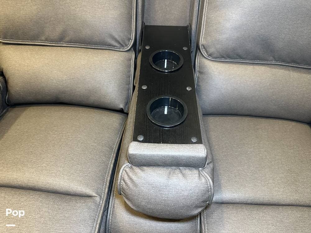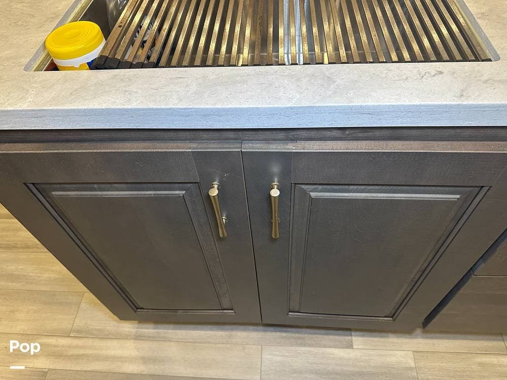 This luxurious RV features a spacious rear living area with dual opposing slides, providing ample space for comfort and entertainment. Relax on the dual recliner loveseat, enjoy the warmth of the fireplace, or watch your favorite shows on the 50" Smart TV. Behind the TV, you'll find hidden pantry storage, maximizing space while keeping your essentials within reach.