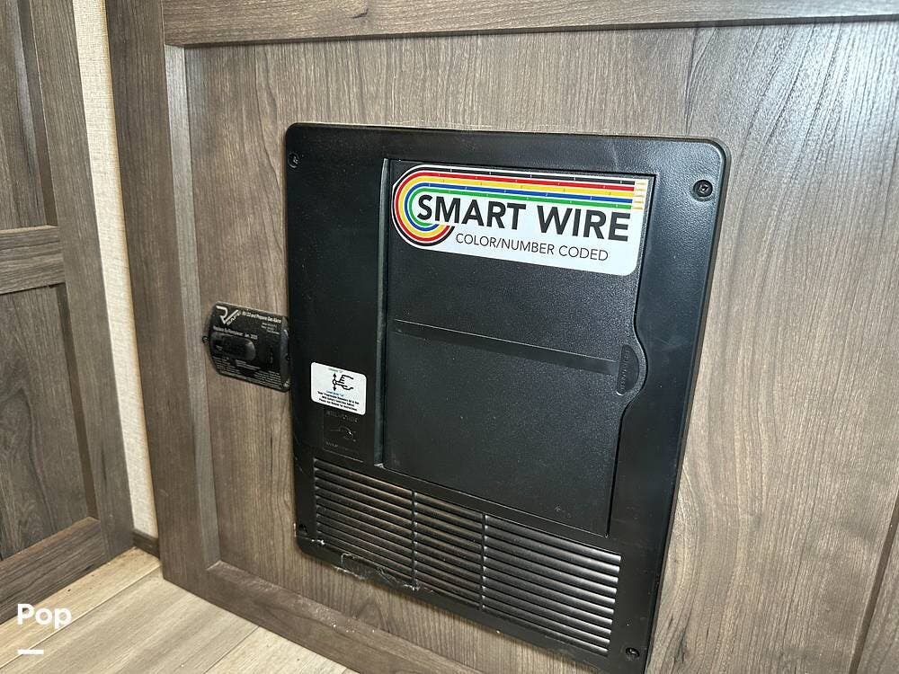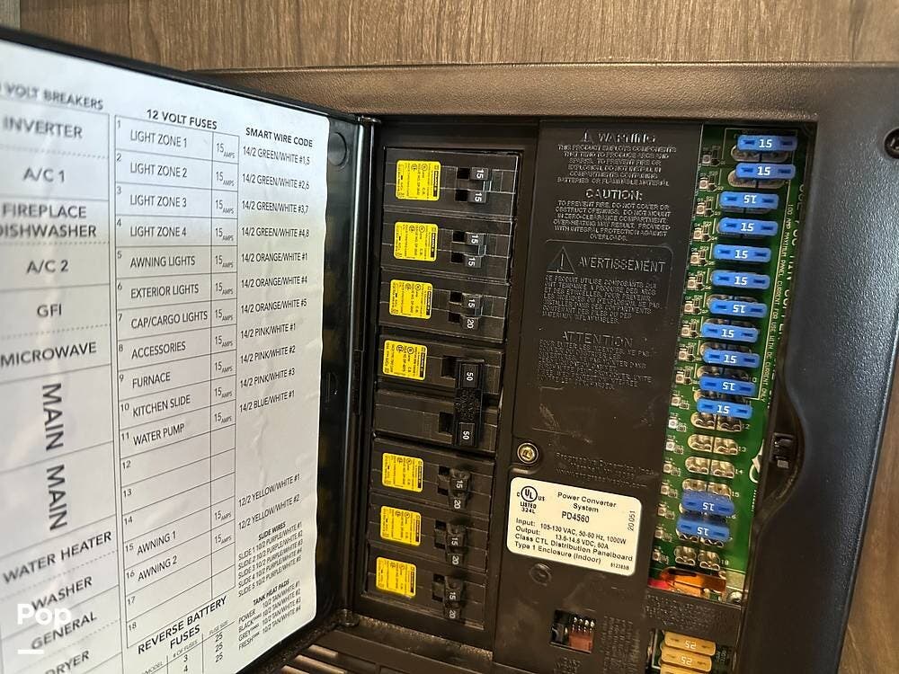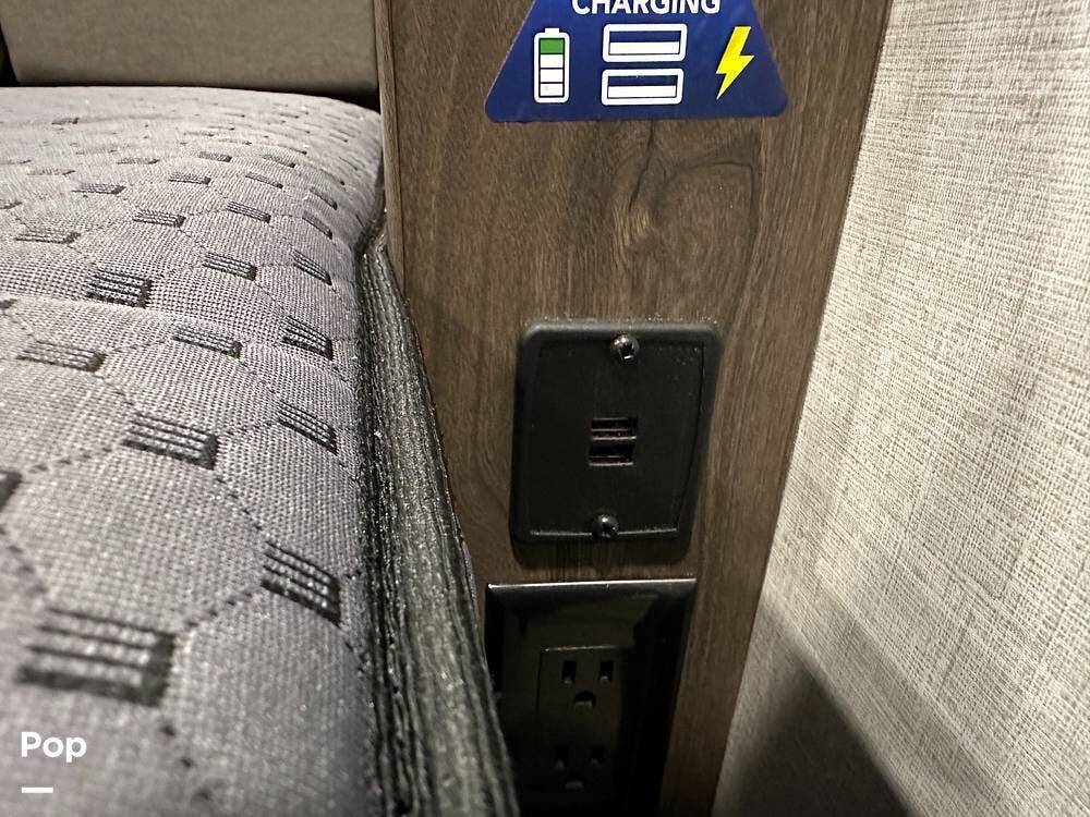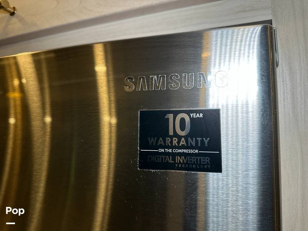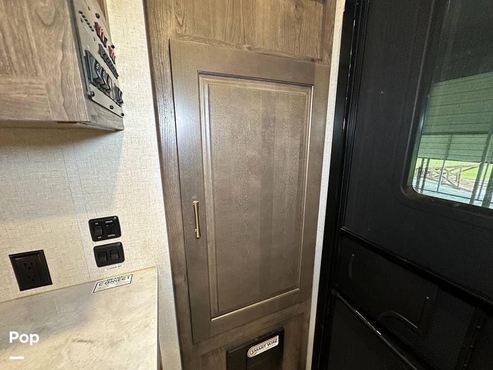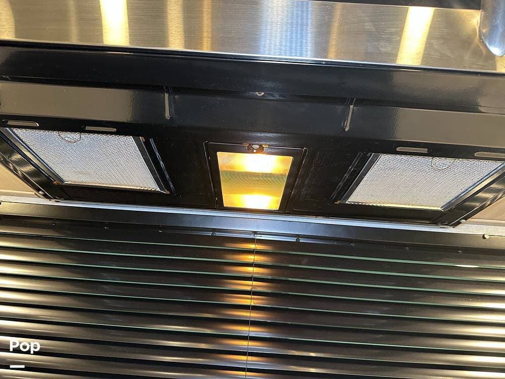 This luxurious RV features a spacious rear living area with dual opposing slides, providing ample space for comfort and entertainment. Relax on the dual recliner loveseat, enjoy the warmth of the fireplace, or watch your favorite shows on the 50" Smart TV. Behind the TV, you'll find hidden pantry storage, maximizing space while keeping your essentials within reach.