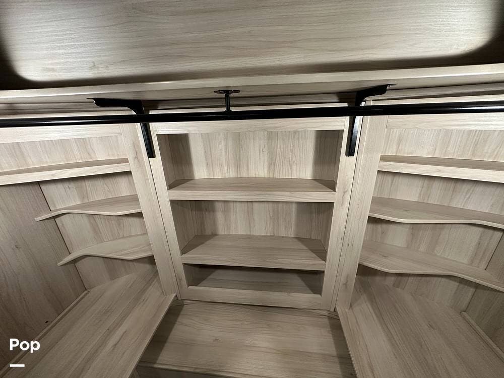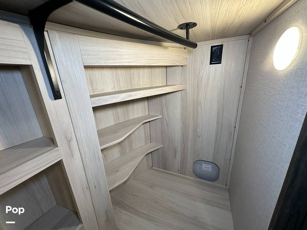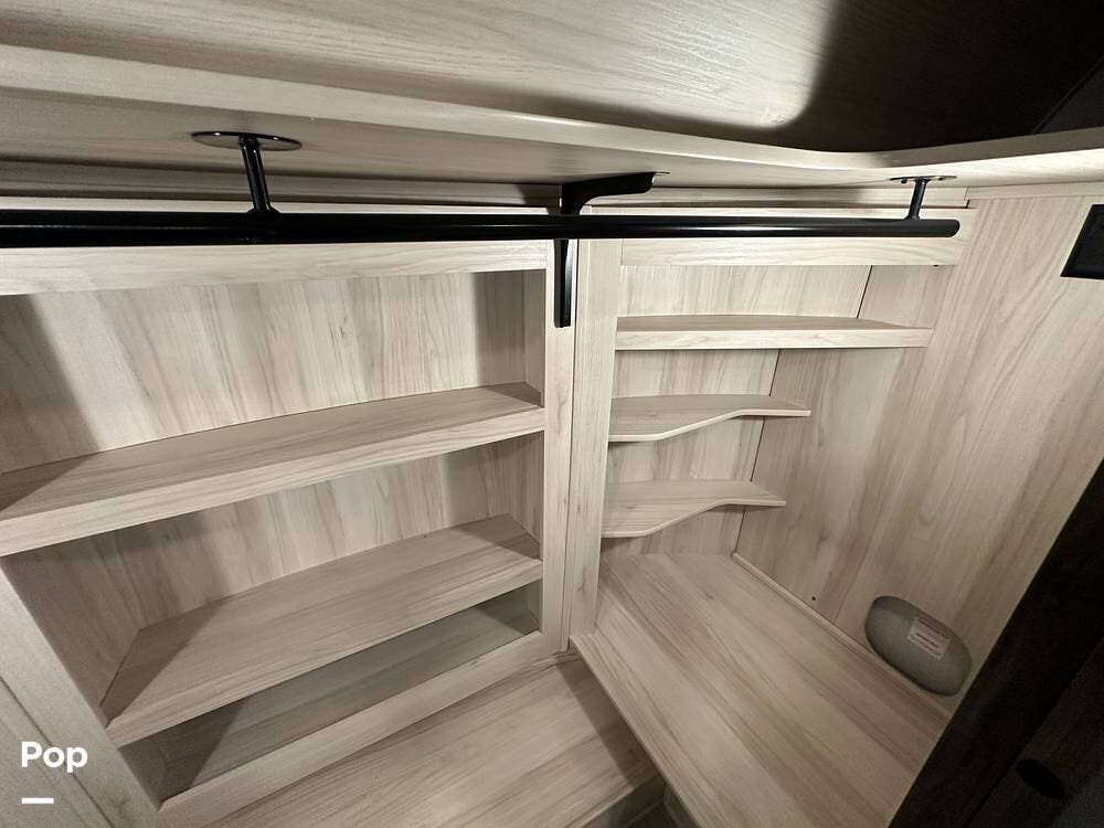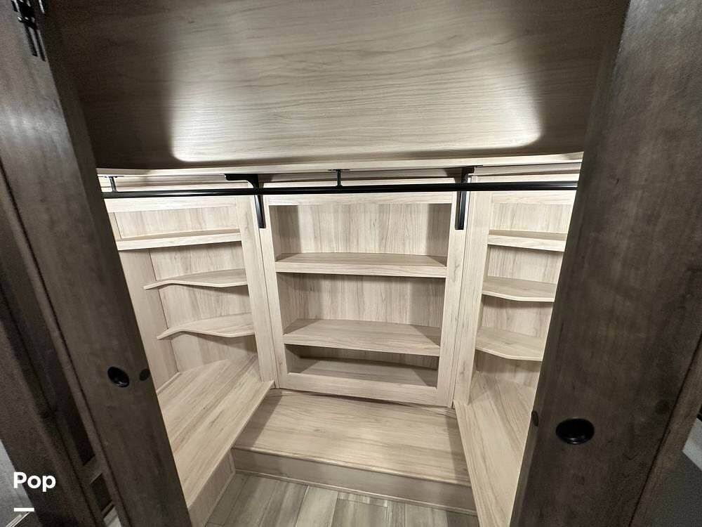 In the bedroom, you'll enjoy a spacious retreat with a king-size bed and two additional seating areas for added comfort. The large bedroom closet offers generous hanging space, while the third slide-out in the hallway provides even more shelf storage, ensuring you have plenty of room for your belongings.