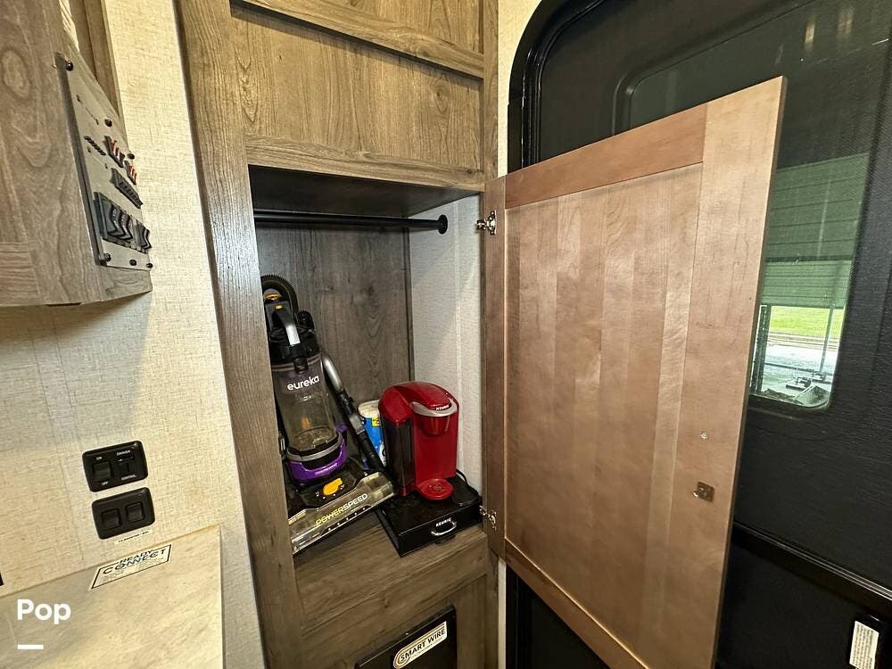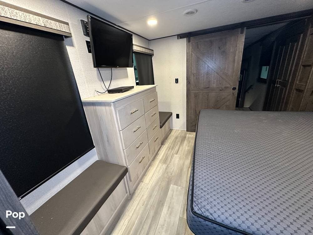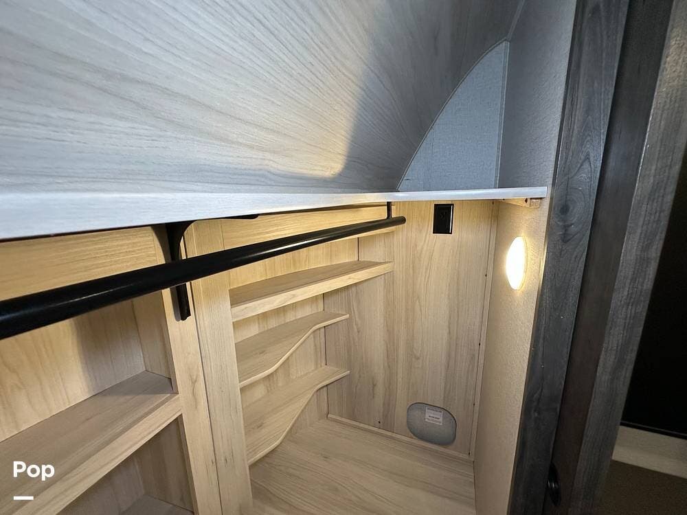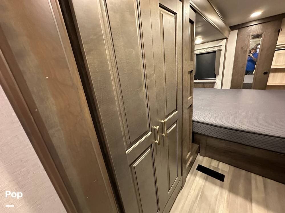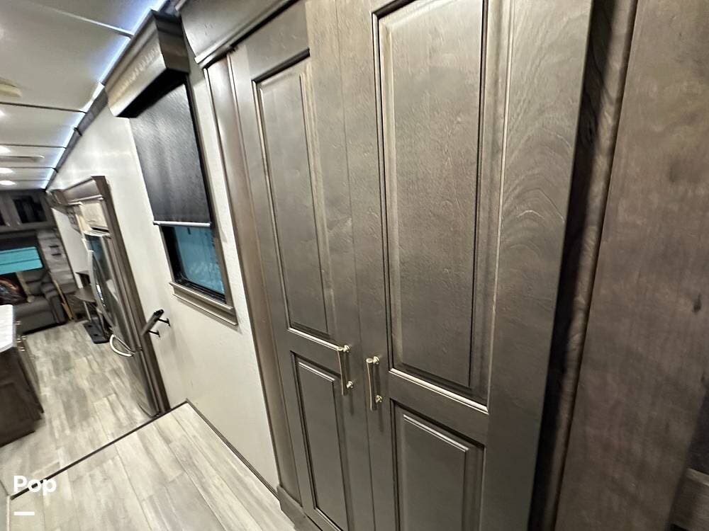 In the bedroom, you'll enjoy a spacious retreat with a king-size bed and two additional seating areas for added comfort. The large bedroom closet offers generous hanging space, while the third slide-out in the hallway provides even more shelf storage, ensuring you have plenty of room for your belongings.