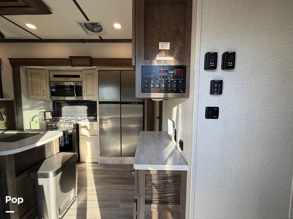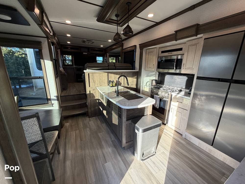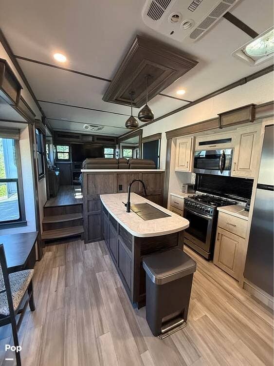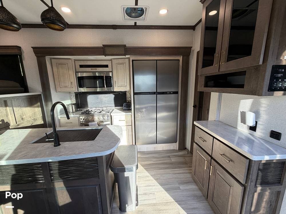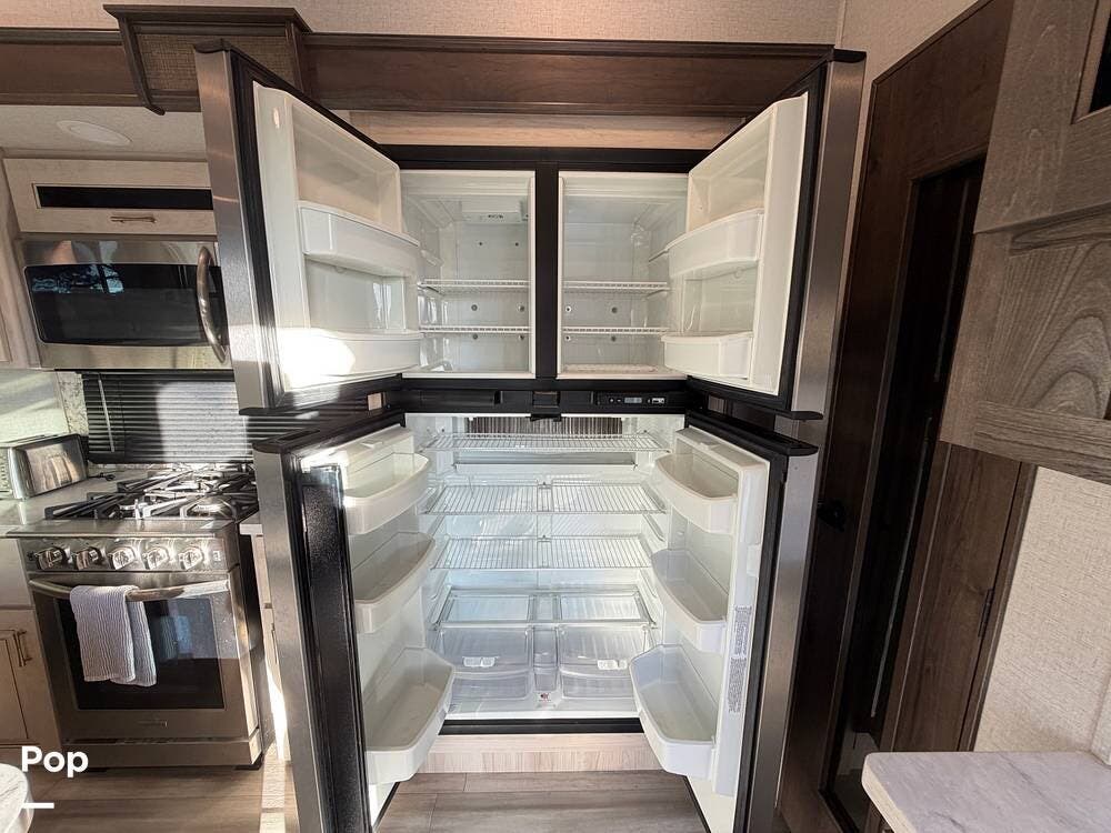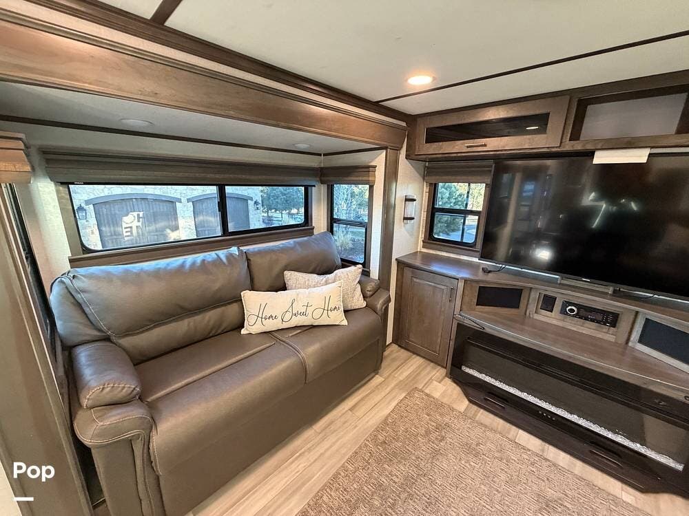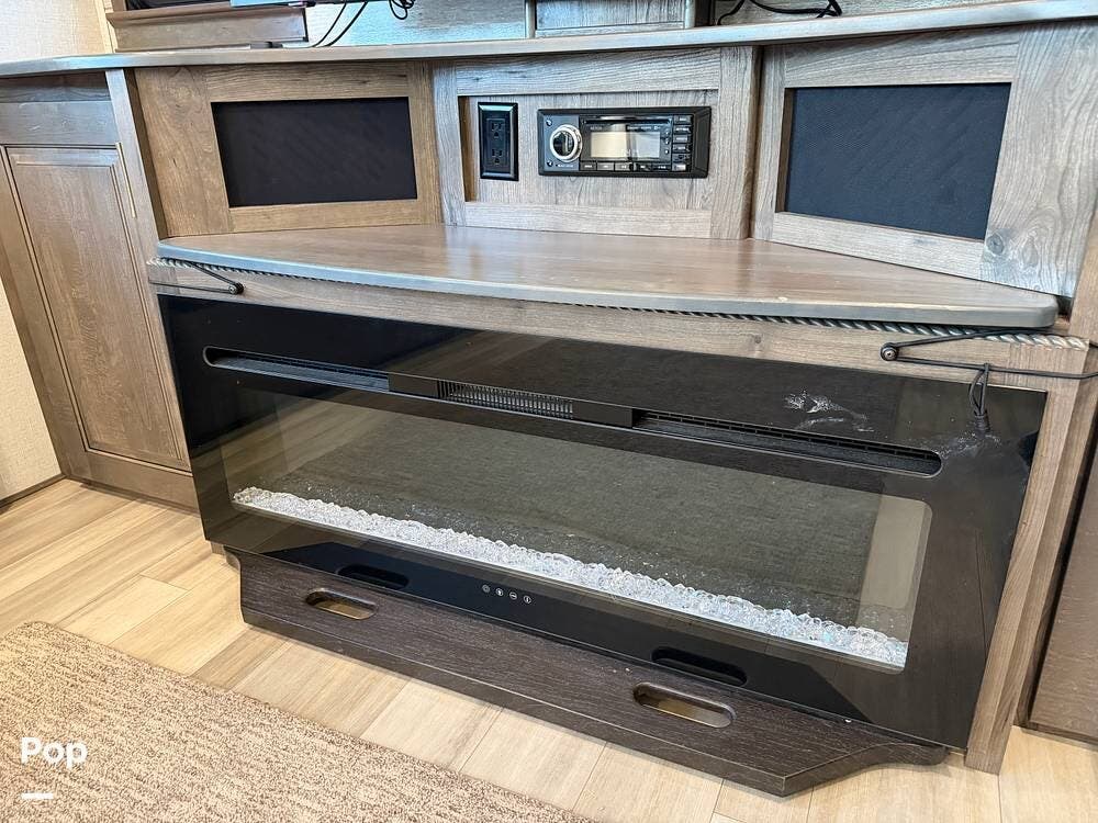 Step inside and experience true residential living on the road. The rear living area feels like a luxury lounge, featuring dual sleeper sofas, theater seating, a large entertainment center, and a cozy fireplace. The beautifully designed kitchen offers everything you need to feel at home, with a residential 18 cu. ft. refrigerator, four-burner range, microwave, and a spacious peninsula counter for cooking or entertaining guests.