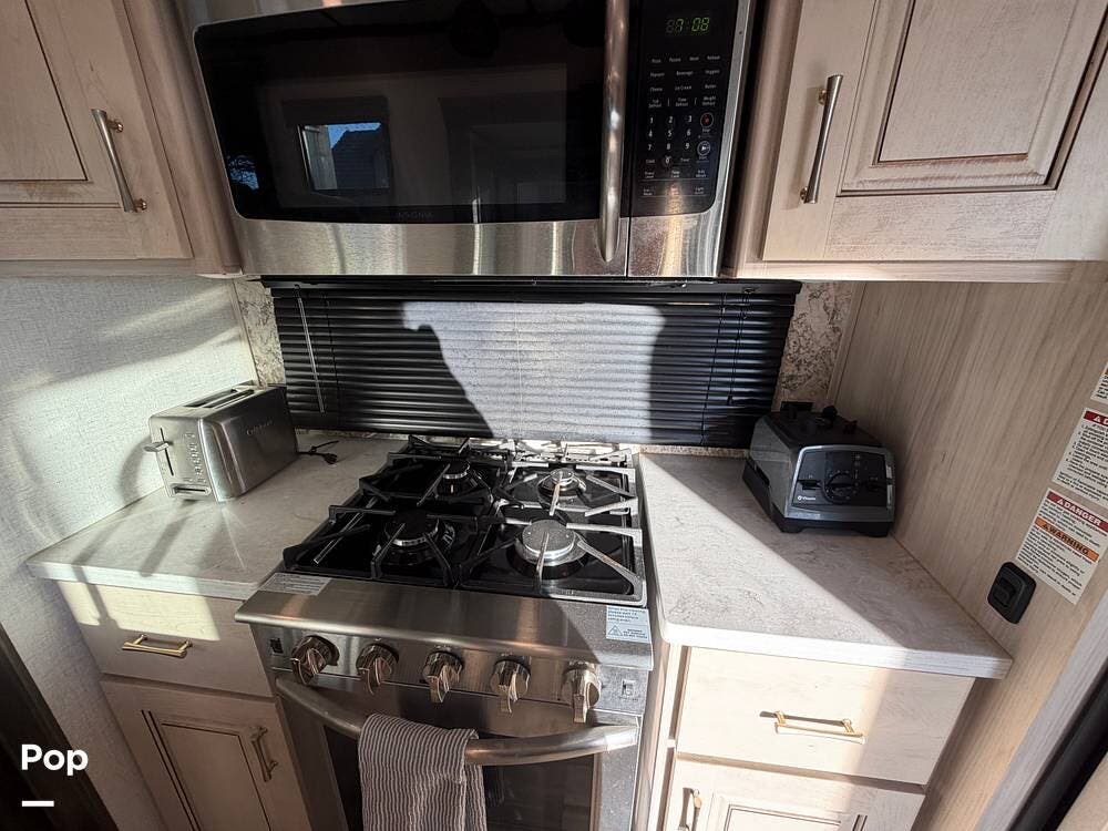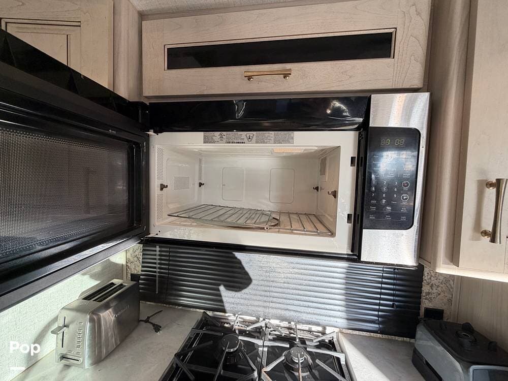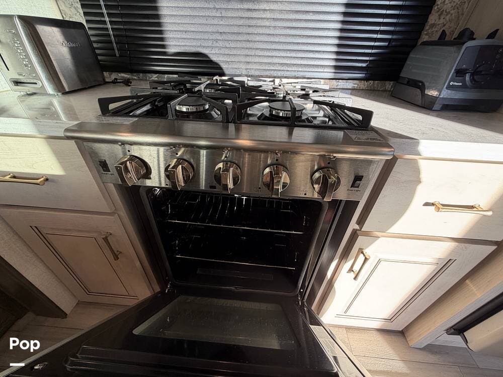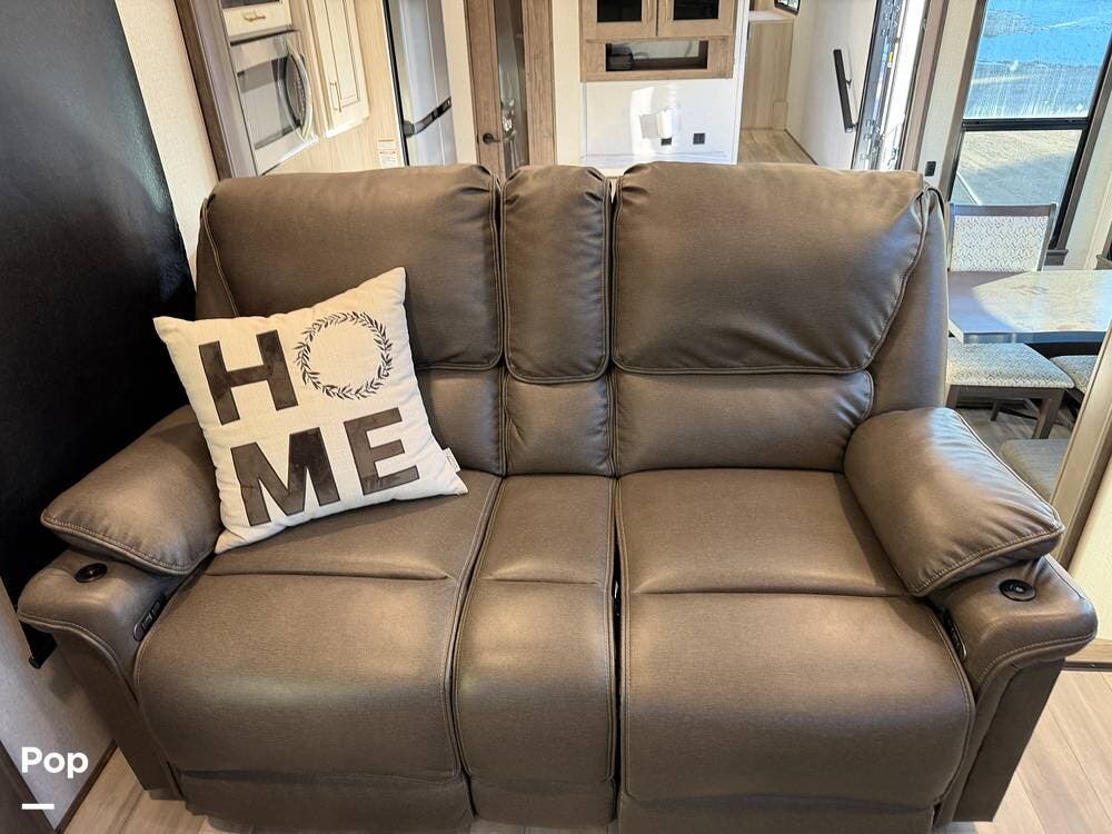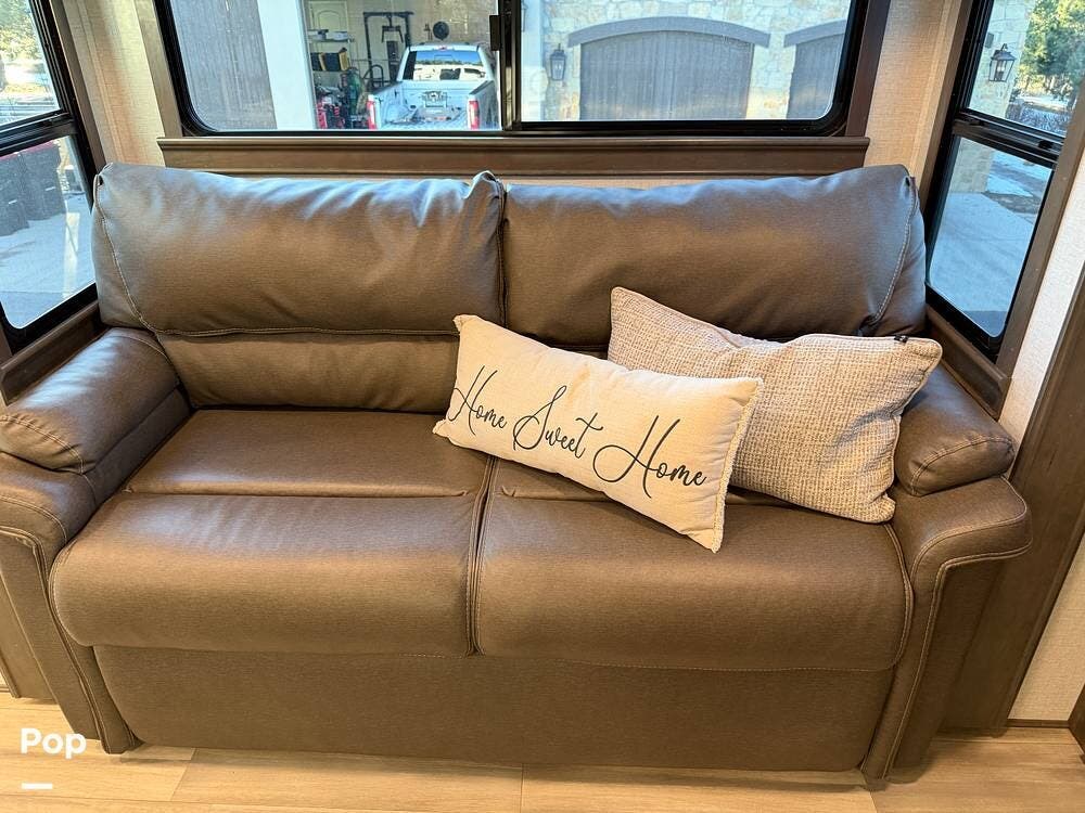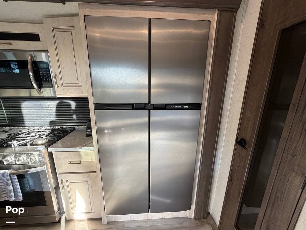 Step inside and experience true residential living on the road. The rear living area feels like a luxury lounge, featuring dual sleeper sofas, theater seating, a large entertainment center, and a cozy fireplace. The beautifully designed kitchen offers everything you need to feel at home, with a residential 18 cu. ft. refrigerator, four-burner range, microwave, and a spacious peninsula counter for cooking or entertaining guests.