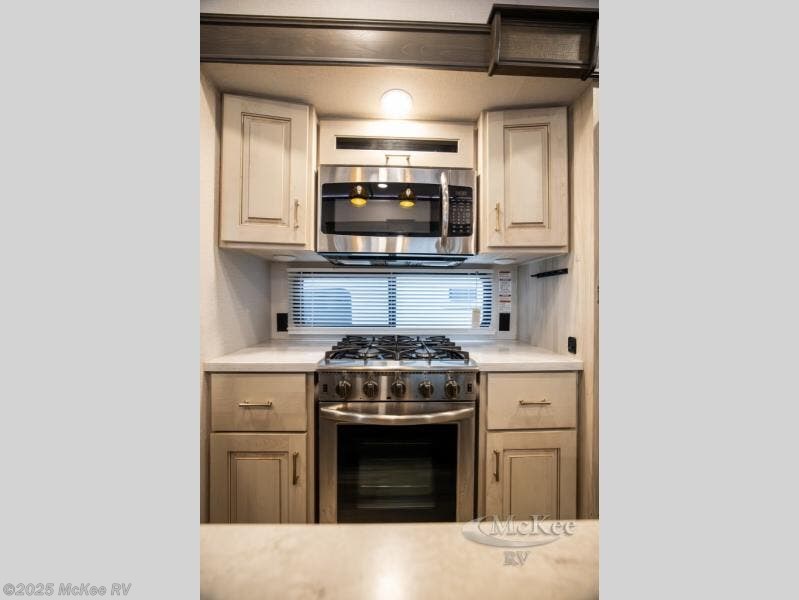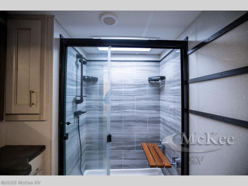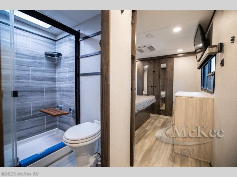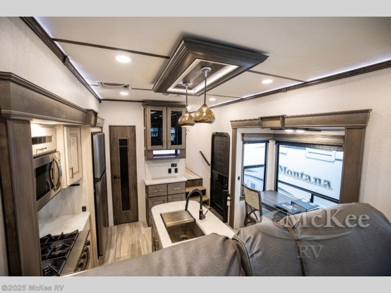 Throughout this entire Paradigm fifth wheel, you will be stunned by the residential, high-quality features! The kitchen is exceptional with its Insignia microwave, Insignia four-burner range, industry's largest oven, prep for a dishwasher, and peninsula countertop. The flush-floor kitchen slide also ensures that you won't stub your toes while you're preparing dinner, and the 18 cubic foot refrigerator will hold so much food! The technological features found on this unit are top notch, like the two Smart TVs, the USB charging ports, the dimmable LED lighting, and the marine-grade exterior speakers. Bring all of your favorite sweaters and sneakers in the walk-in closet located in the front private bedroom, and spend some time getting clean each morning in the large residential shower.