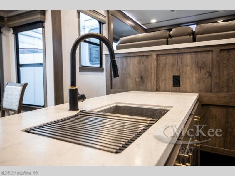 The Paradigm fifth wheel from Alliance RV is absolutely a dream to own because it combines high quality and luxury with features that you have specifically requested over the years! Some of the exterior customer-driven features are the Benchmark chassis, the G-range tires rated at 4,400 pounds, and the MorRyde CRE3000 suspension, and the Paradigm offers some of the industry's largest tank sizes at 98 gallons for fresh water and 106 gallons for gray water. The PVC roof covering will do an excellent job at protecting your RV from water intrusion, and it has increased solar reflectivity. You won't find any carpet in the Paradigm, and another great feature that has been reconstructed to meet the customer's needs is the flush-floor slide. The soft-close doors and drawers with magnetic catch are a high-end residential feature that isn't typically found on other RVs, and the excellent hidden storage capabilities of the Paradigm will surprise you when you find them.
