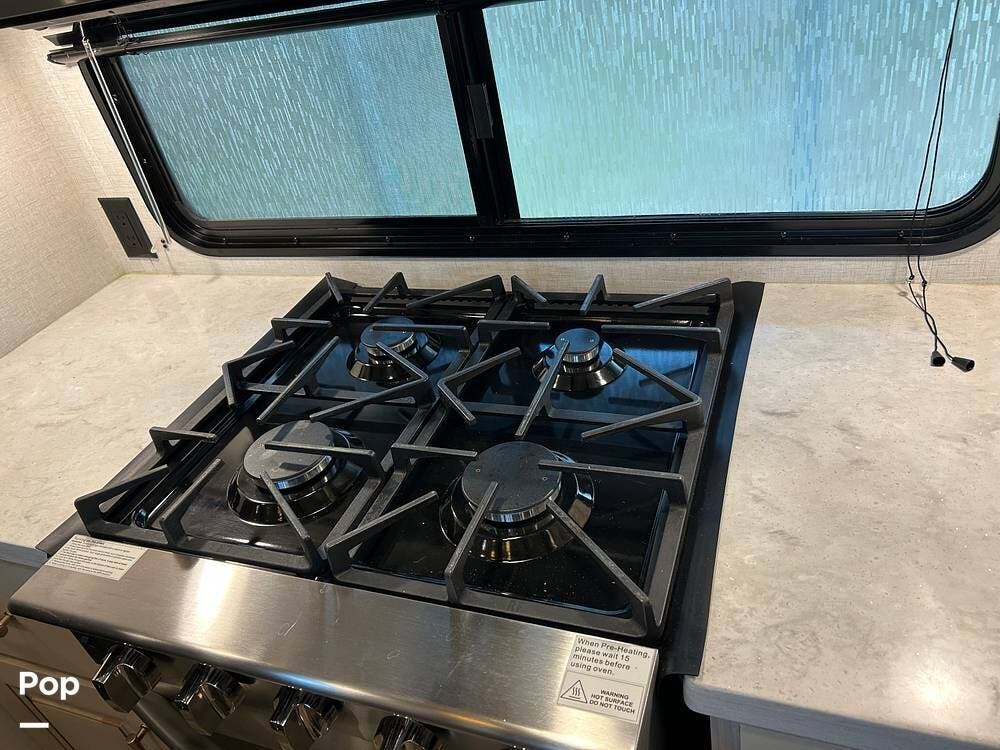 The kitchen features a residential-sized oven (the largest in class), a four-burner range, and a large 18 cu ft refrigerator. The peninsula countertop has the sink and space prepped for a dishwasher. Opposite that is a floating dinette table.