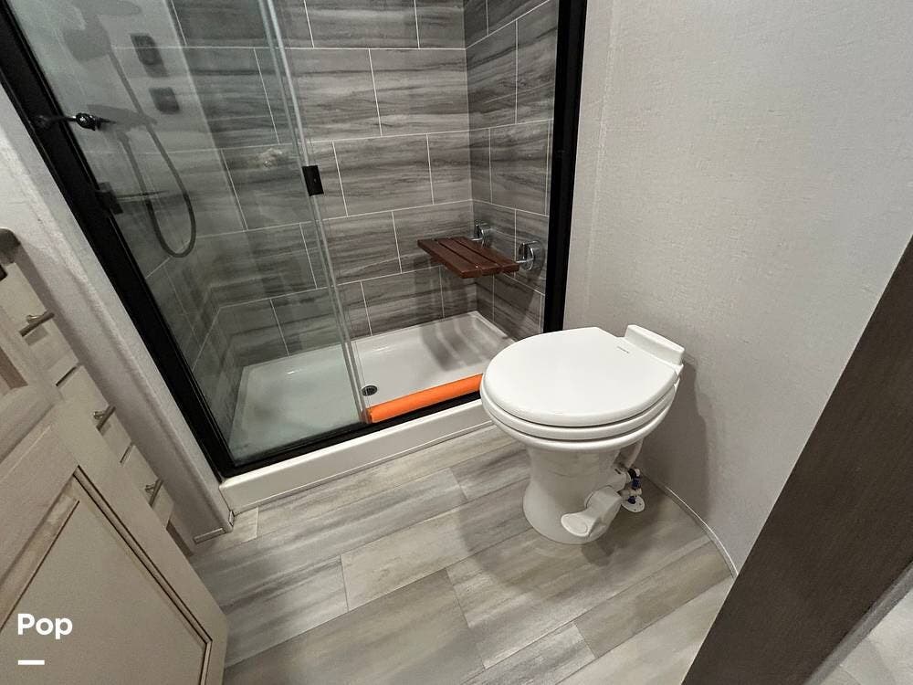 The master bedroom's king-size bed slide and a walk-in closet with a spacious front wardrobe and washer/dryer prep. The large residential shower contributes a lot to livability