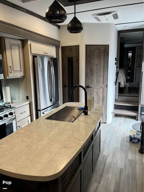 Equipped inside with many residential features like a french door refrigerator, stone countertops, vinyl plank flooring, and a fireplace, you will feel like you are home from the moment you step in!