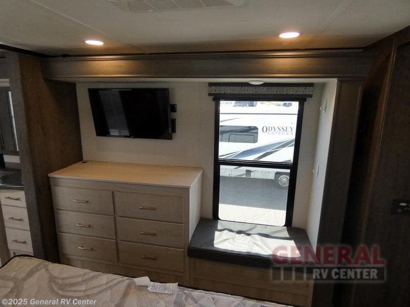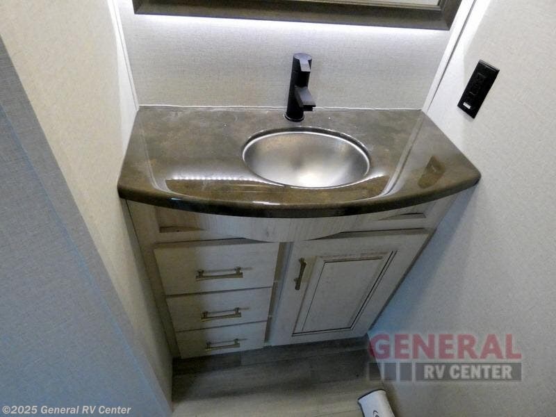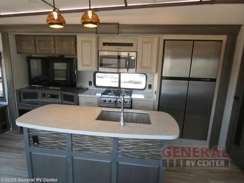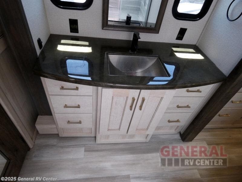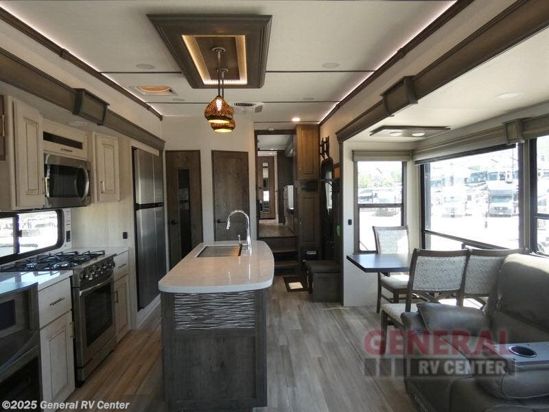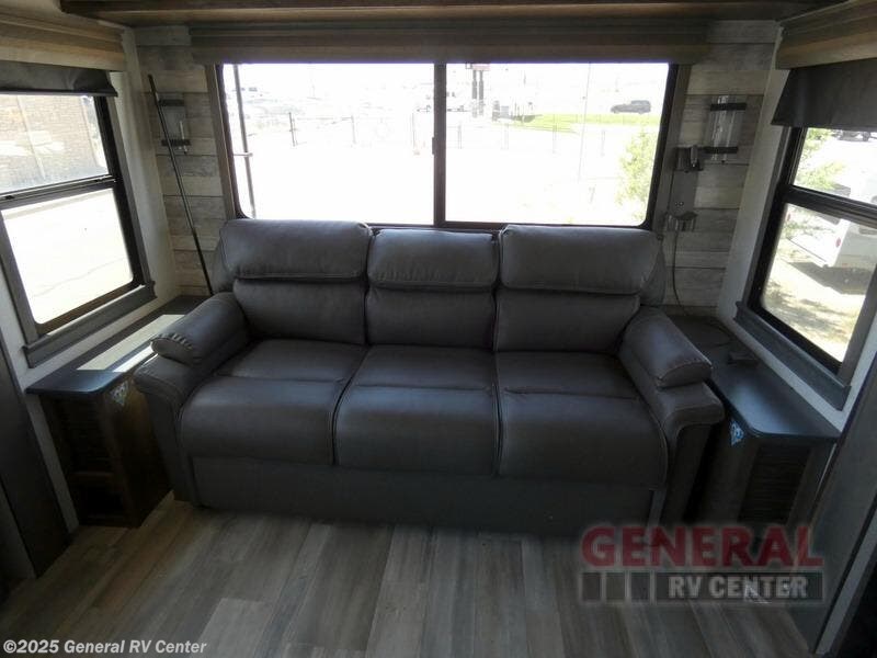 The Paradigm fifth wheel from Alliance RV is absolutely a dream to own because it combines high quality and luxury with features that you have specifically requested over the years! Some of the exterior customer-driven features are the Benchmark chassis, the G-range tires rated at 4,400 pounds, and the MorRyde CRE3000 suspension, and the Paradigm offers some of the industry's largest tank sizes at 98 gallons for fresh water and 106 gallons for gray water. The PVC roof covering will do an excellent job at protecting your RV from water intrusion, and it has increased solar reflectivity. You won't find any carpet in the Paradigm, and another great feature that has been reconstructed to meet the customer's needs is the flush-floor slide. The soft-close doors and drawers with magnetic catch are a high-end residential feature that isn't typically found on other RVs, and the excellent hidden storage capabilities of the Paradigm will surprise you when you find them.