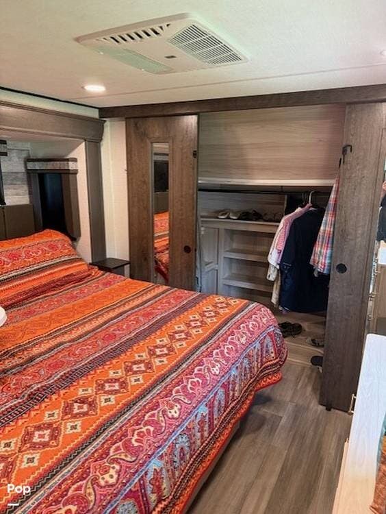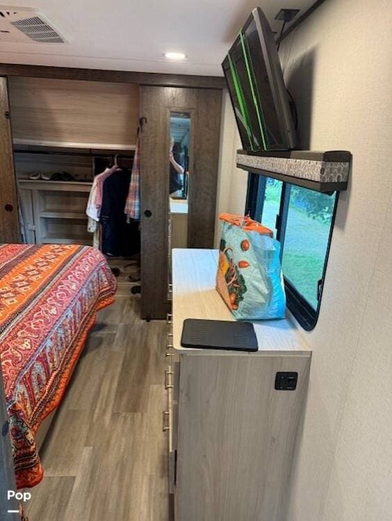Inside, you will find all of the comforts of home. In the master bedroom, you have a King-size bed and a large wardrobe with a washer and dryer prep. The dresser has a flip-up top for additional storage, and you have a Smart TV that you can load with all of your favorite Streaming content.
