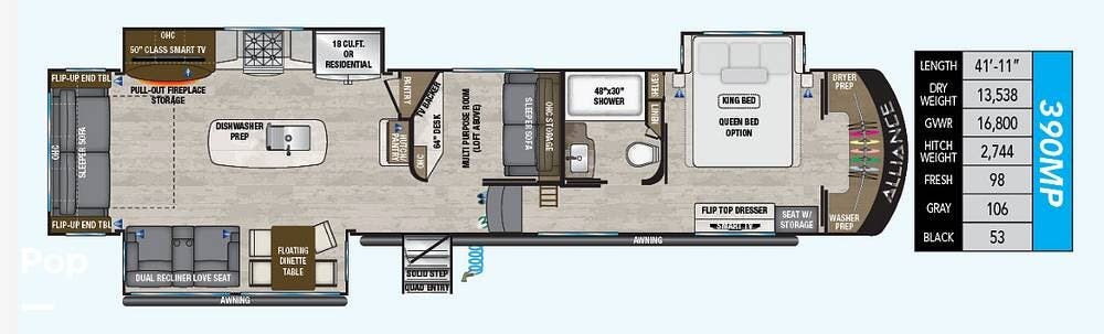 The 390MP sits on the Benchmark Chassis and features the Performance Running Gear. With the 10 I-Beam frame, a 2-inch torsion tube, the MorRyde CRE 3000 Suspension, Dexter 7000 LB Axles, and four-wheel disc brakes, getting there will be just as comfortable as your stay.