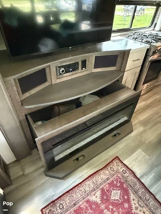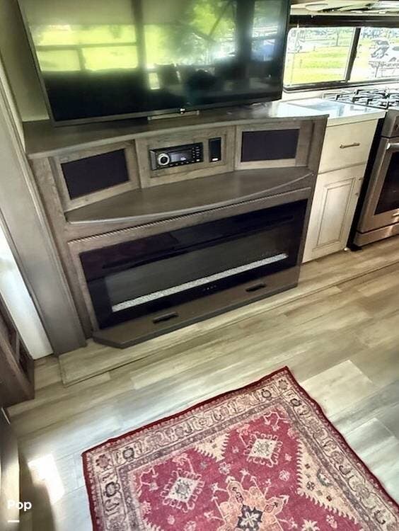 The living room area has a wall-mounted dinette table with four chairs, a tri-fold hide-a-bed, a theater seat with power recline, a smart TV, and a fireplace with a pullout storage area.