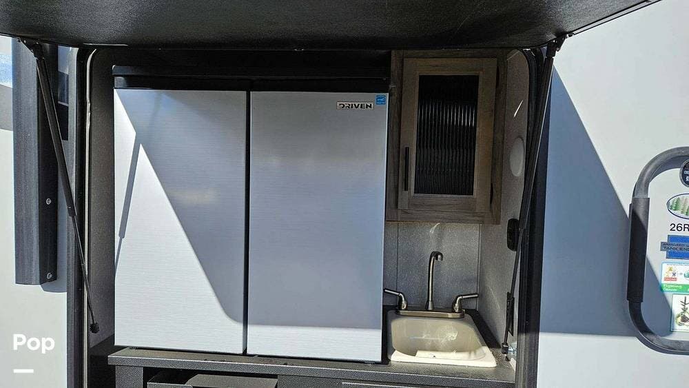 The Alpha Wolf 26RB-L shines on the exterior with a full outdoor kitchen with a sink, cabinet storage, and a double-door mini refrigerator--perfect for entertaining or meal prep in the open air. The 20-foot power awning provides ample shade and is ideal for creating a comfortable outdoor living space. Additional features include pass-through storage compartments, a rear-mounted spare tire, aluminum wheels, and a solid entry step for added stability.