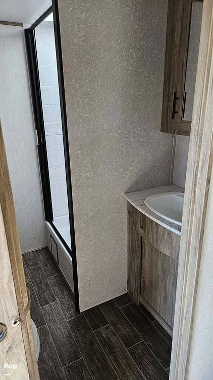 One of the standout features of this model is its spacious rear bathroom. It includes a glass-enclosed shower, porcelain toilet, vanity with sink, and a mirrored medicine cabinet. A built-in linen closet ensures you'll have plenty of room for towels and other essentials, and the sliding door makes for easy access while keeping the space open and airy.