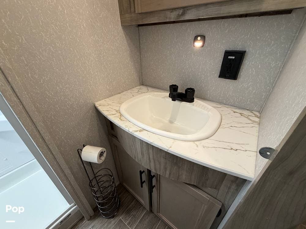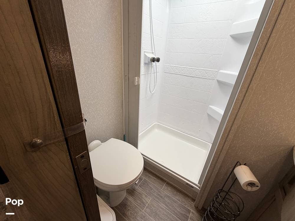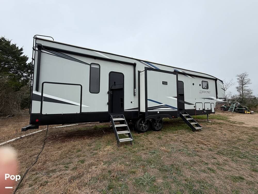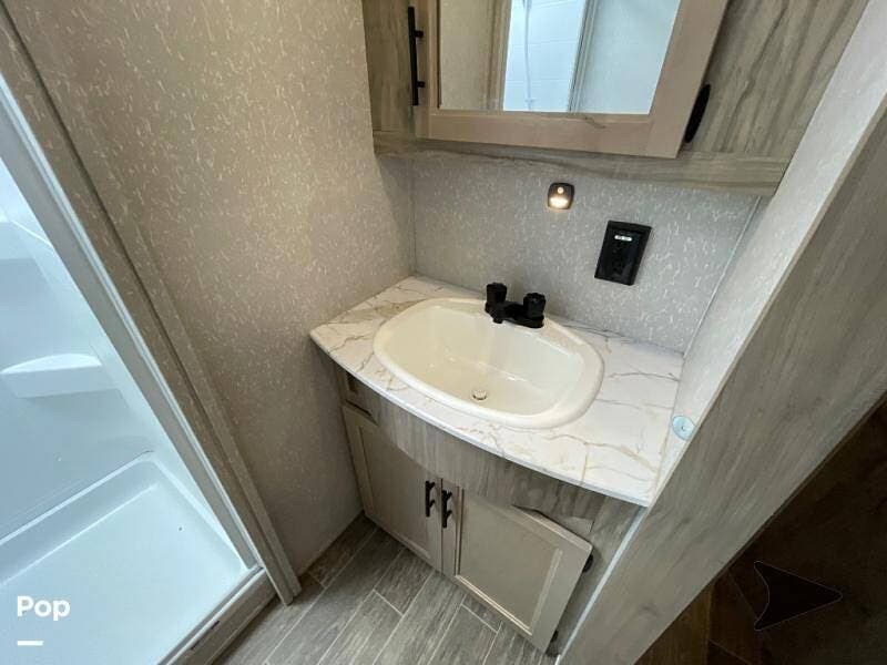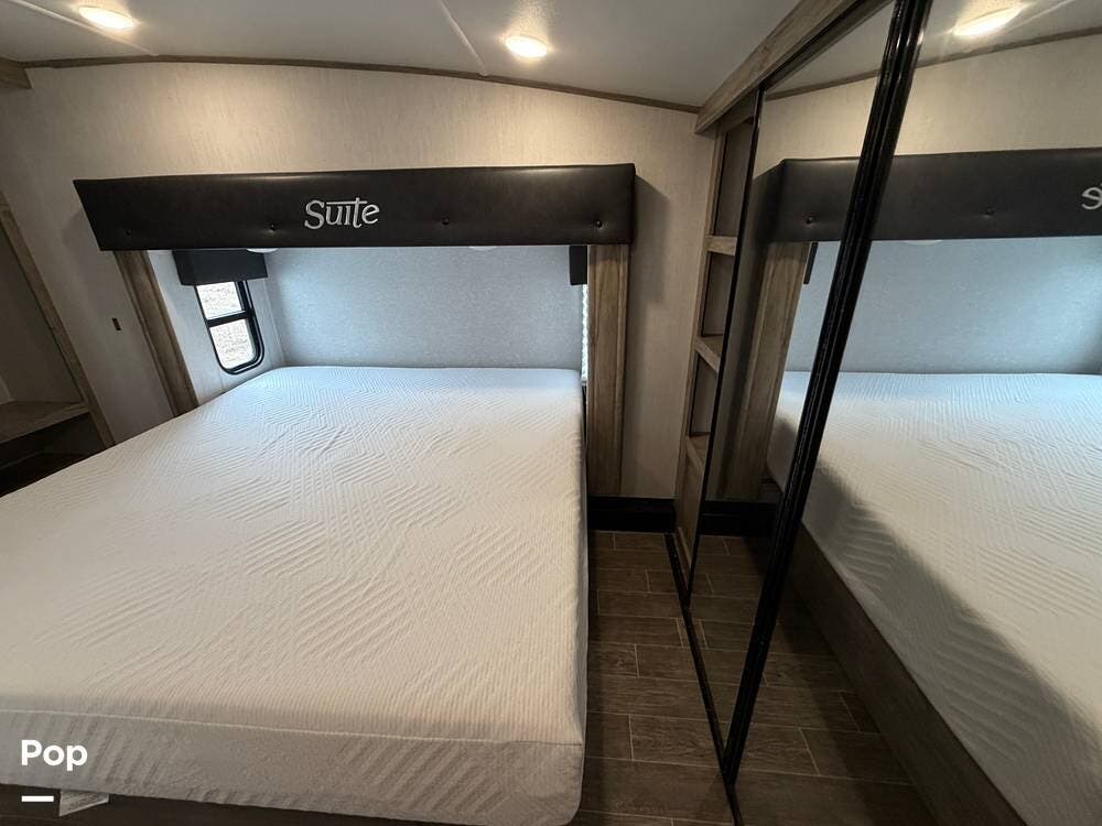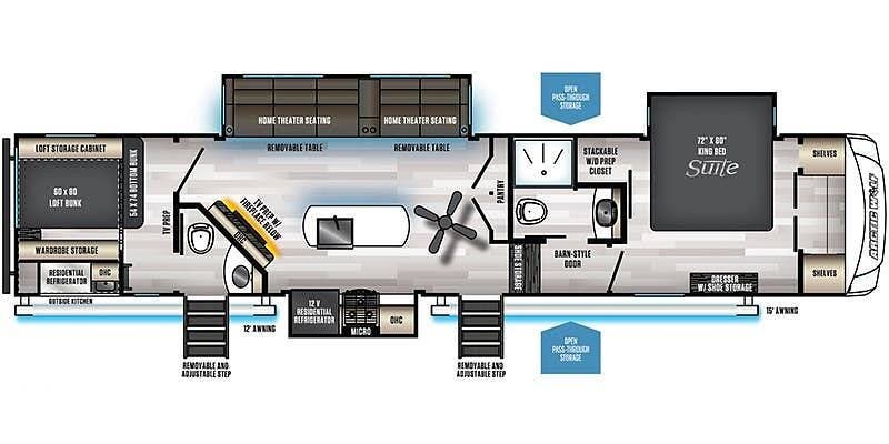 Up front, the private bedroom and large wardrobe storage give this fifth wheel a true "suite" feel, while the bathroom offers a more open, home-like footprint than many rigs in this class.