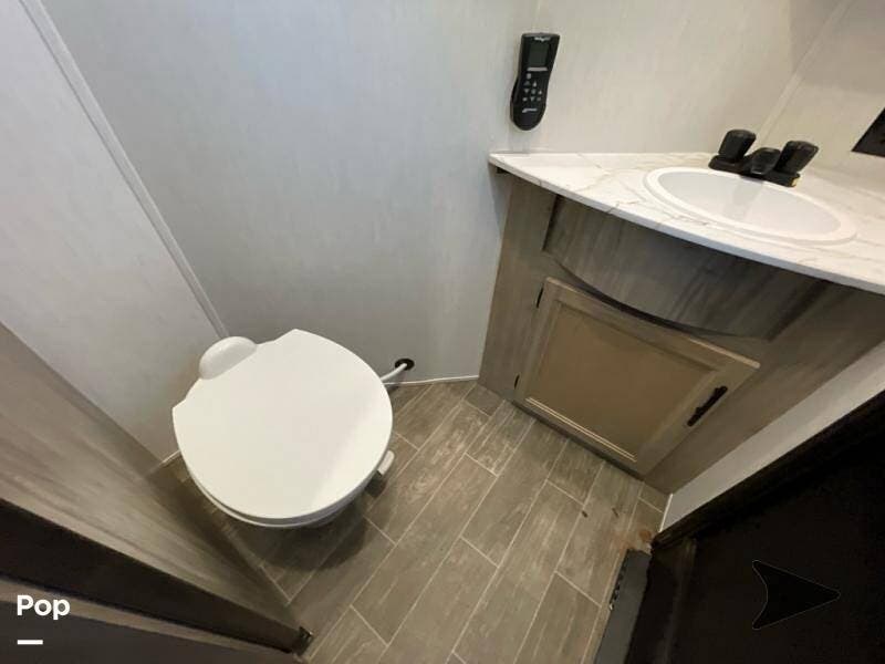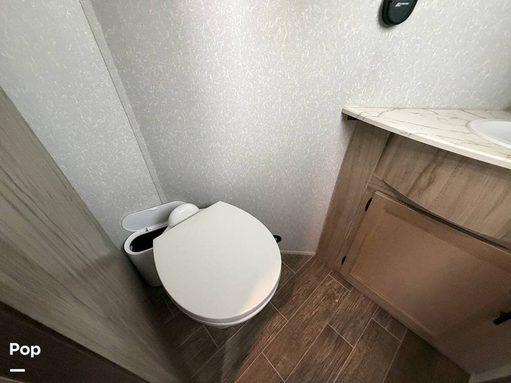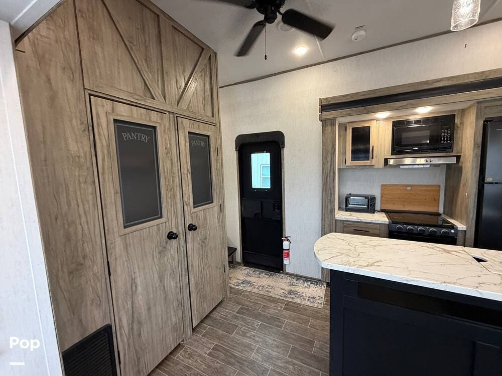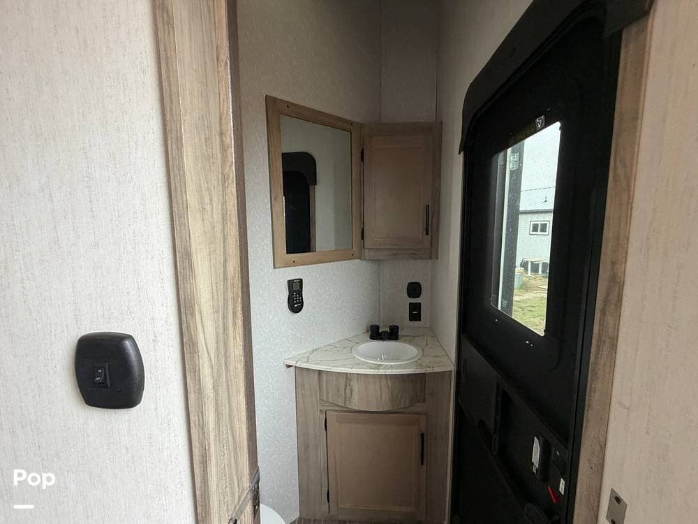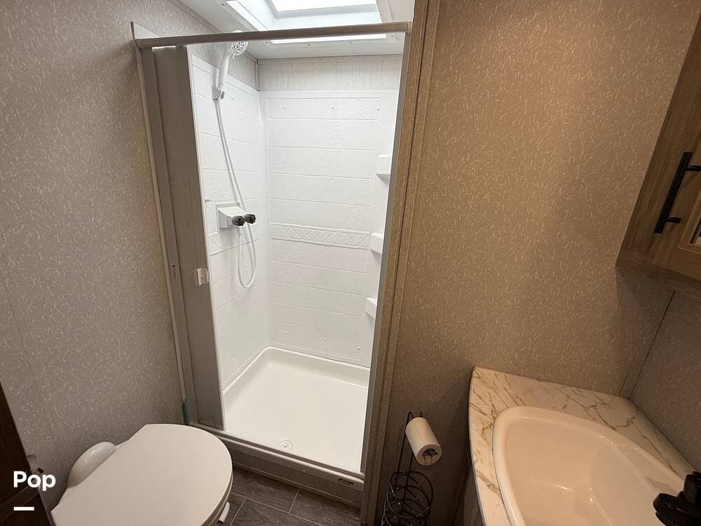 Up front, the private bedroom and large wardrobe storage give this fifth wheel a true "suite" feel, while the bathroom offers a more open, home-like footprint than many rigs in this class.