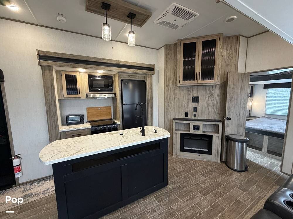 Inside, you'll find a residential-feeling lounge setup with generous seating, an entertainment center, and a bright kitchen anchored by an island and ample counterspace for real cooking.