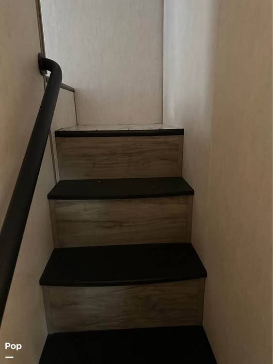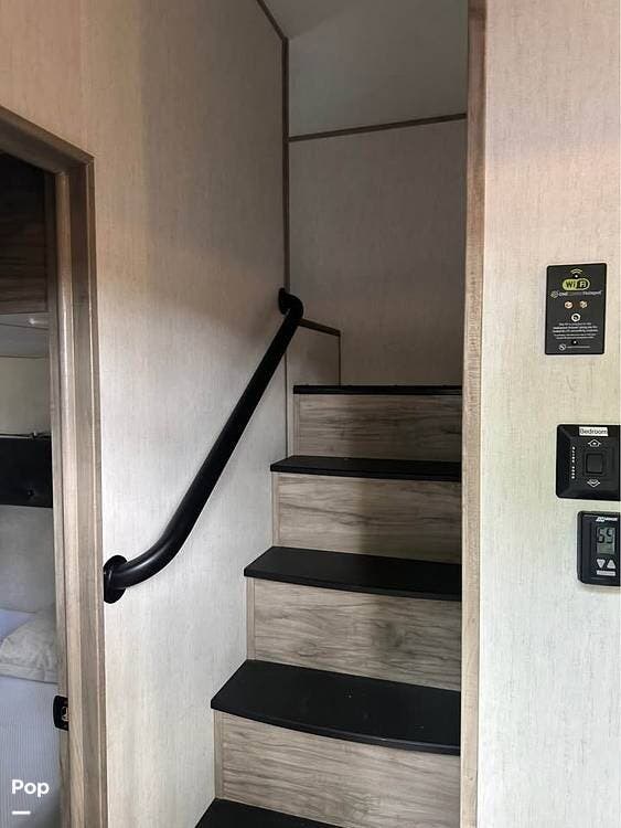 Inside, it features a king-size bed with under-bed storage, two TVs, a fireplace, LED lighting in both the interior and exterior, modern and stylish overhead lighting, two sleeper sofas, and dual reclining theater seating. There is also a loft bed area with staircase access as opposed to ladder access, like many 5th wheels.