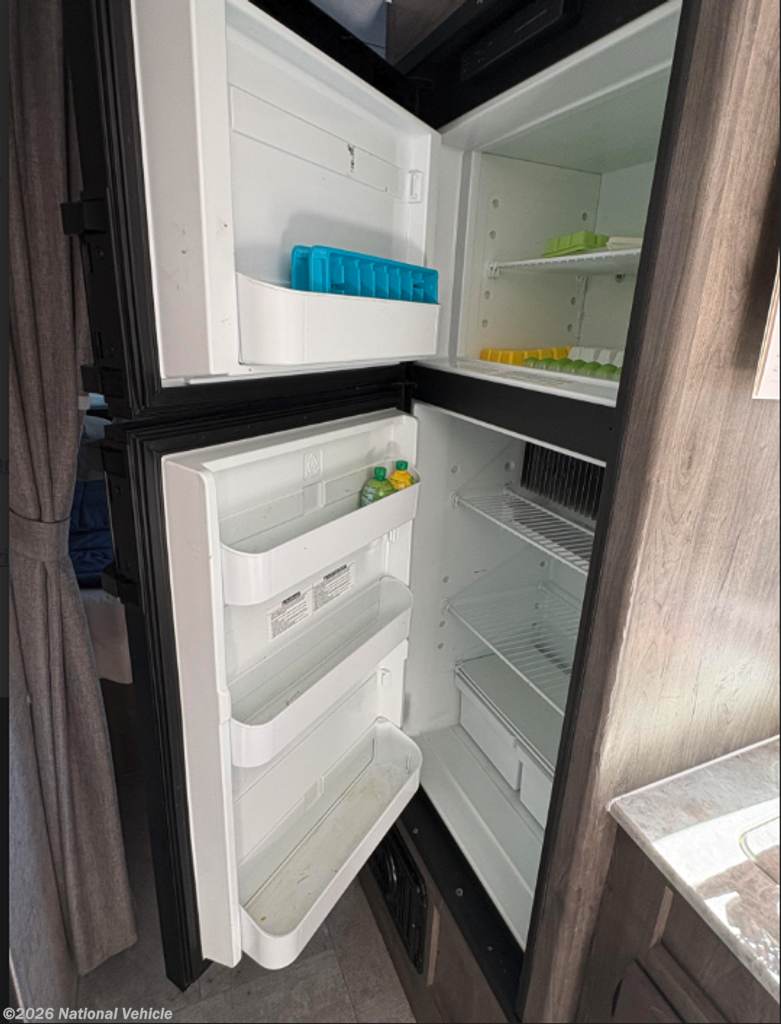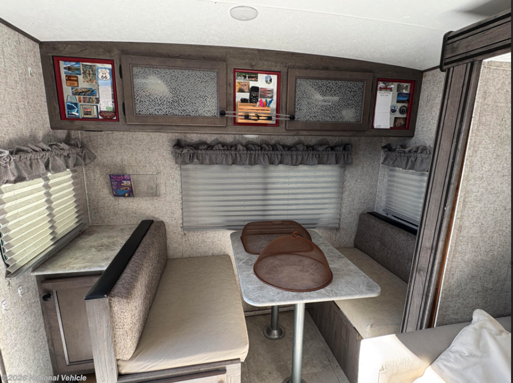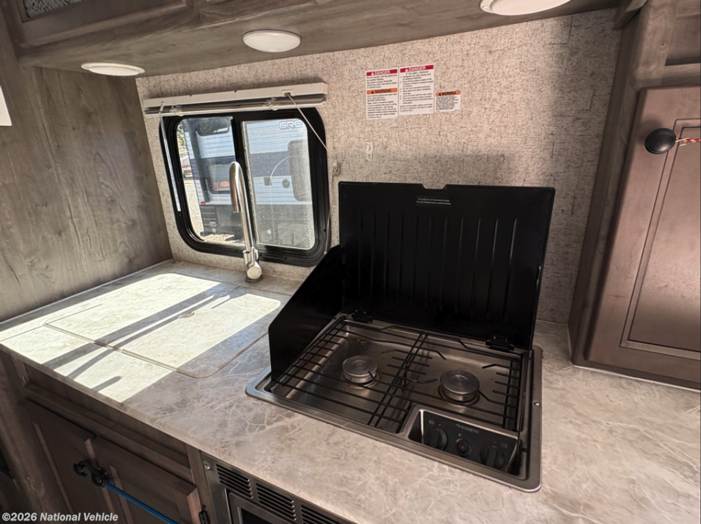 Inside, the 213RDS floorplan offers a bright, open layout with panoramic rear windows and a spacious rear dinette, perfect for dining, relaxing, or converting into additional sleeping space. The mid-living area features a comfortable sofa, and the fully equipped kitchen includes a two-burner cooktop, microwave, stainless-steel sink, and a large refrigerator?giving you all the essentials for cooking on the go.