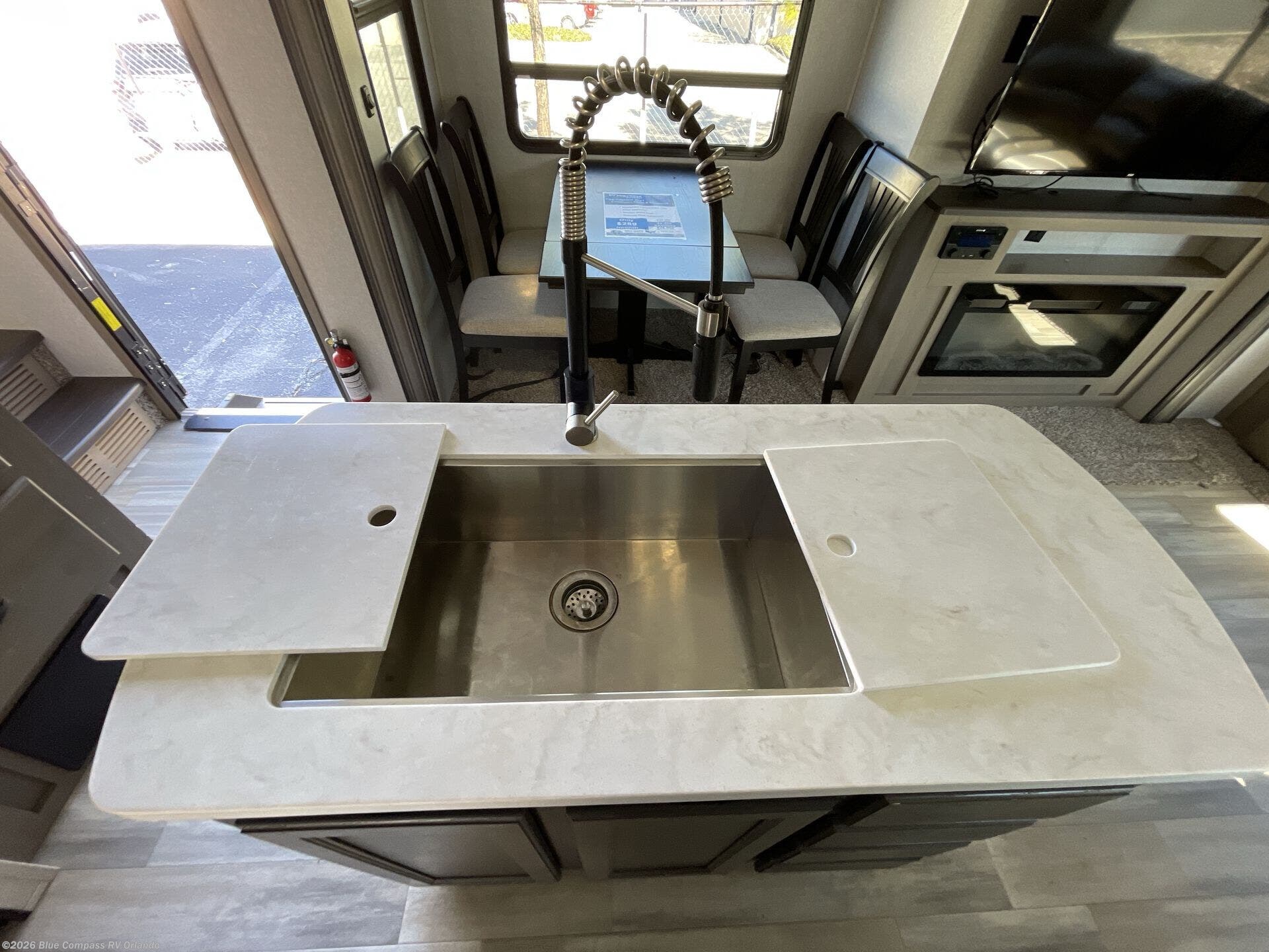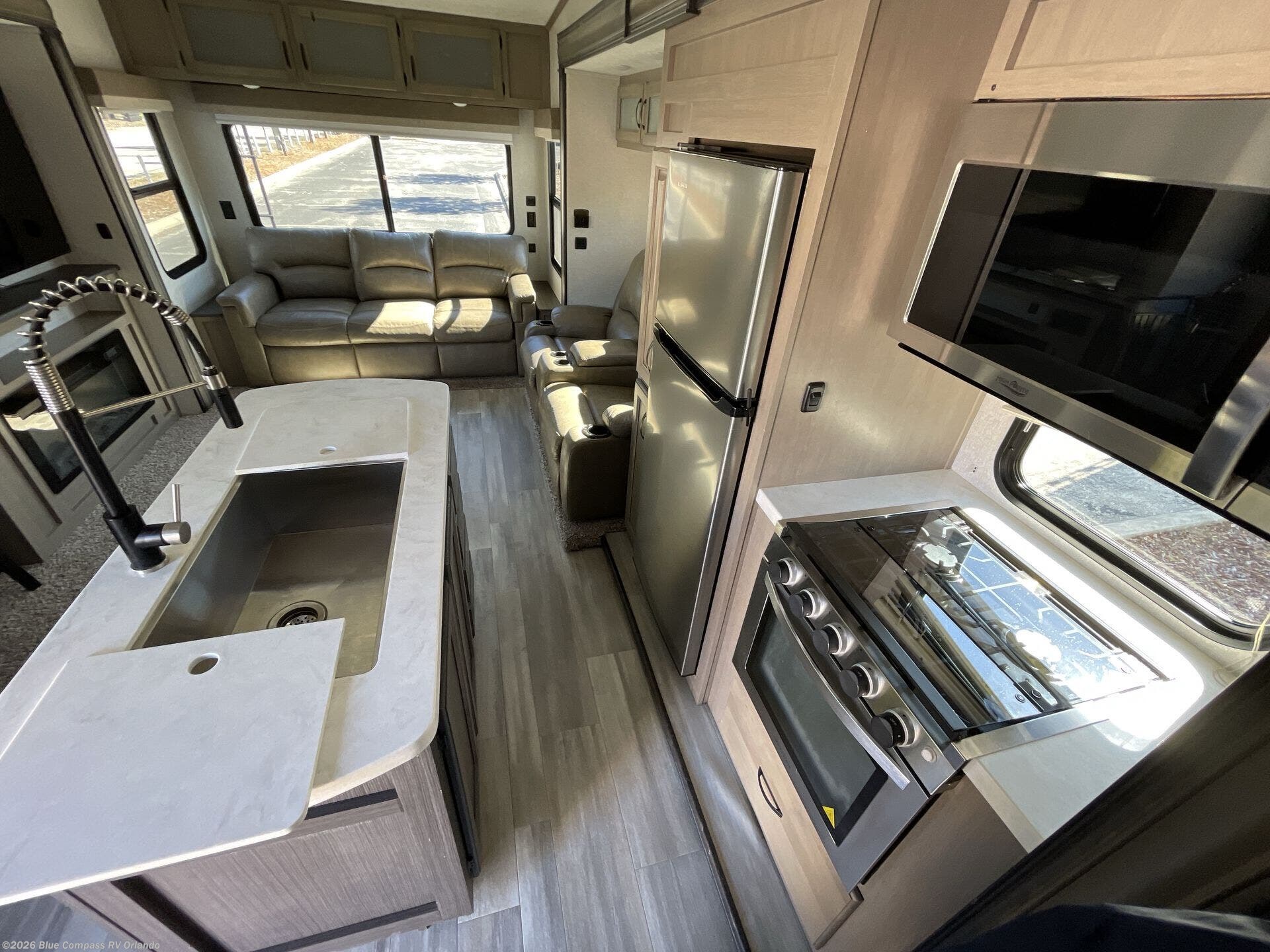 With any Chaparral fifth wheel you will love the look of the white gel coat exterior with modern graphics and the automotive painted front cap. The interior offers a modern Dove Grey cabinetry, modern Ebony hardware, plus a modern high rise faucet and farm sink making clean up easy and stylish. The construction includes a six-layer, bonded and aluminum framed main floor structure, vacuum bonded and aluminum framed sidewalls with rot proof AZDEL composite sidewall panels, and the Weather Shield+ technology so you can camp comfortably in any climate. Other stand-out features include the Road Armor suspension by Trail Air, the electric front jacks and rear stabilizer jacks, the Winegard Air 360 HDTV/radio dome antenna, plus the roof mounted solar panel prep. Choose your favorite Chaparral today!