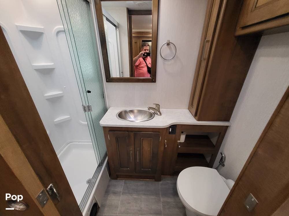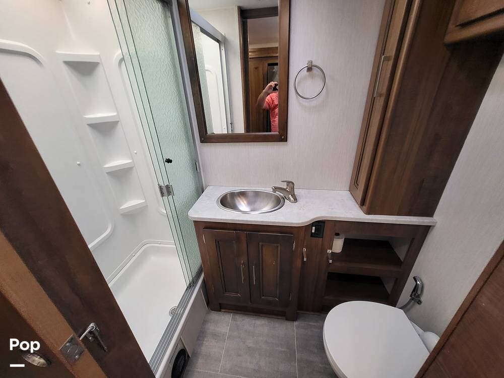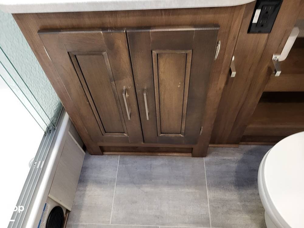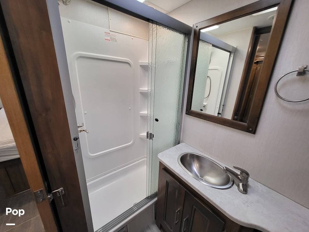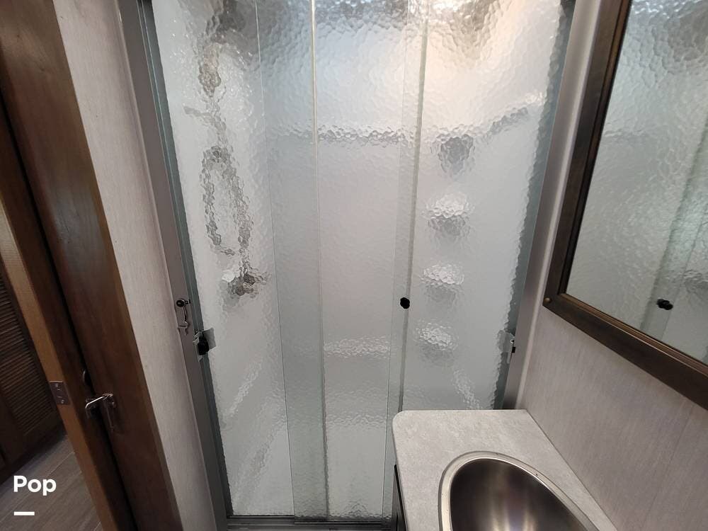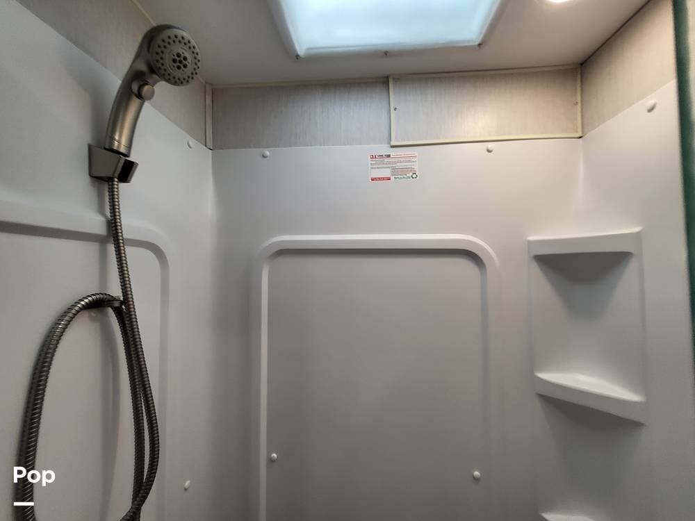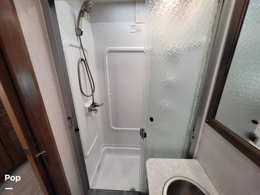 The spacious full bathroom includes a glass-enclosed walk-in shower, vanity, and ample storage for linens and toiletries, ensuring comfort and convenience wherever you roam.