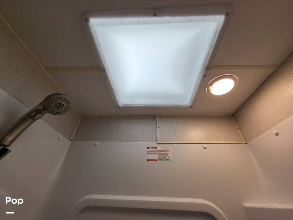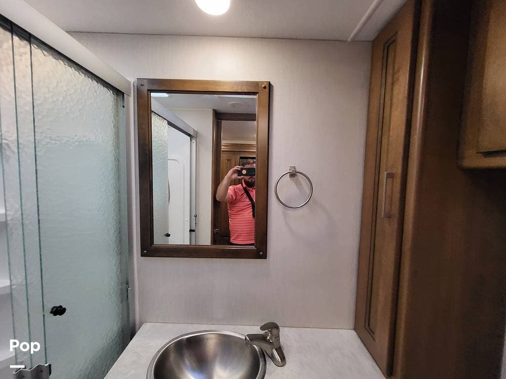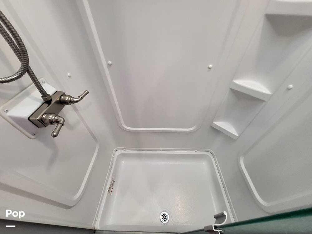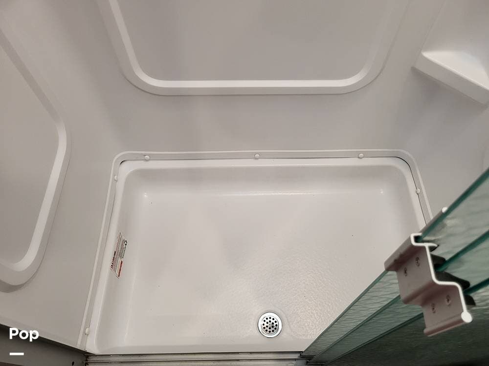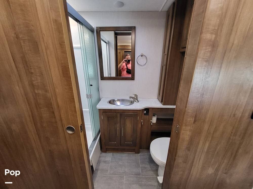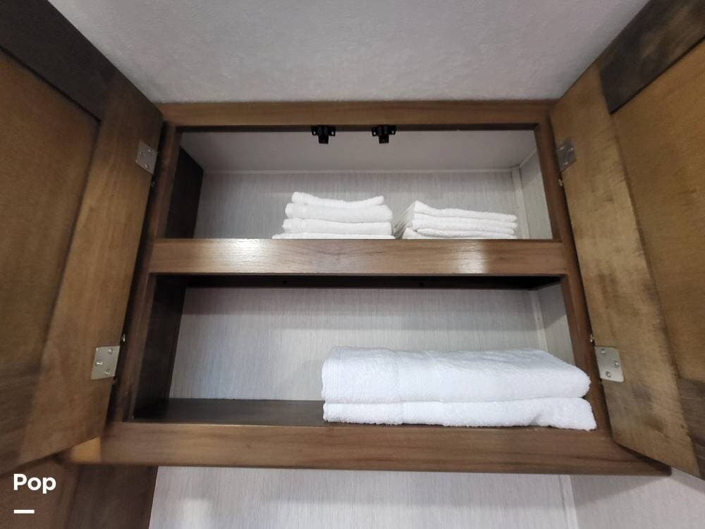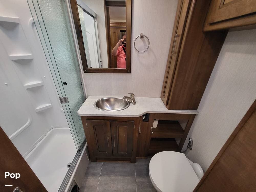 The spacious full bathroom includes a glass-enclosed walk-in shower, vanity, and ample storage for linens and toiletries, ensuring comfort and convenience wherever you roam.