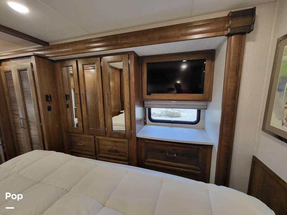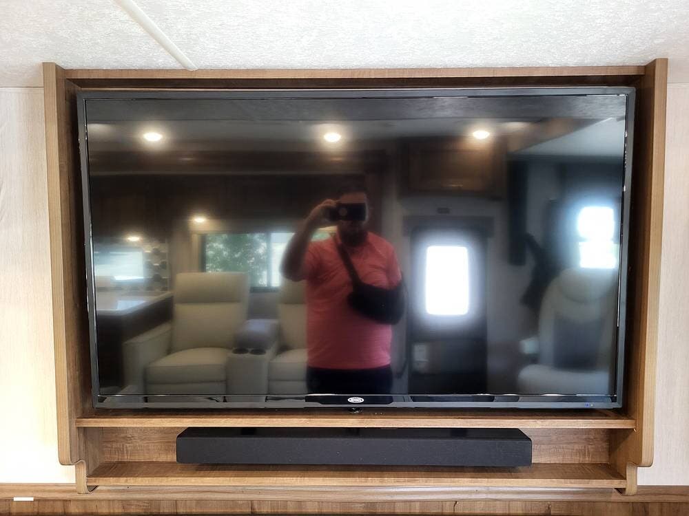 The private master suite provides a restful retreat with a king-size bed, mirrored wardrobes, nightstands, generous storage, and a personal flat-screen TV. In the living area, you'll find comfortable reclining theater seating and an inviting entertainment center with a large LED TV and fireplace--ideal for relaxing evenings after a day of travel.