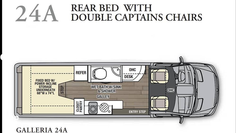 The Galleria 24A is powered by the Mercedes 3.0L turbo V6 diesel engine mated to a 5‑speed automatic transmission, delivering smooth performance and proven reliability. Additional features include a black tank flush system, WiFi Ranger prep, and under‑carriage lighting.