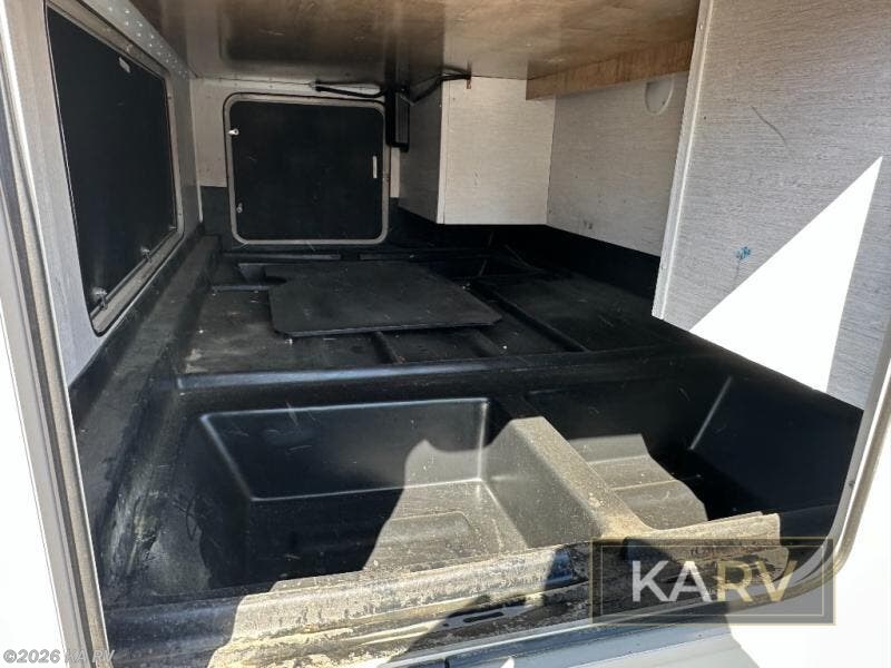 Enter and see a spacious combined kitchen and living area with the sofa slide out fully extended. There is a booth dinette to the right of the door (this has been removed) which includes overhead storage. Above the front cab area you can enjoy the extra sleeping space with a 57" x 95" bunk, or opt. for an entertainment center and storage if the sleeping area is not needed. The sofa slide includes the refrigerator giving you a bit more walking around space inside.