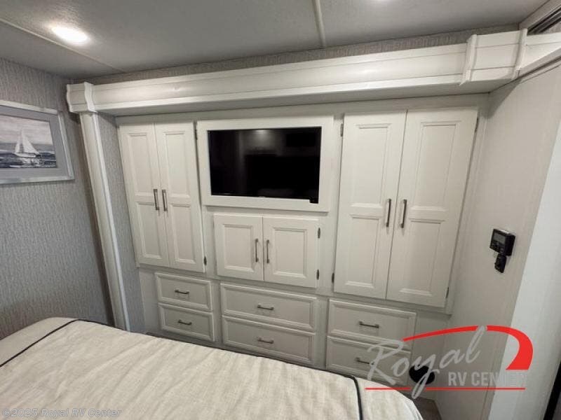 Take in the scenery as you travel in this coach that offers windows throughout to enjoy the outdoors while indoors! You will find reclining/swivel pilot seats, a sofa with hide-a-bed and a booth dinette to relax on while traveling and while at the RV park. You might enjoy watching the 40" LED TV in the living room or the 32" LED bedroom TV, as well as the exterior LED TV to enjoy while visiting with the cook using the outside kitchen. The cook will be able to make even more food using the interior kitchen which offers stainless steel appliances and farm sink, plus serve from the solid surface countertops. When you are ready to retire for the evening, the rear bedroom gives you a king bed with plenty of storage including a CPAP station, and dual wardrobes. And the exterior offers a full basement with pass-through storage for your totes, golf clubs, camping chairs and such!