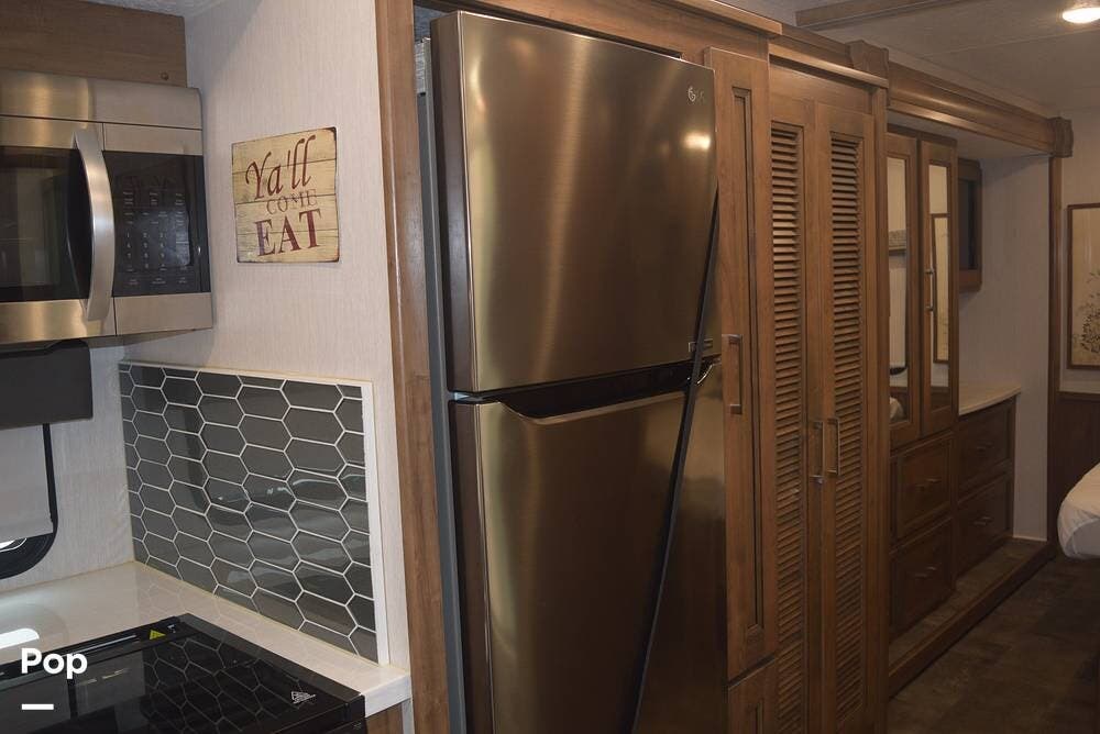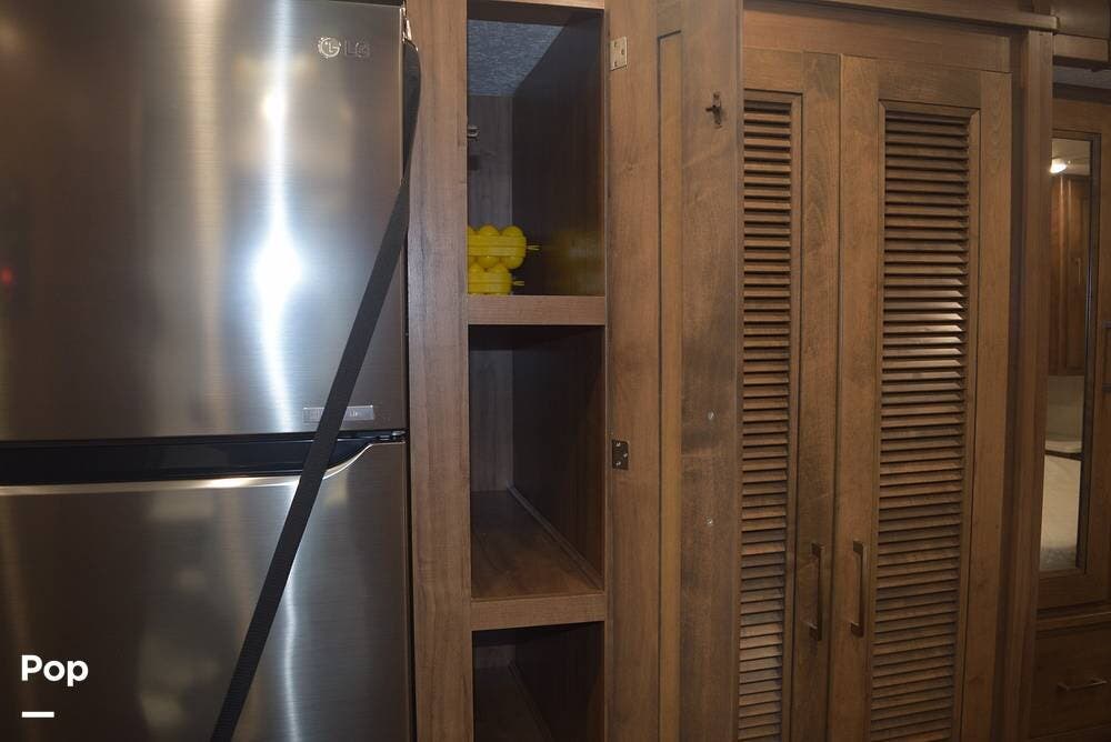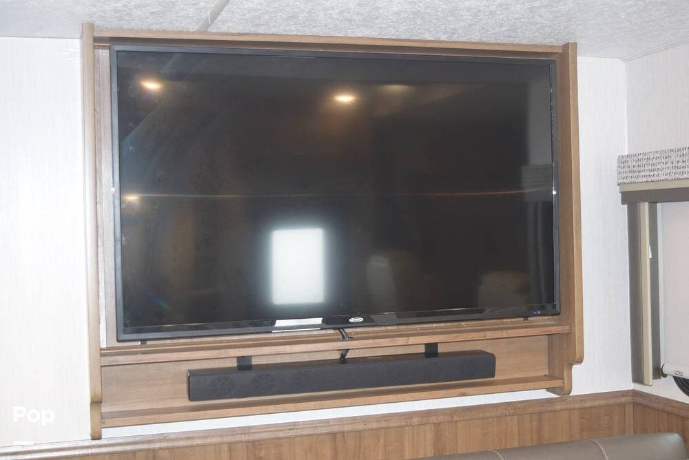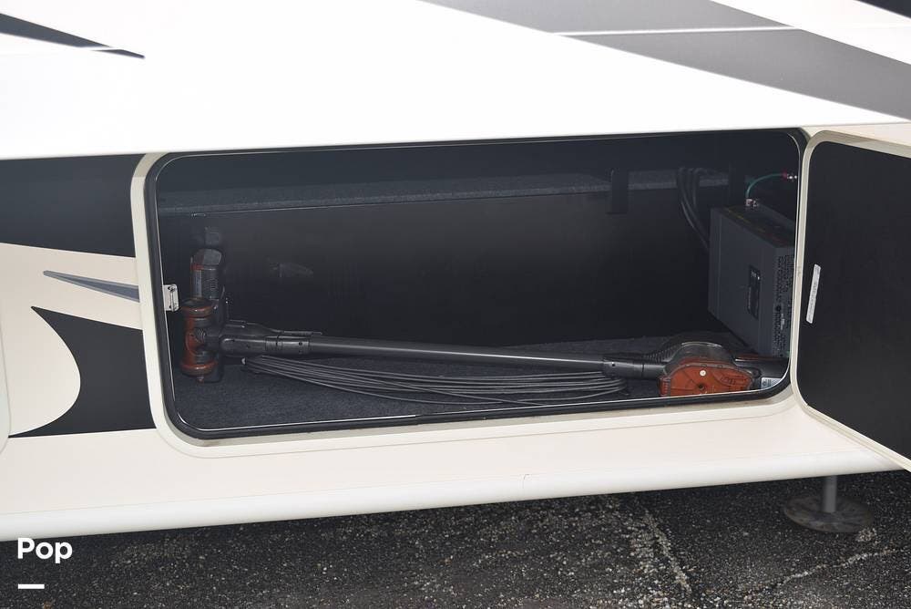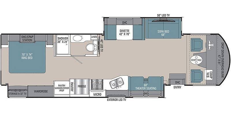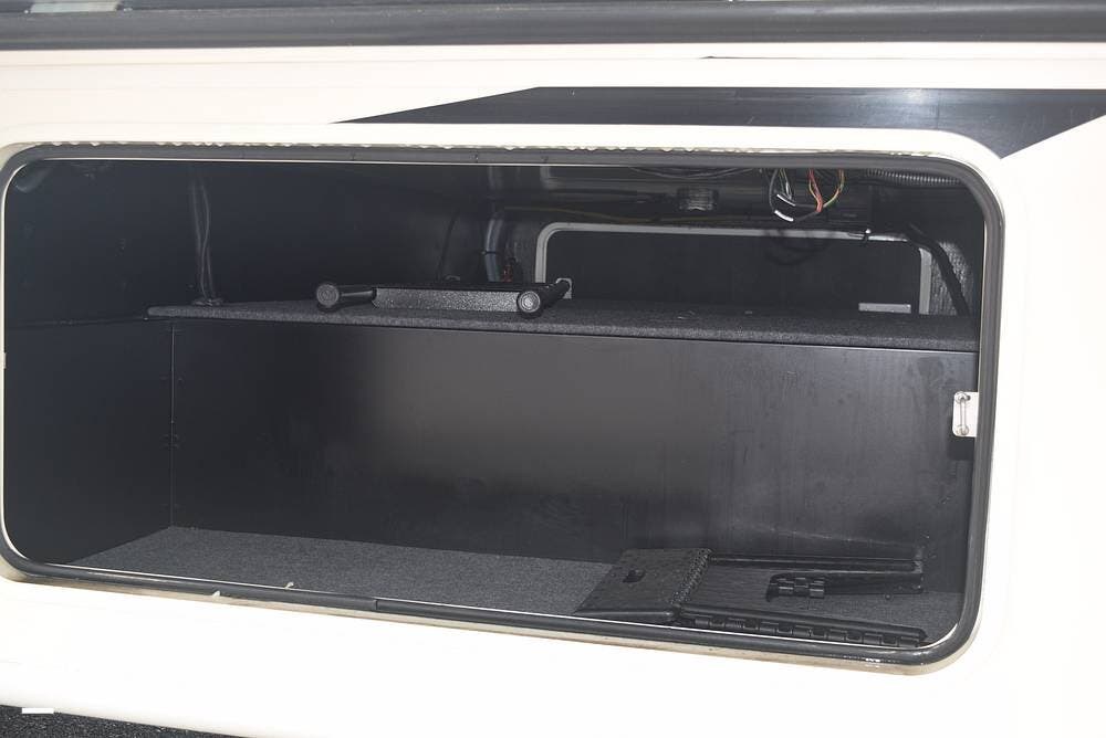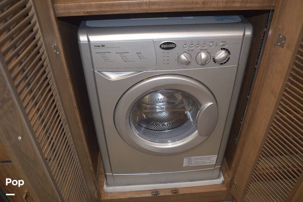 This spacious coach offers all the comforts of home, including a washer/dryer combo, perfect for long trips, and an outdoor entertainment setup with exterior TV and speakers, making it easy to relax and enjoy the great outdoors.
