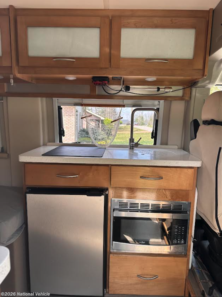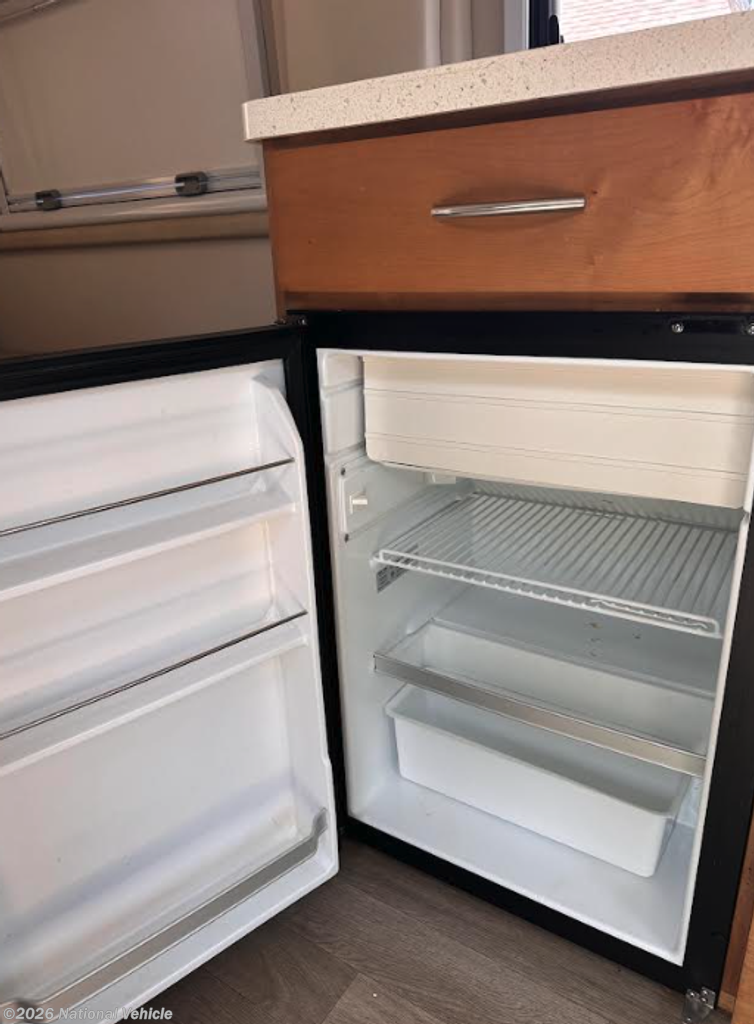 The kitchen is well-equipped for life on the road, featuring a single-burner induction cooktop, microwave, refrigerator, stainless steel sink, and solid-surface countertops. With ample storage and thoughtful design, preparing meals is simple whether you?re cooking indoors or enjoying the outdoors.