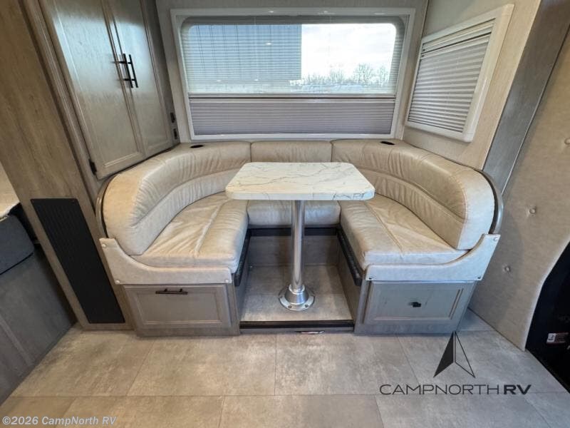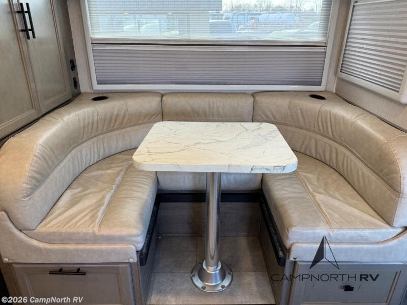 This Prism Elite Class C diesel motorhome has a unique slide-in-slide entertainment center that has a fireplace along with it! This will come in handy for saving space in the main living area whenever you are not using the entertainment center. You can also create a semi-private bedroom in this coach by using the privacy curtain, and the full bathroom is going to make it easy to stay clean while you are away from home. The U-shaped dinette is a multi-functional piece of furniture that allows you to enjoy a meal or a night of rest, and you can also use the 45" x 80" bunk above the cab for additional sleeping space.