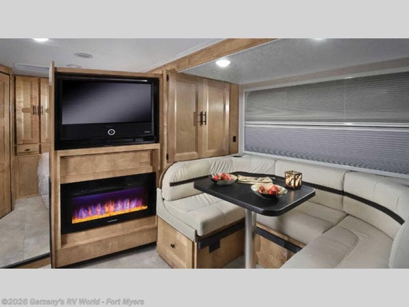 This Prism Elite Class C diesel motorhome has a unique slide-in-slide entertainment center that has a fireplace along with it! This will come in handy for saving space in the main living area whenever you are not using the entertainment center. You can also create a semi-private bedroom in this coach by using the privacy curtain, and the full bathroom is going to make it easy to stay clean while you are away from home. The U-shaped dinette is a multi-functional piece of furniture that allows you to enjoy a meal or a night of rest, and you can also use the 45" x 80" bunk above the cab for additional sleeping space.