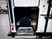 This Spirit Ultra Lite travel trailer works for a couple or a family since it has a private bedroom including a queen-size bed and clothing storage and a large slide in the main living area with furniture that doubles as sleeping space for extra campers. The kiddos can play with the dog on the floor while you and your spouse relax on the sofa or at the U-shaped dinette. Prepare dinner indoors on the three-burner cooktop, or use the outside kitchen if the weather is nice. After a day of hiking, you'll want nothing more than to clean up before bed, and the full rear bath will allow you to do just that. This model also includes a pet center, which is a convenient food and water storage area for your favorite animal.
