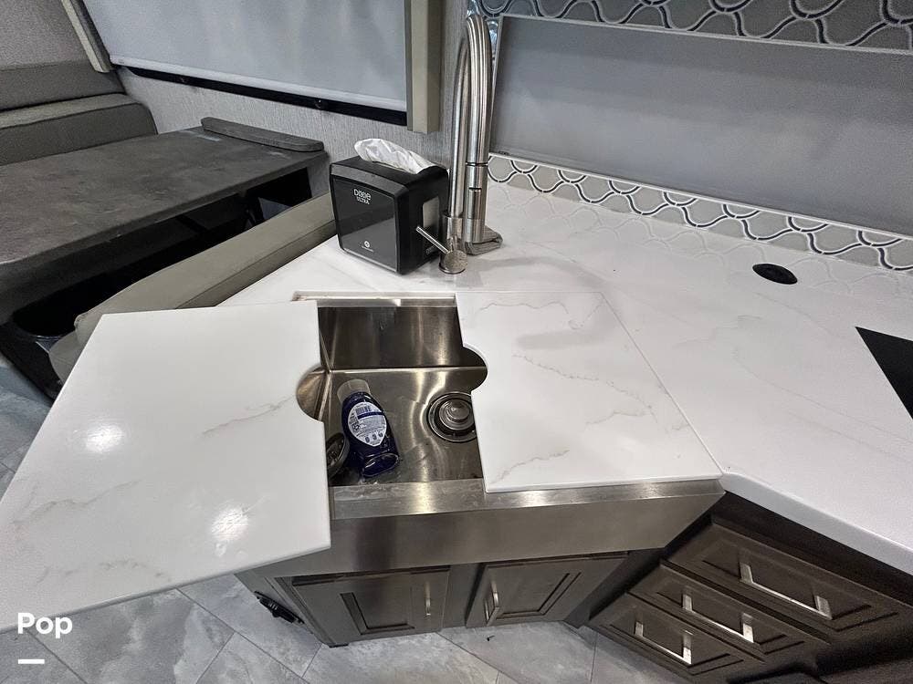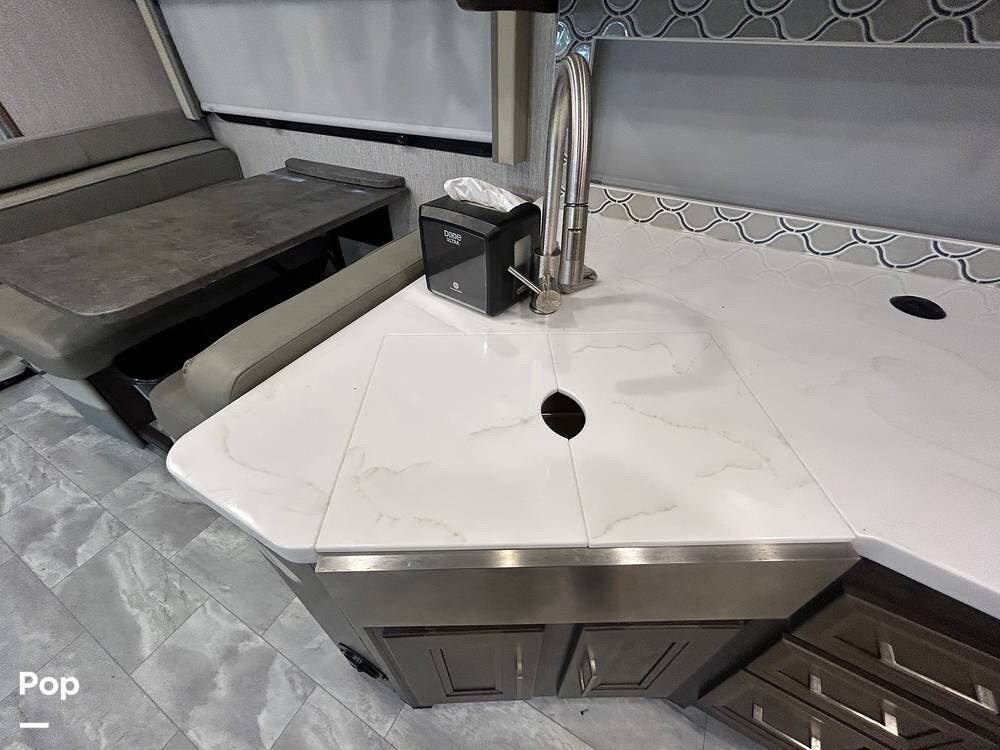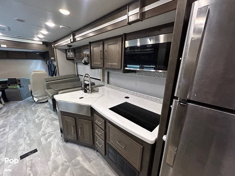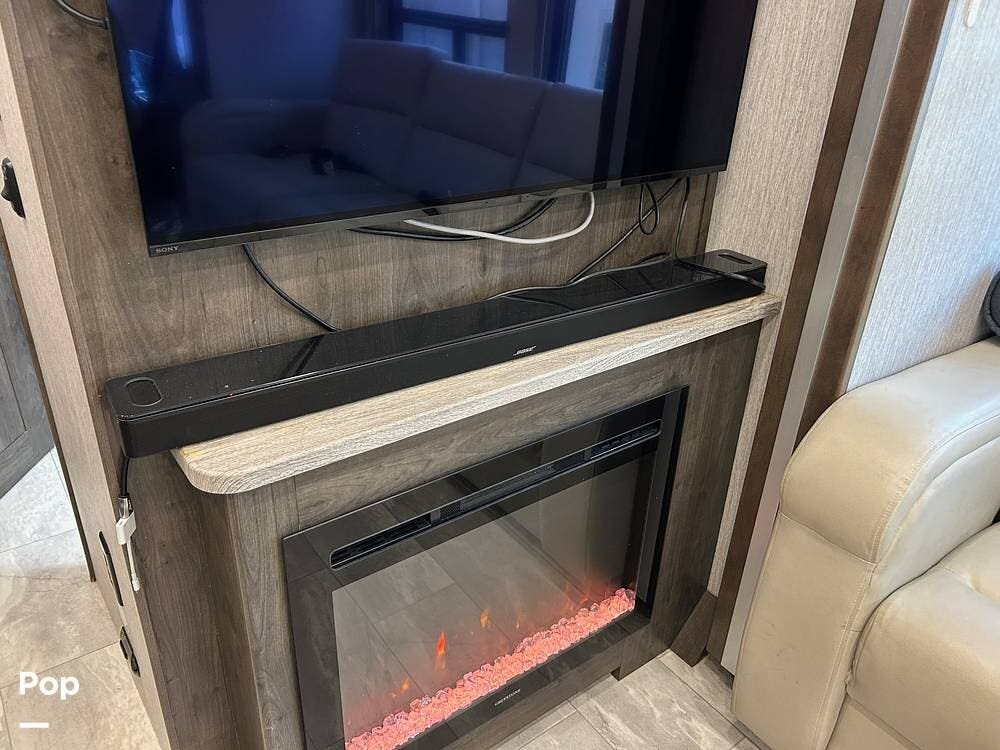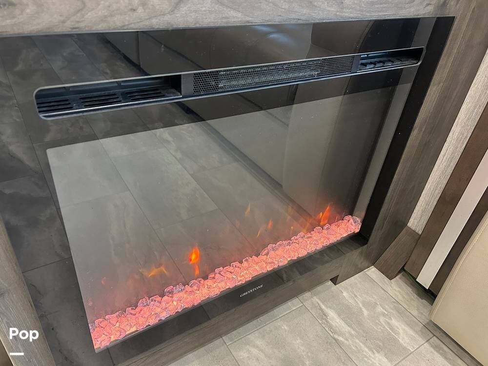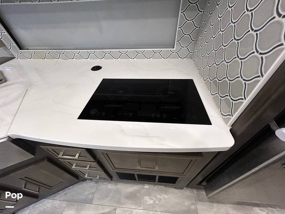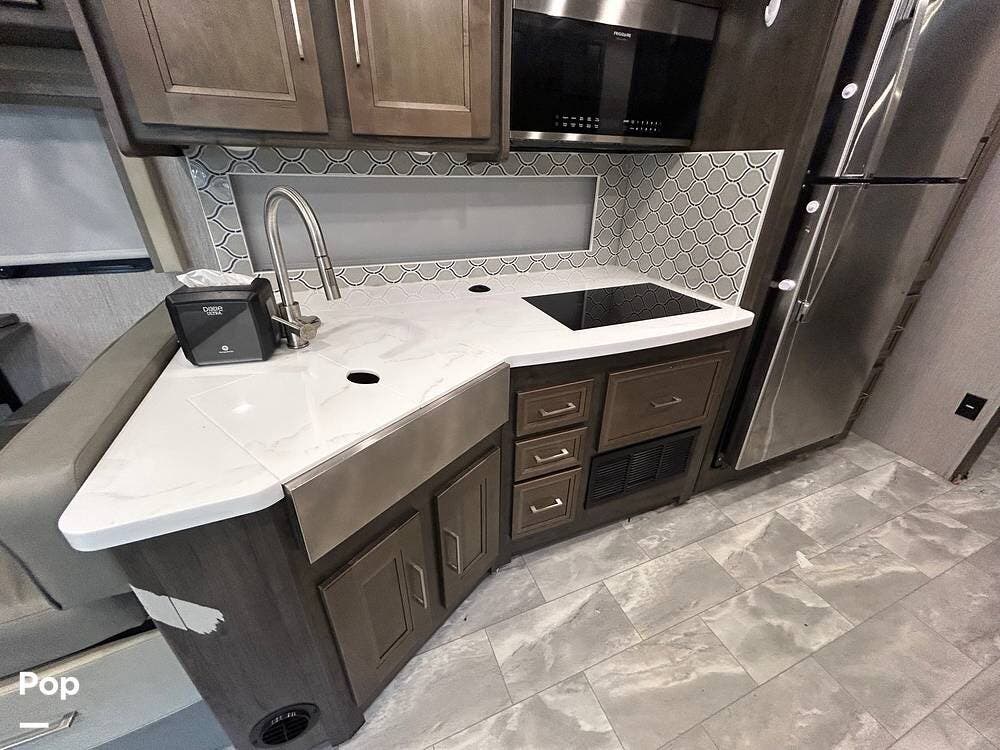 Comes with a spacious four slide-outs. Has an expansive living area with a 40" LED TV, a fireplace, and a 78" sofa bed for cozy gatherings or extra sleeping space. Features a residential refrigerator, two-burner induction cooktop, stainless steel farm sink, and solid surface countertops.