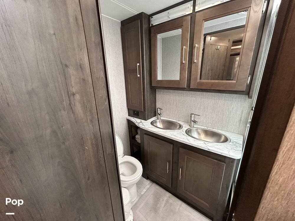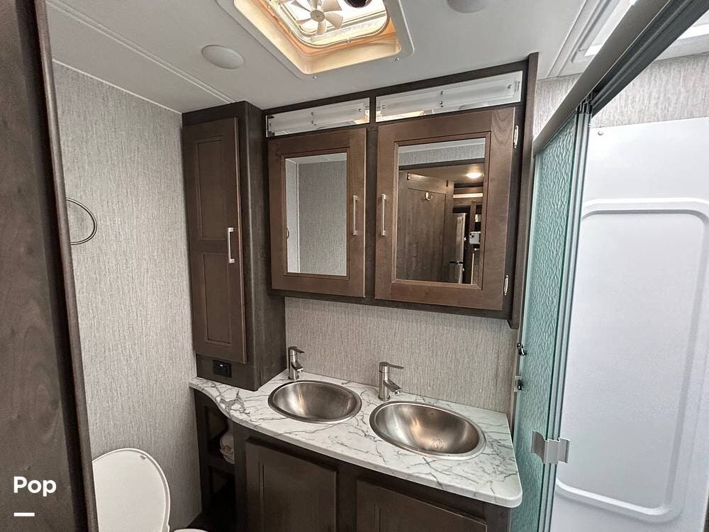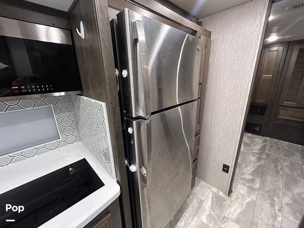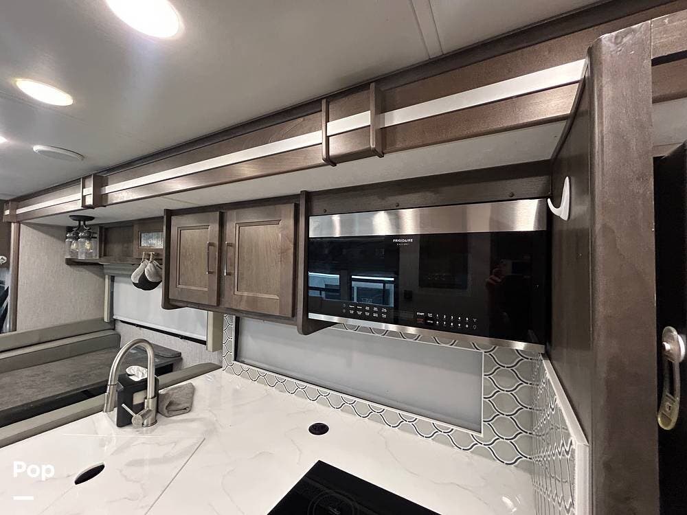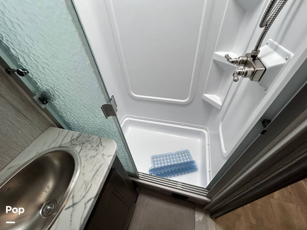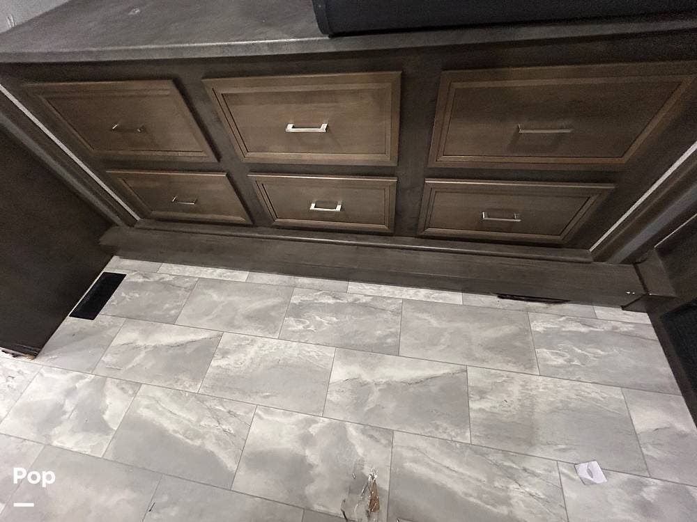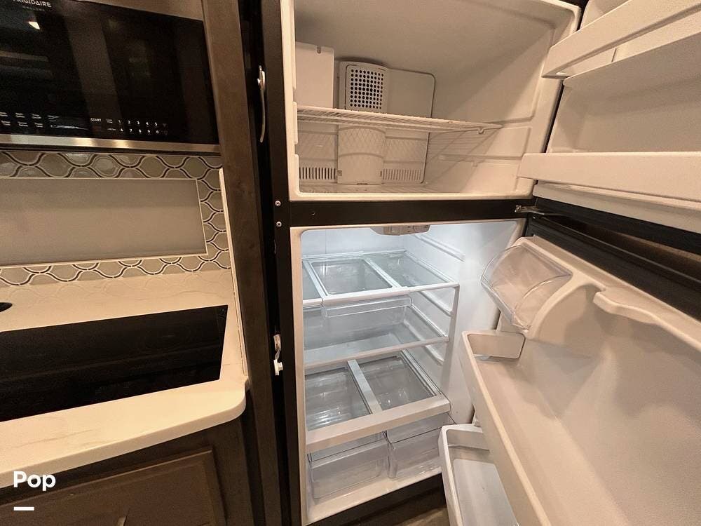Comes with a spacious four slide-outs. Has an expansive living area with a 40" LED TV, a fireplace, and a 78" sofa bed for cozy gatherings or extra sleeping space. Features a residential refrigerator, two-burner induction cooktop, stainless steel farm sink, and solid surface countertops.