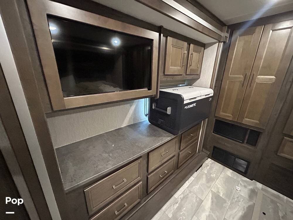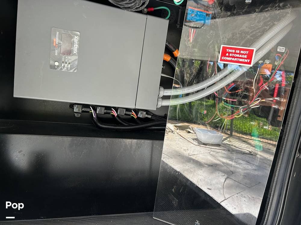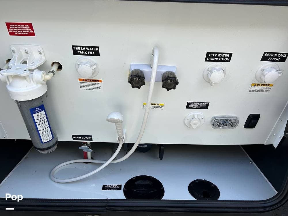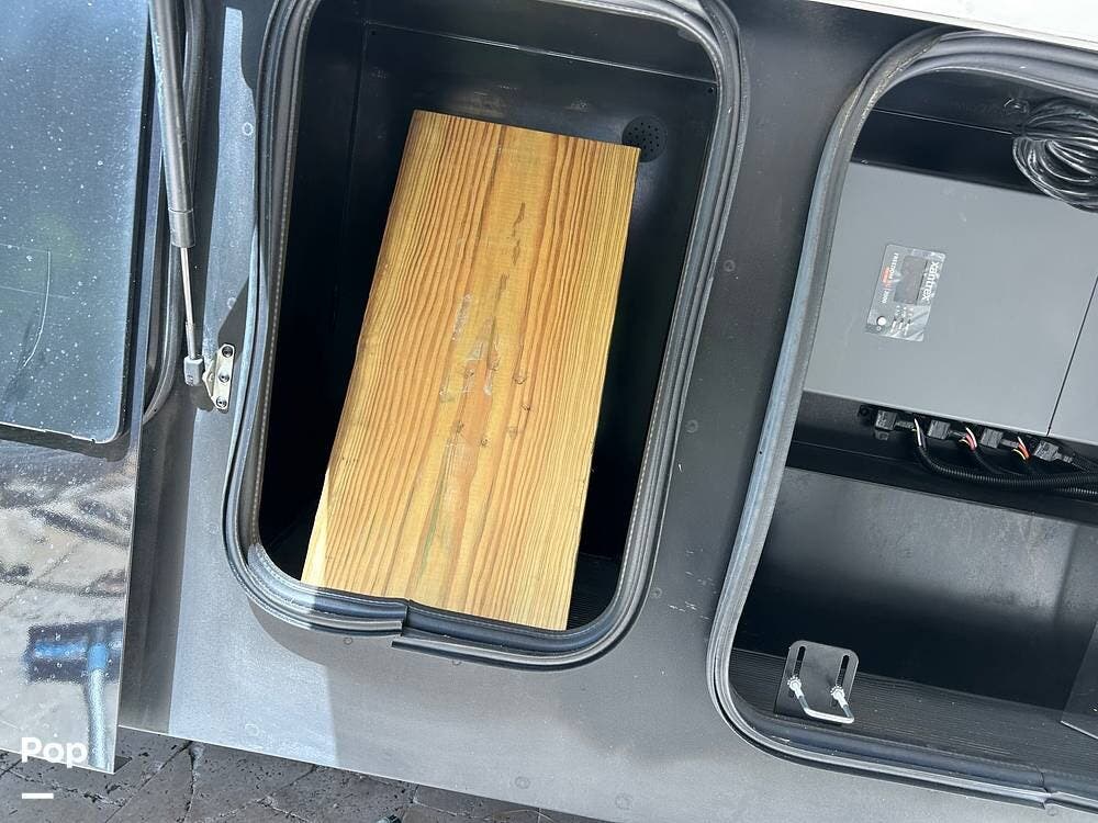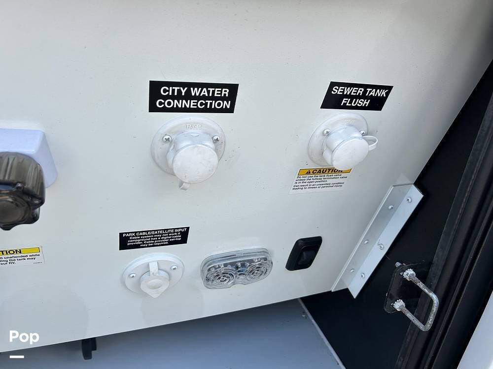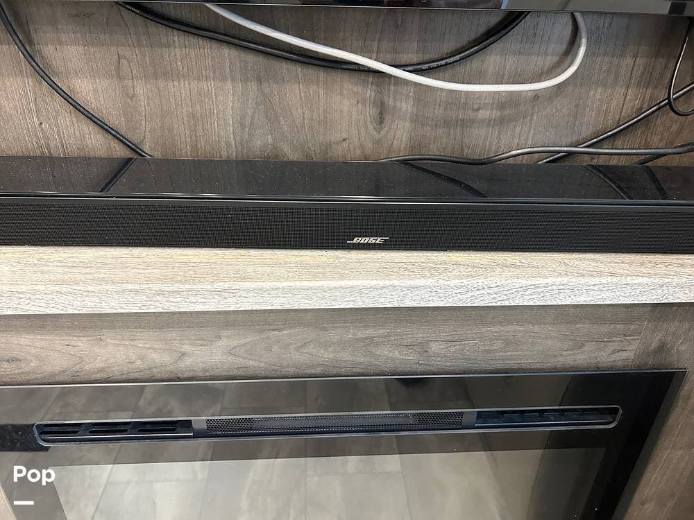 Has an outdoor entertainment area that includes a 40" exterior LED TV, Bluetooth speakers, and a power awning for relaxing under the stars. Comes with solar panels for battery functions while off the grid.