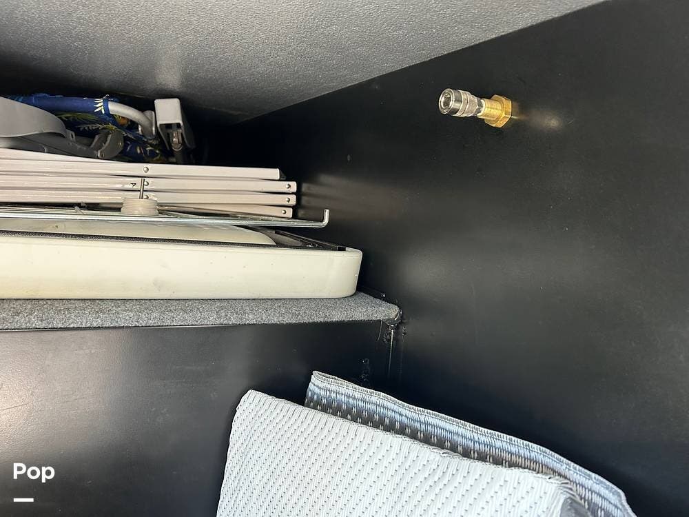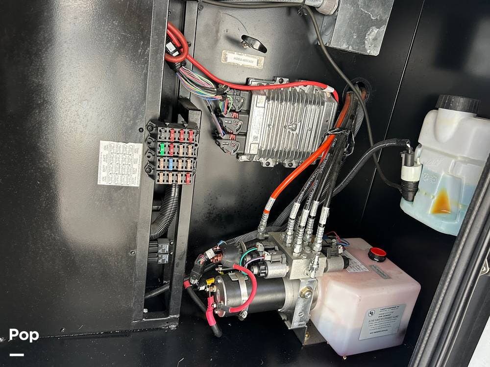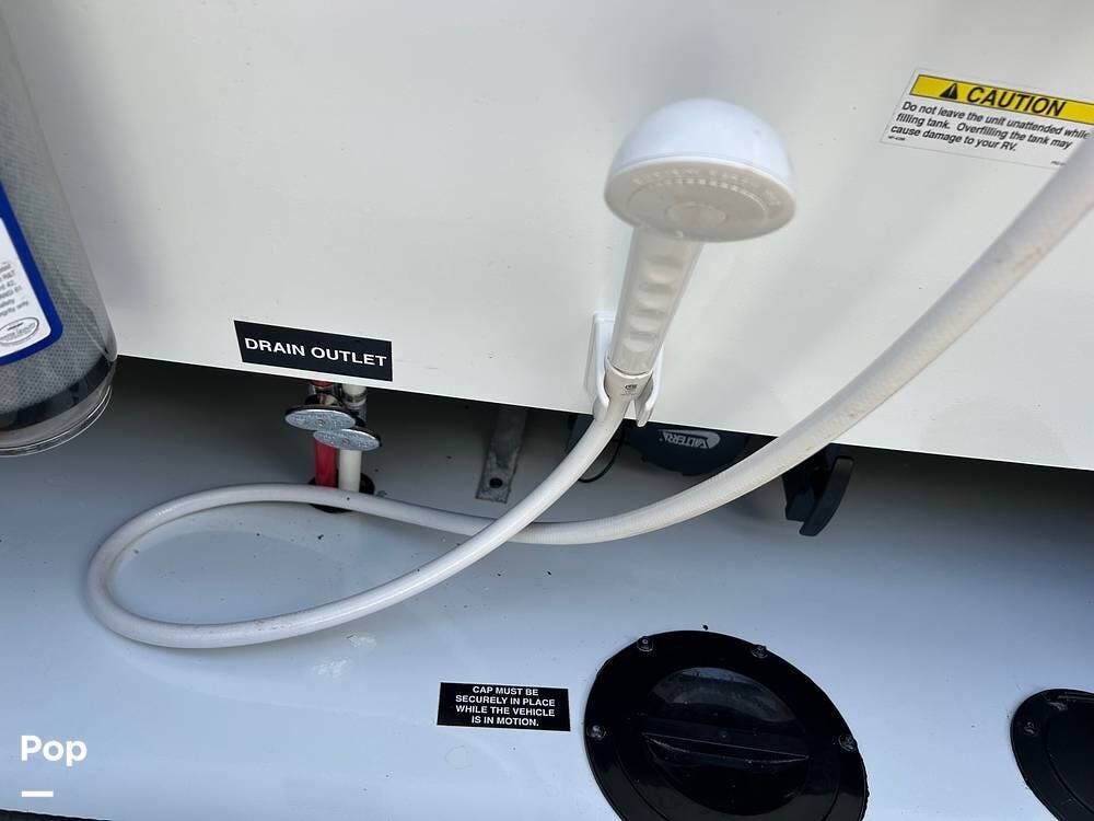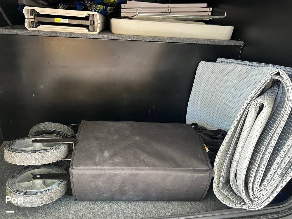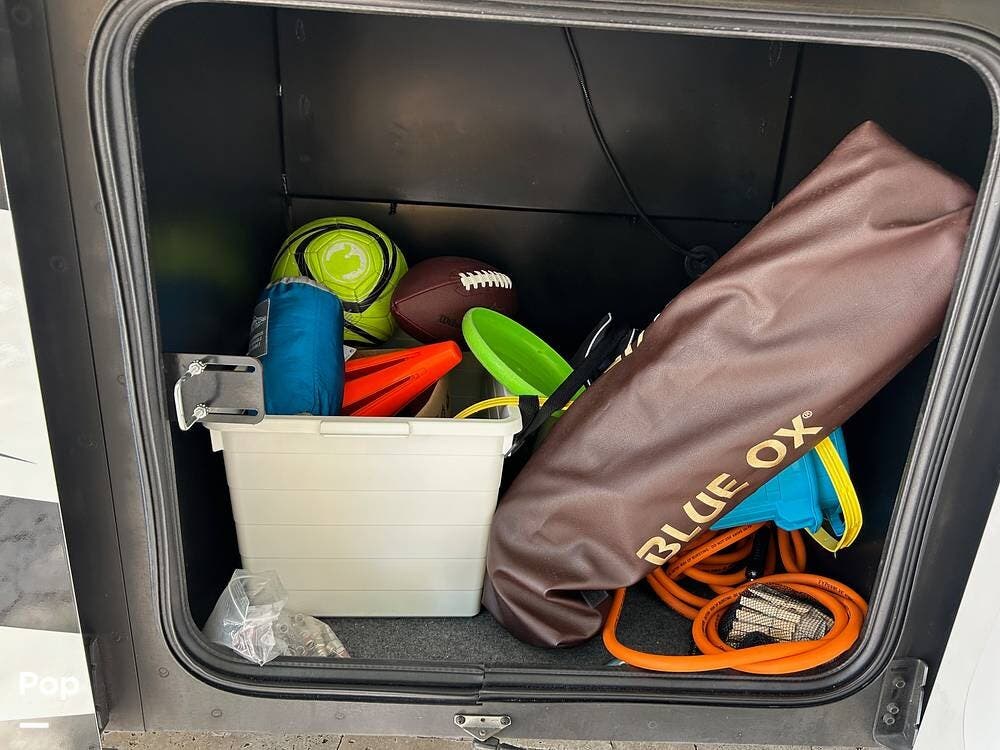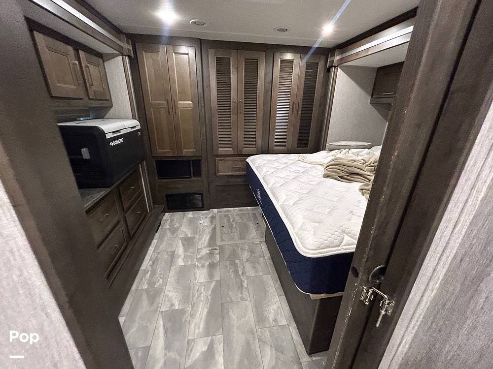 Has an outdoor entertainment area that includes a 40" exterior LED TV, Bluetooth speakers, and a power awning for relaxing under the stars. Comes with solar panels for battery functions while off the grid.