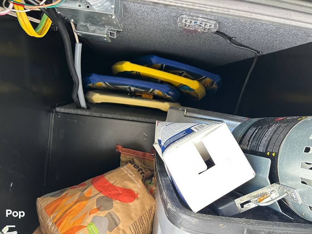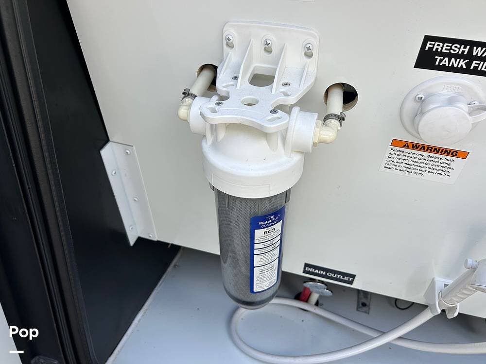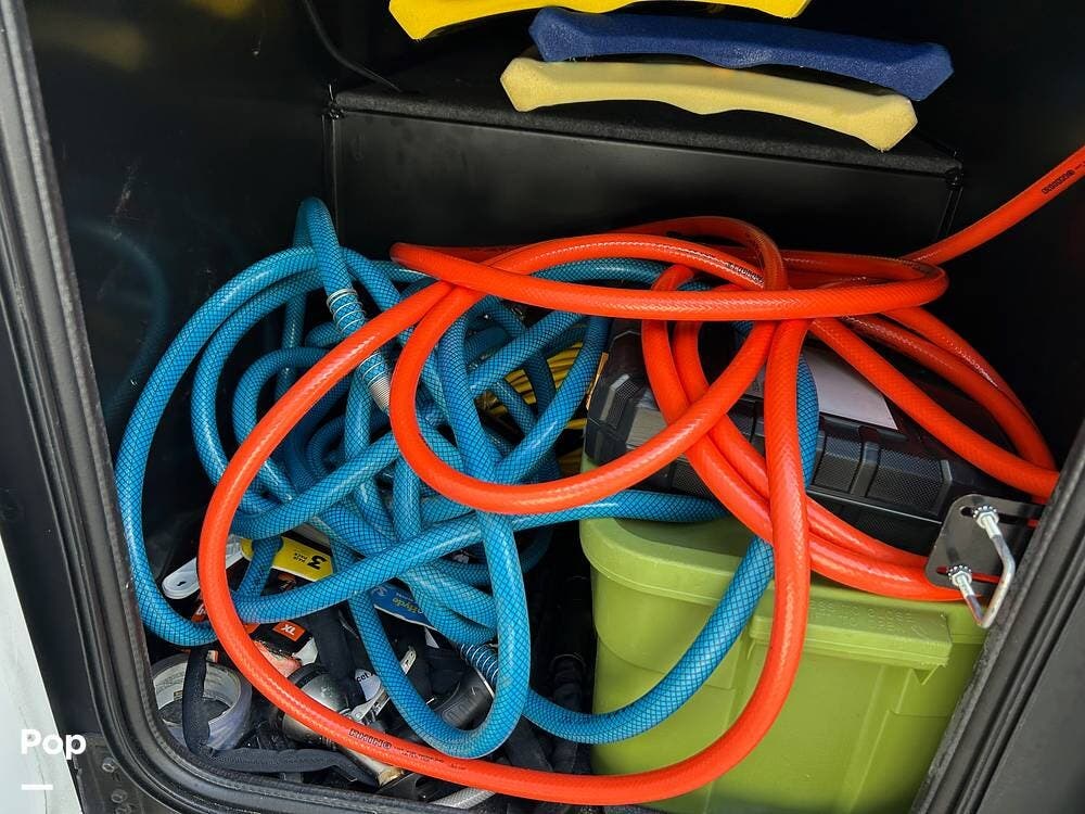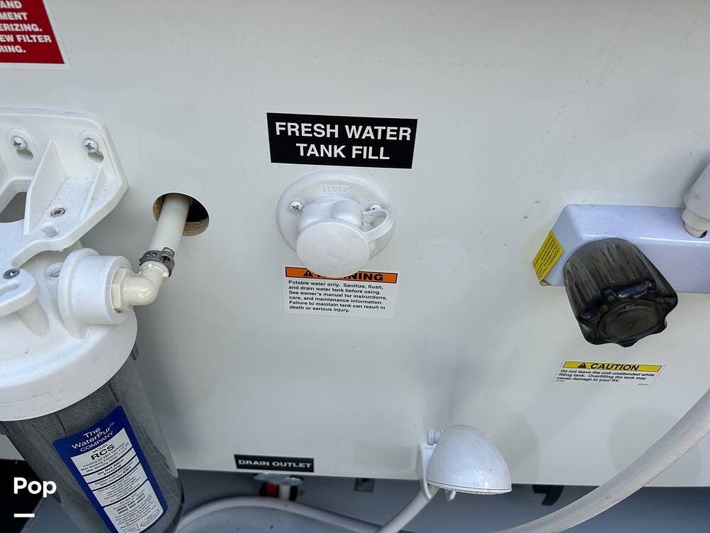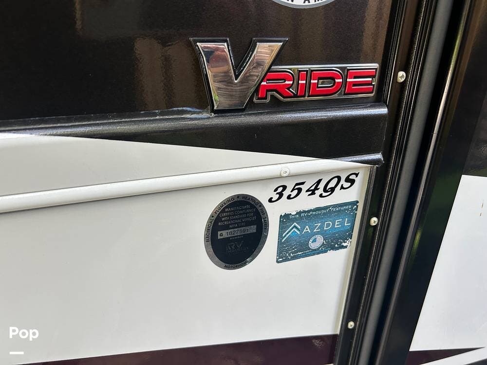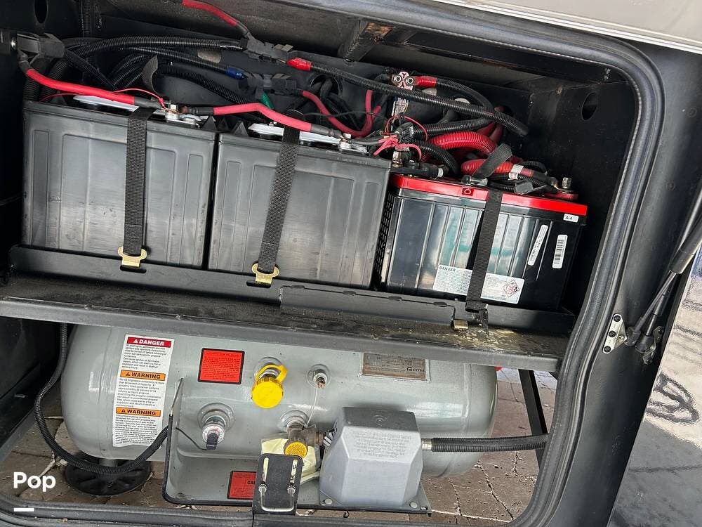 Has an outdoor entertainment area that includes a 40" exterior LED TV, Bluetooth speakers, and a power awning for relaxing under the stars. Comes with solar panels for battery functions while off the grid.