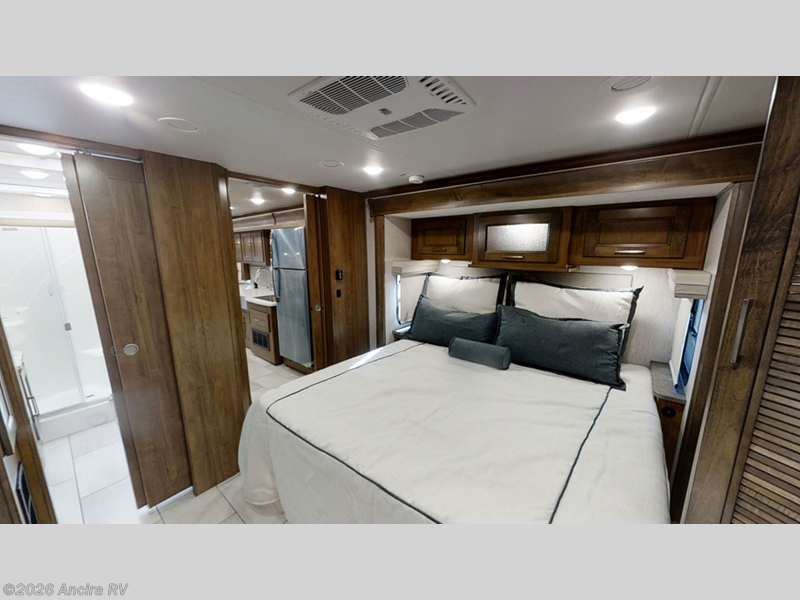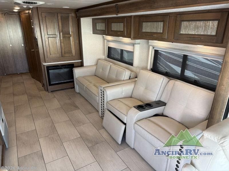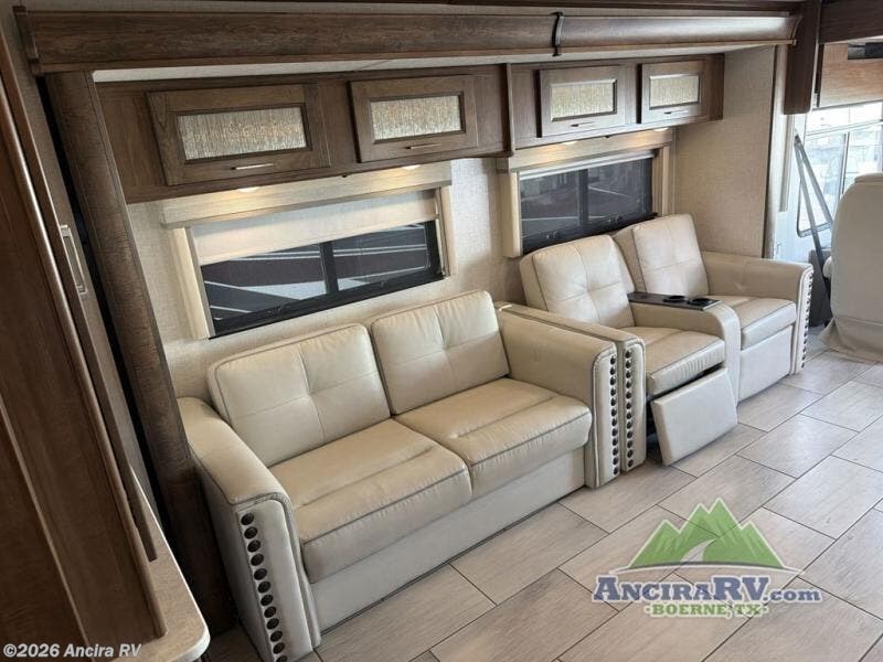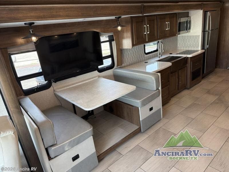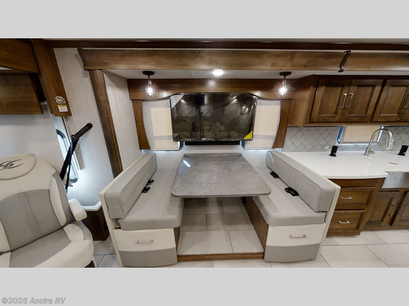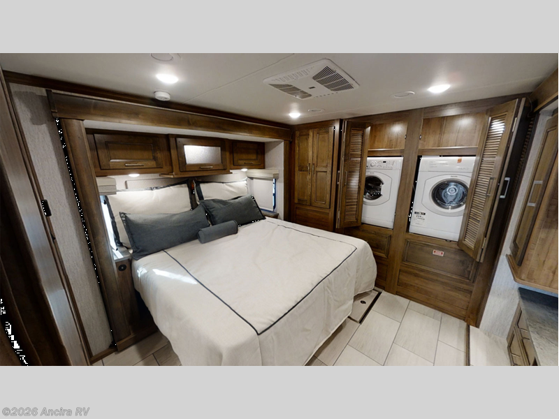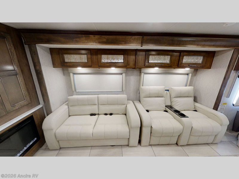 Enjoy a luxurious home on wheels with this motorhome! It features a rear private bedroom with a king bed slide that has a CPAP station above it and across from a LED TV with wardrobes on either side, plus a rear wardrobe that is prepped to add an optional washer and dryer, a linen closet with a hamper to keep your dirty clothes out of the way, and an entrance into the dual entry bathroom. The bathroom also has a dual sink vanity for two to get ready at once and a 38" x 30" deluxe fiberglass shower with a textured glass door to freshen up in each morning. Keep your bellies full with the fully appointed kitchen and enjoy your meals at the 42" x 82" booth dinette with a 50" LED TV above it. There is even an outside entertainment center covered by a 17' power awning. Relax in the evening on either the 38" x 68" visionary sofa or the 68" theater seating, plus there is a 47" x 81" drop down bunk over cab for an extra sleeping space!