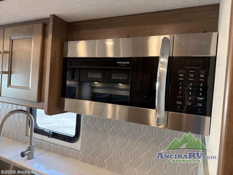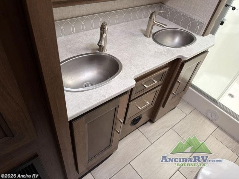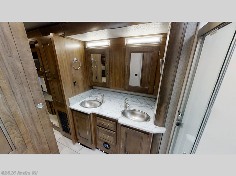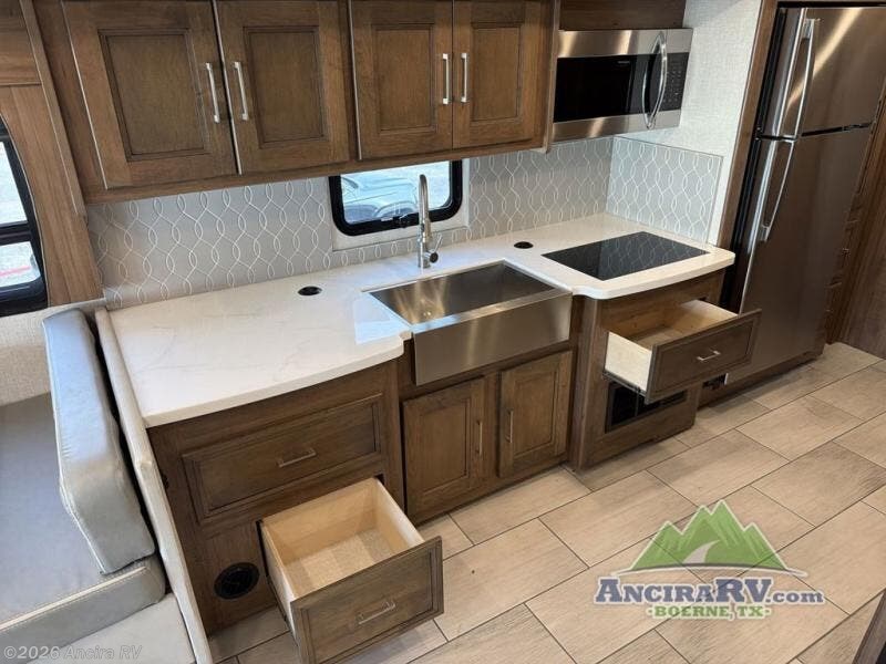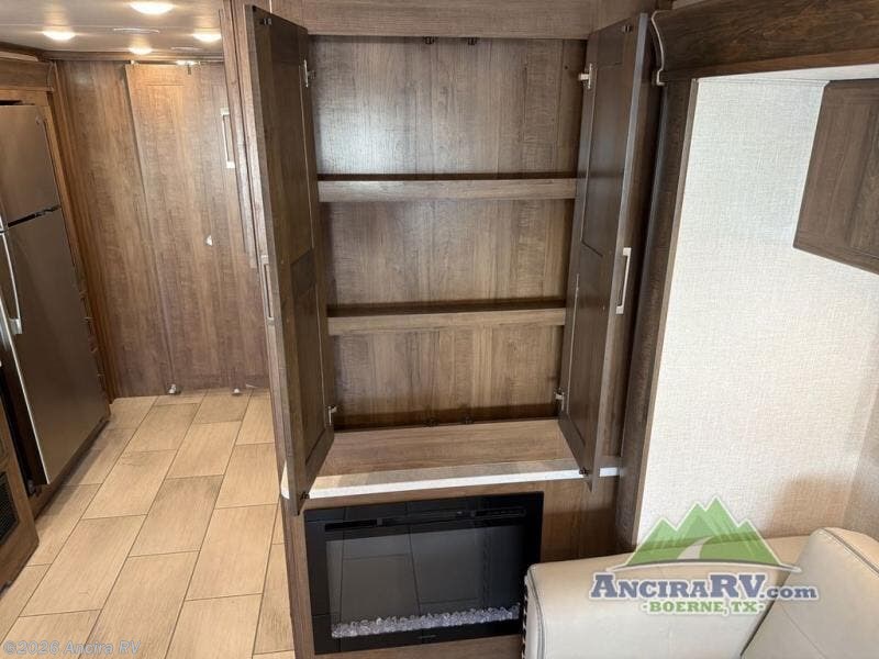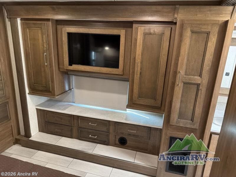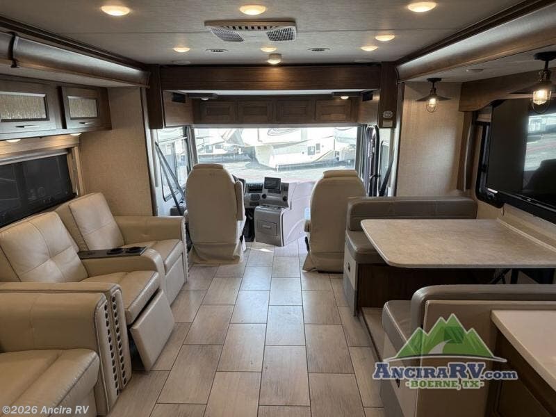 Enjoy a luxurious home on wheels with this motorhome! It features a rear private bedroom with a king bed slide that has a CPAP station above it and across from a LED TV with wardrobes on either side, plus a rear wardrobe that is prepped to add an optional washer and dryer, a linen closet with a hamper to keep your dirty clothes out of the way, and an entrance into the dual entry bathroom. The bathroom also has a dual sink vanity for two to get ready at once and a 38" x 30" deluxe fiberglass shower with a textured glass door to freshen up in each morning. Keep your bellies full with the fully appointed kitchen and enjoy your meals at the 42" x 82" booth dinette with a 50" LED TV above it. There is even an outside entertainment center covered by a 17' power awning. Relax in the evening on either the 38" x 68" visionary sofa or the 68" theater seating, plus there is a 47" x 81" drop down bunk over cab for an extra sleeping space!