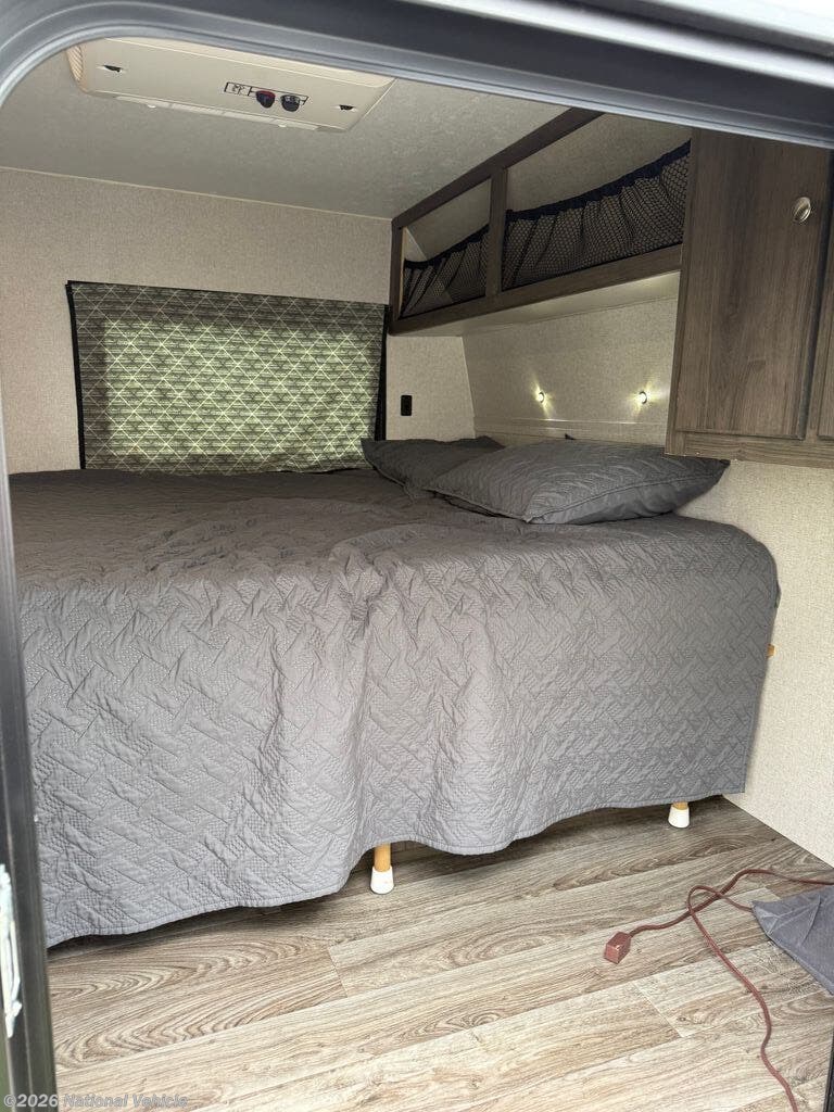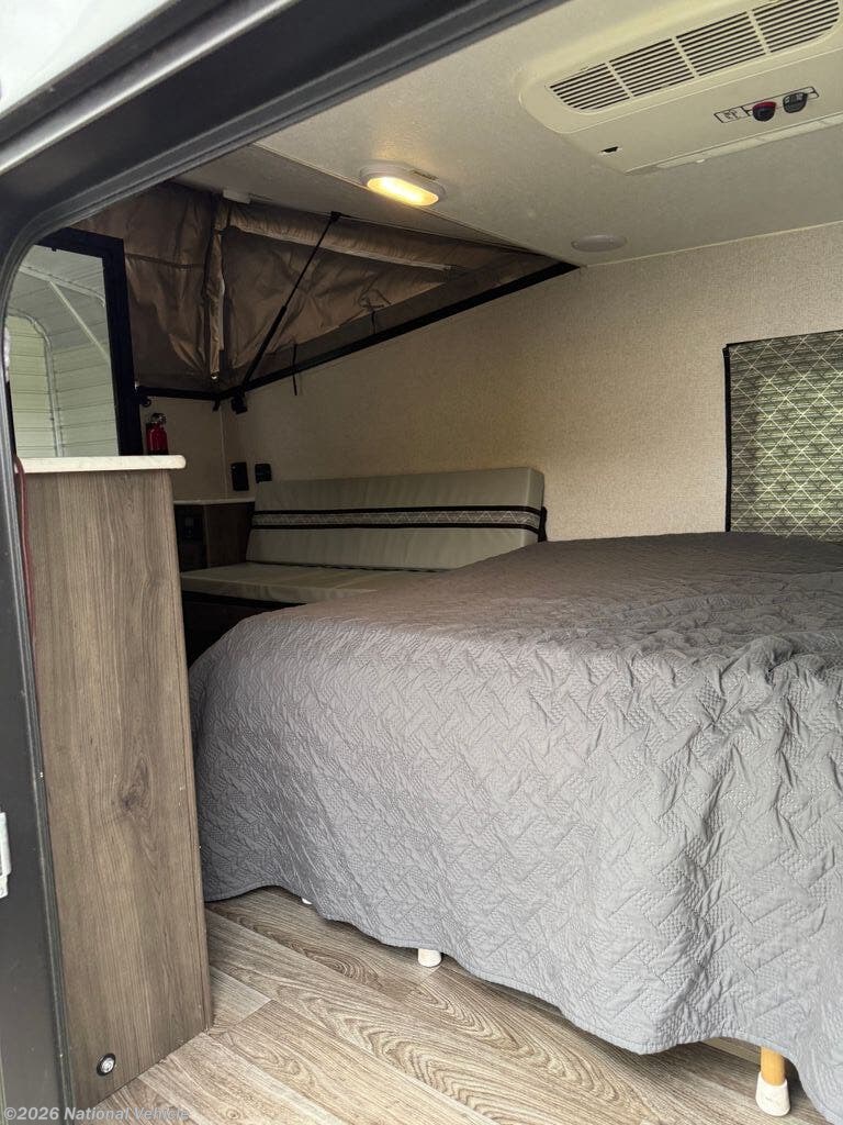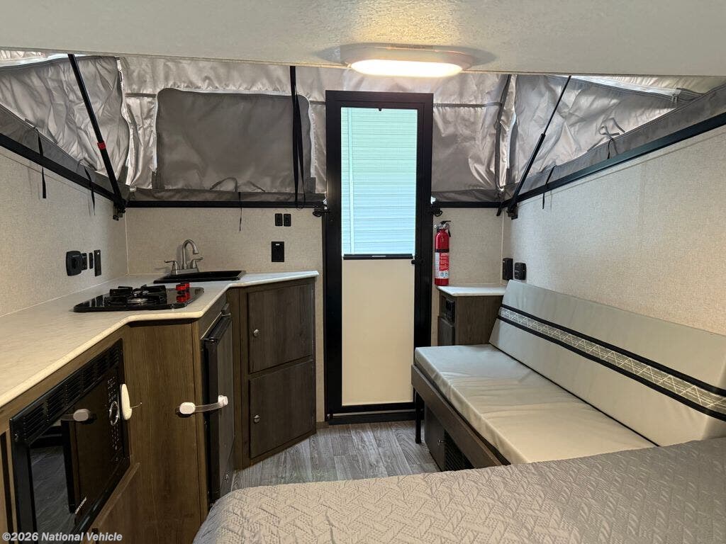 Fully Loaded for Comfort - Comes equipped with a cozy 60" x 74" bed, roof-mounted A/C, 12V fridge, microwave, and a 2-burner cooktop for meals on the go.