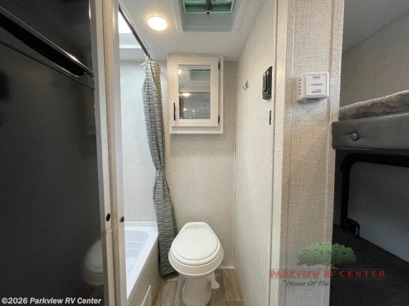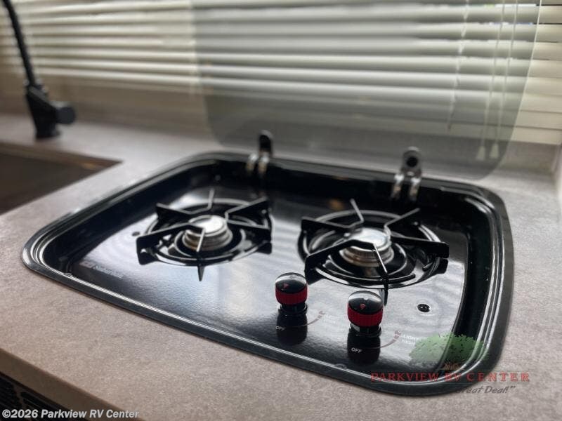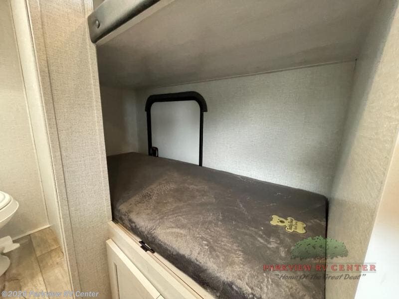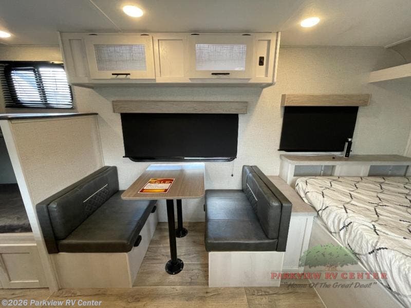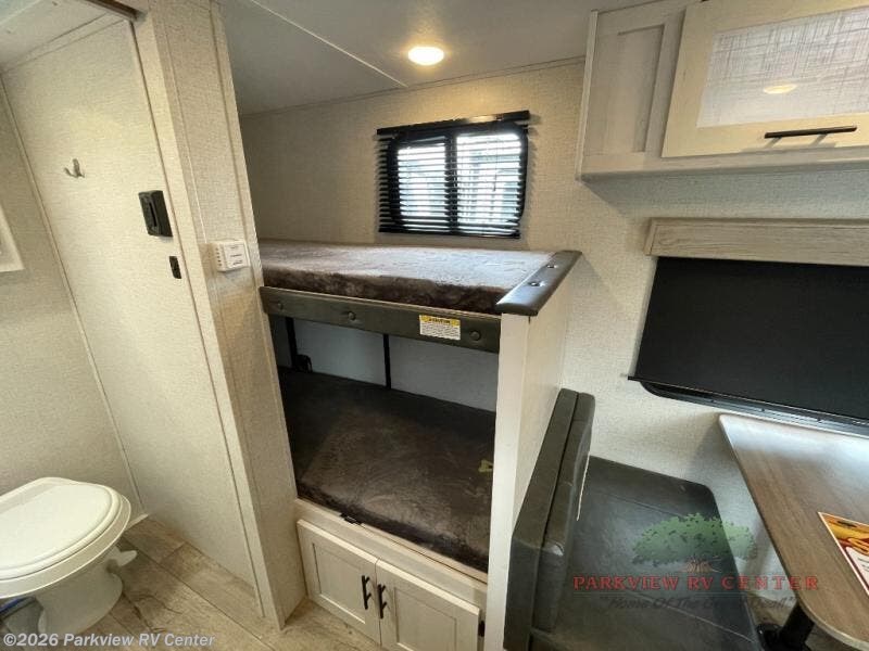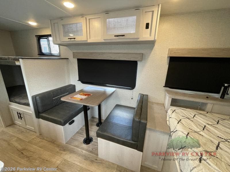 The whole family can go camping in this travel trailer with the set of bunk beds! There is also a front queen bed and a booth dinette that can transform into an extra sleeping space when you're not using it to enjoy a meal or play a card game. Speaking of meals, you can prepare delicious home cooked meals with the two burner cooktop and keep your perishables fresh in the 10 cu. ft. refrigerator. The rear corner bathroom lets you start each morning feeling clean and fresh with a skylight above the shower to let in some natural lighting while you get ready!