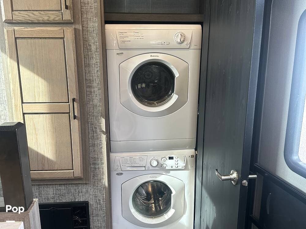 The dining table is expandable and includes four chairs. The living area also includes a ceiling fan, deco lighting, and a utility closet with a washer and dryer, so no more trips to the campground laundromat.