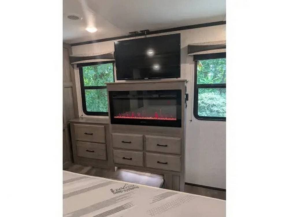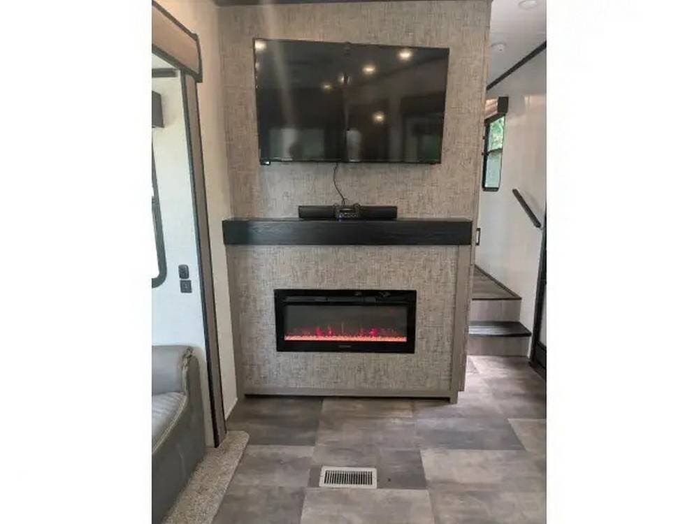 Step inside and you'll immediately notice the spacious, open floor plan that feels more like a luxury apartment than an RV. The living area features opposing slide-outs, plush theater seating, an entertainment center with a large TV, and an electric fireplace for cozy evenings.